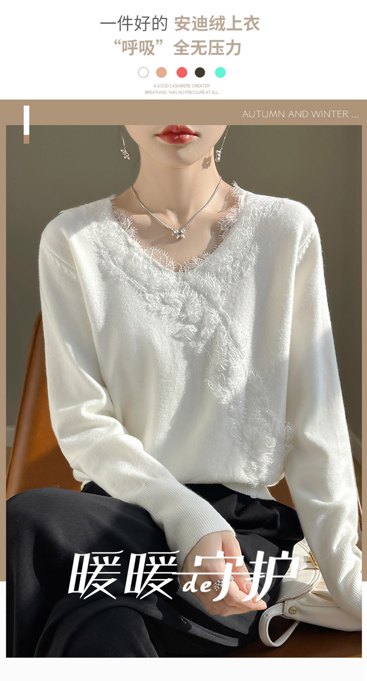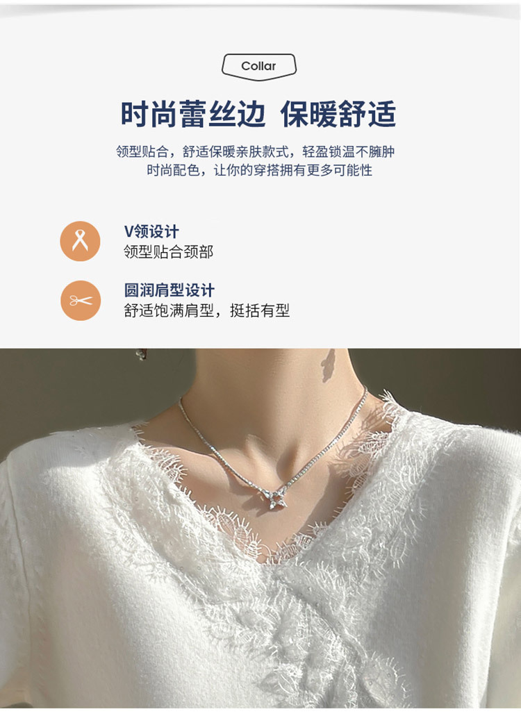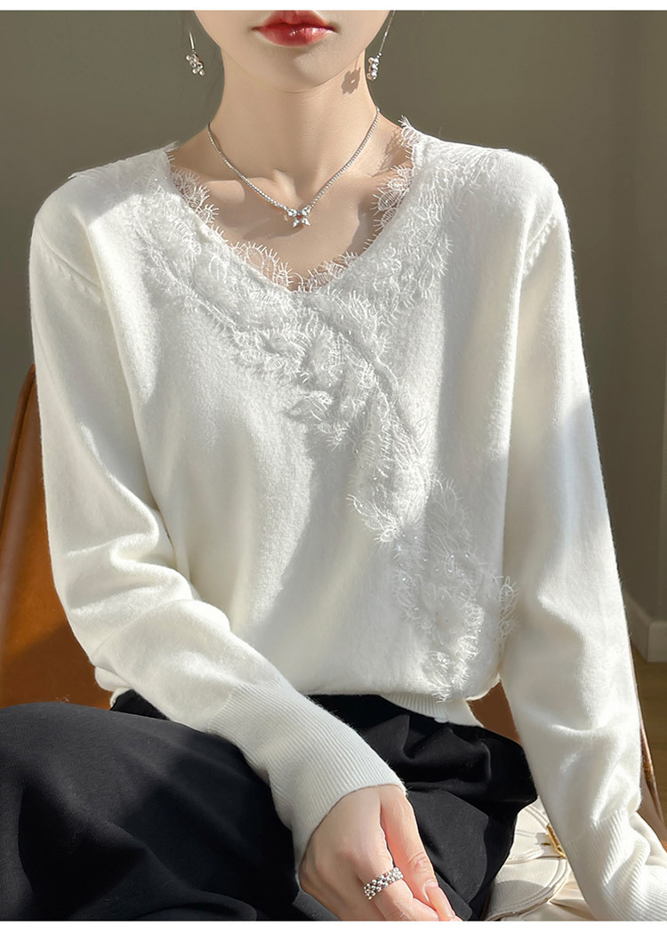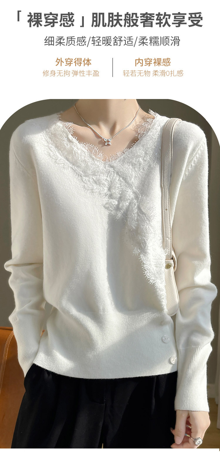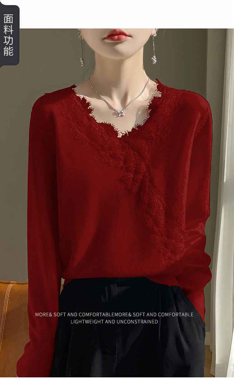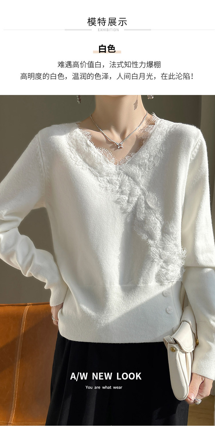 厂家蕾丝拼接V领长袖针织衫女上衣季新款洋气内搭打底衫毛衣