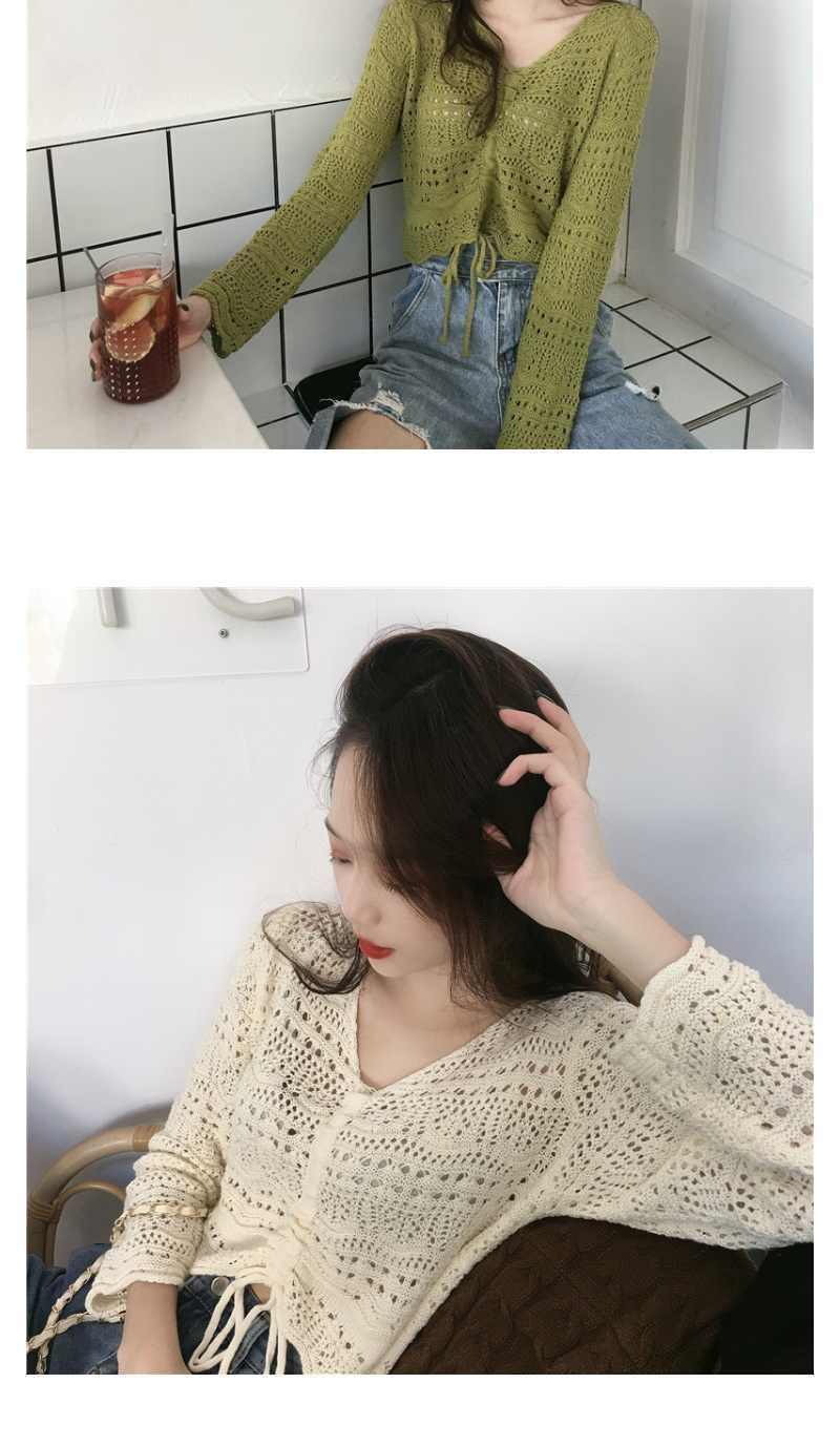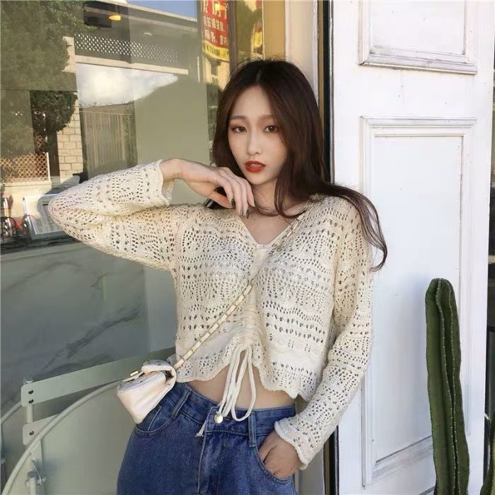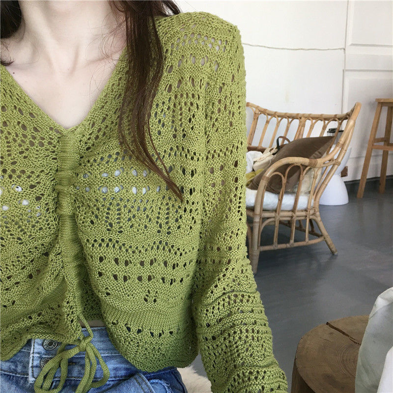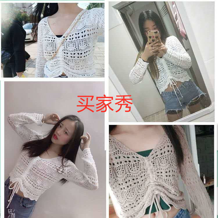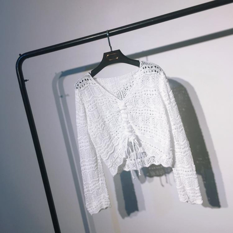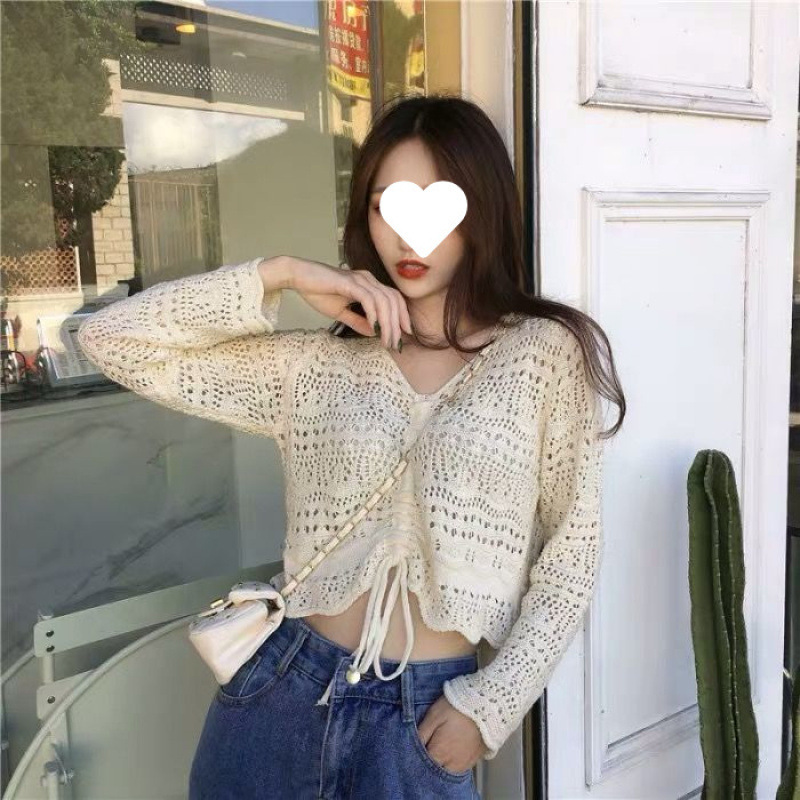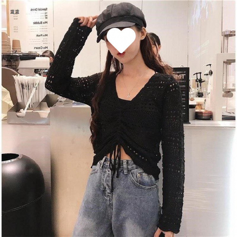 2025 봄과 여름 느슨한 드로우 스트링 스트랩 스웨터 할로우 아웃 여성 짧은 사이버 연예인 탑 섹시한 얇은 블라우스 탑 트렌디스토어 가기