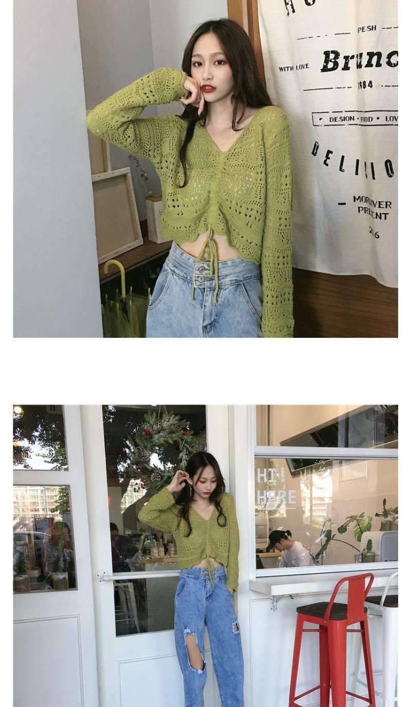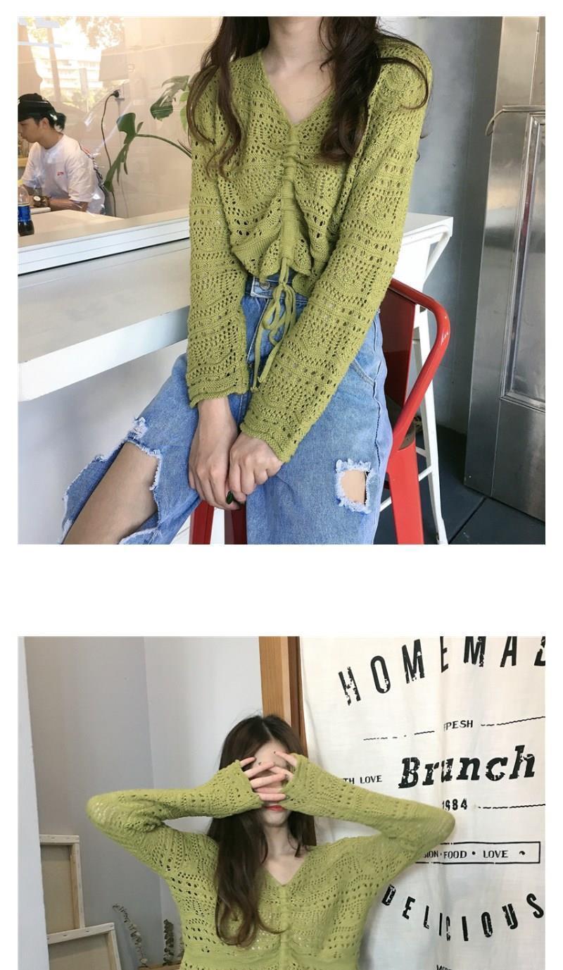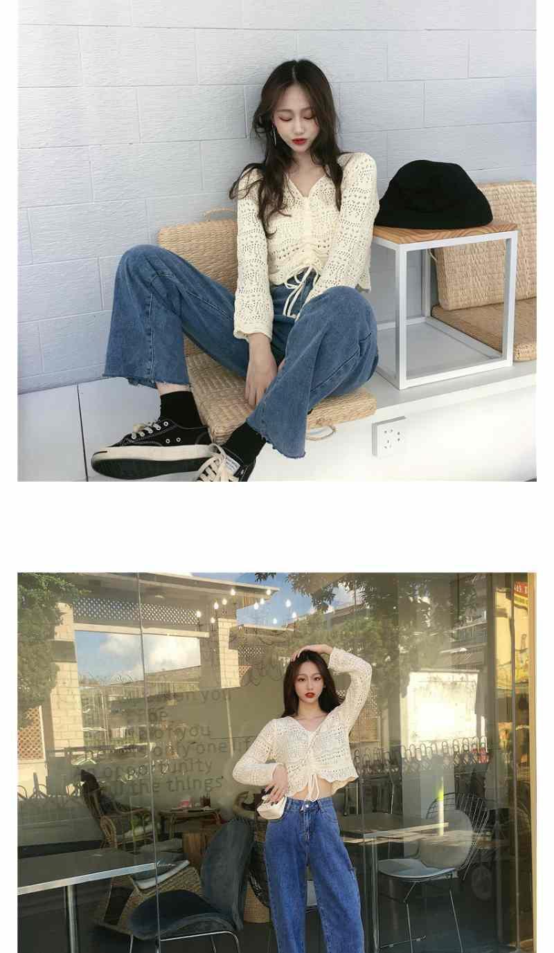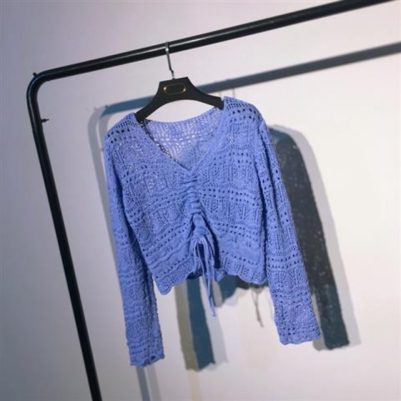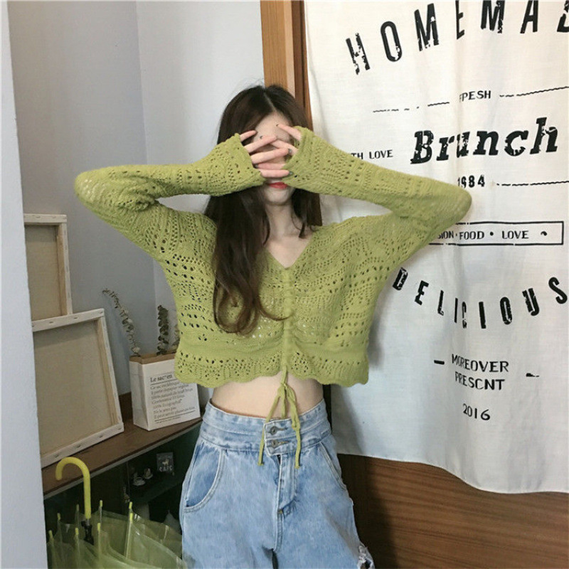 2025 봄과 여름 느슨한 드로우 스트링 스트랩 스웨터 할로우 아웃 여성 짧은 사이버 연예인 탑 섹시한 얇은 블라우스 탑 트렌디스토어 가기