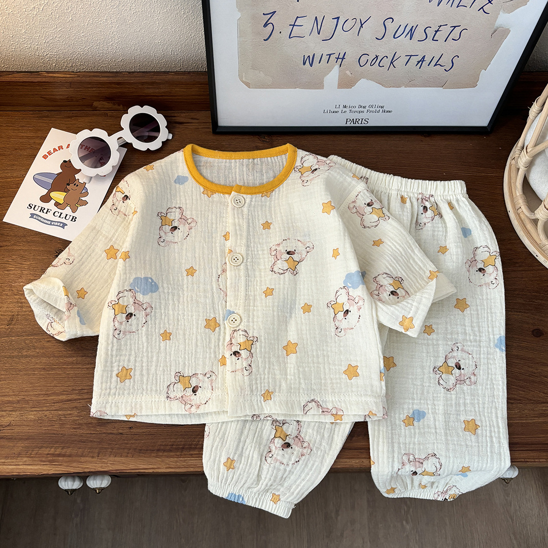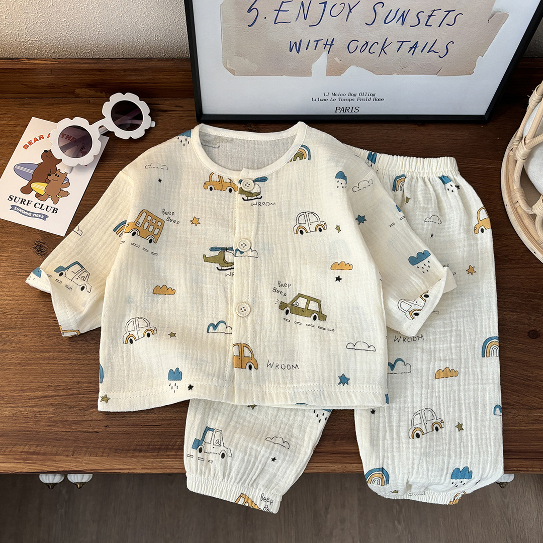 어린이용 얇은 이중 순면 거즈 잠옷, 여아용 홈웨어, 남아용 긴팔 랜턴 팬츠 세트, 땀 흡수스토어 가기