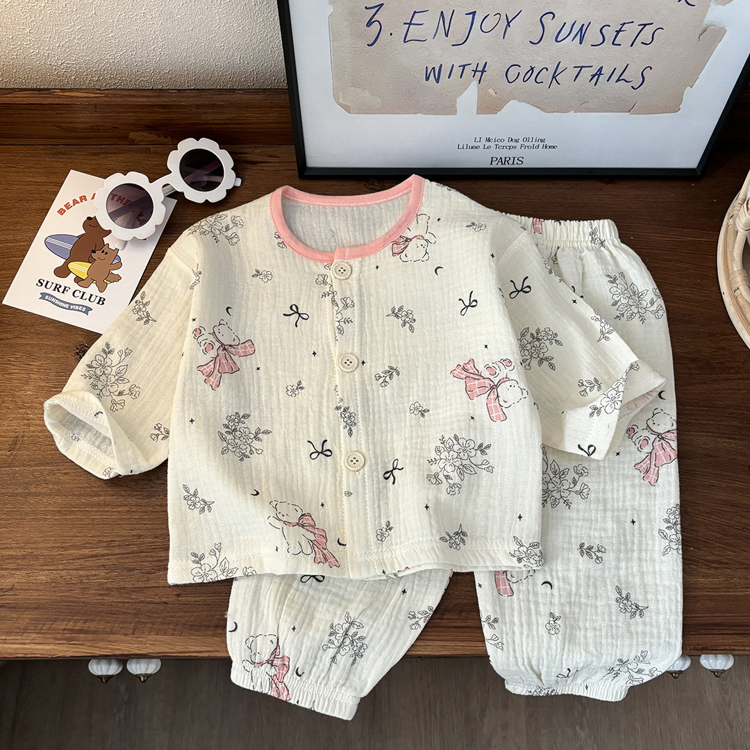 어린이용 얇은 이중 순면 거즈 잠옷, 여아용 홈웨어, 남아용 긴팔 랜턴 팬츠 세트, 땀 흡수