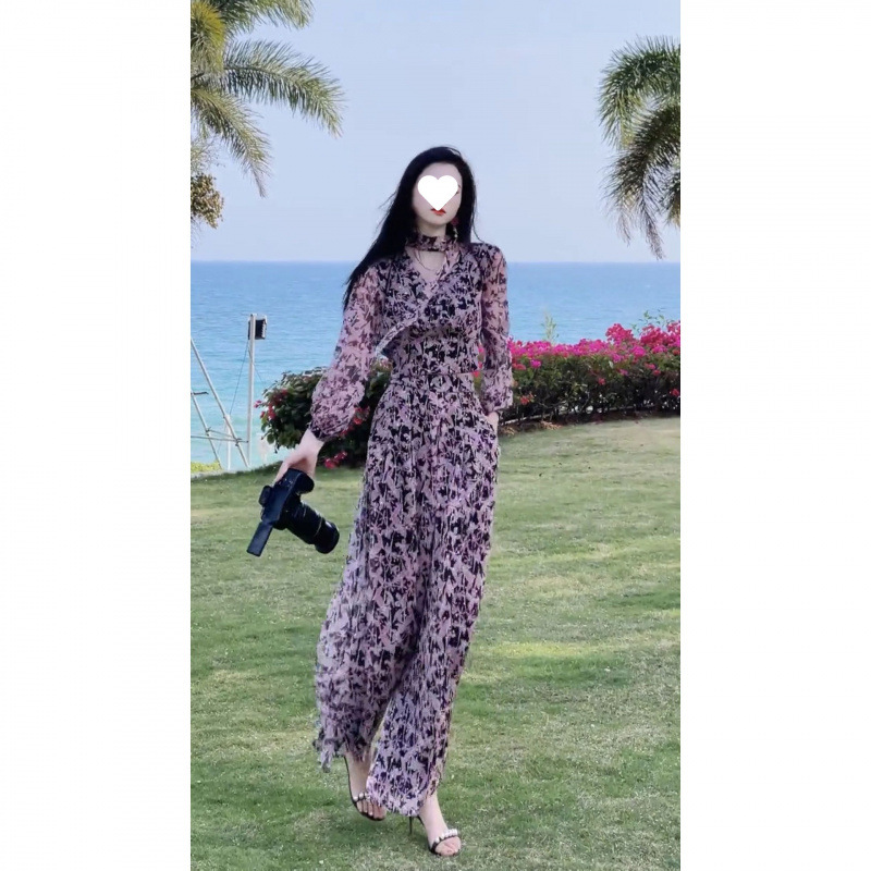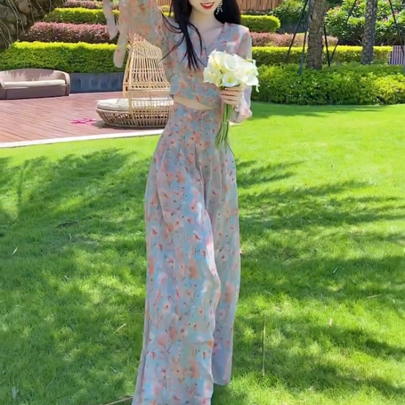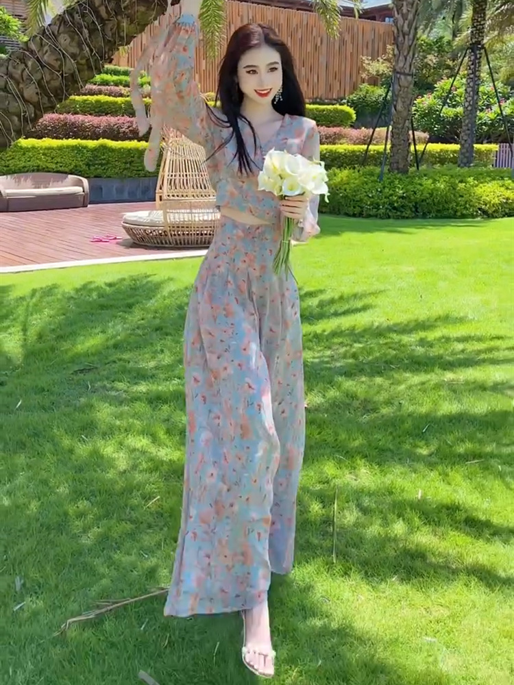 Yujie 팬 기질 휴가 스타일 꽃 탑 넓은 다리 바지 투피스 2025 이른 봄 새로운 튀김 거리 틈새 세트