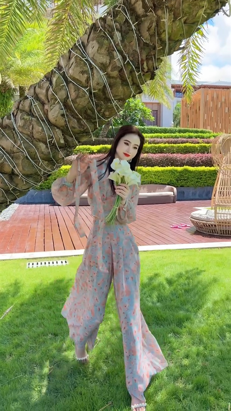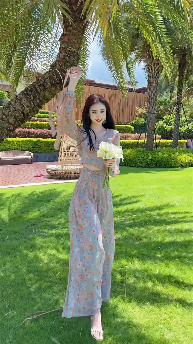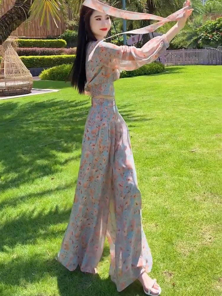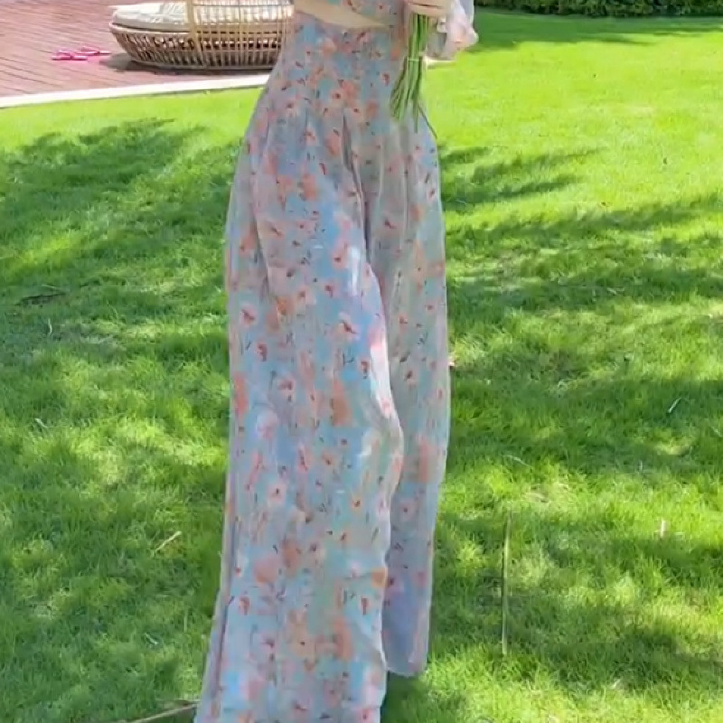 Yujie 팬 기질 휴가 스타일 꽃 탑 넓은 다리 바지 투피스 2025 이른 봄 새로운 튀김 거리 틈새 세트스토어 가기