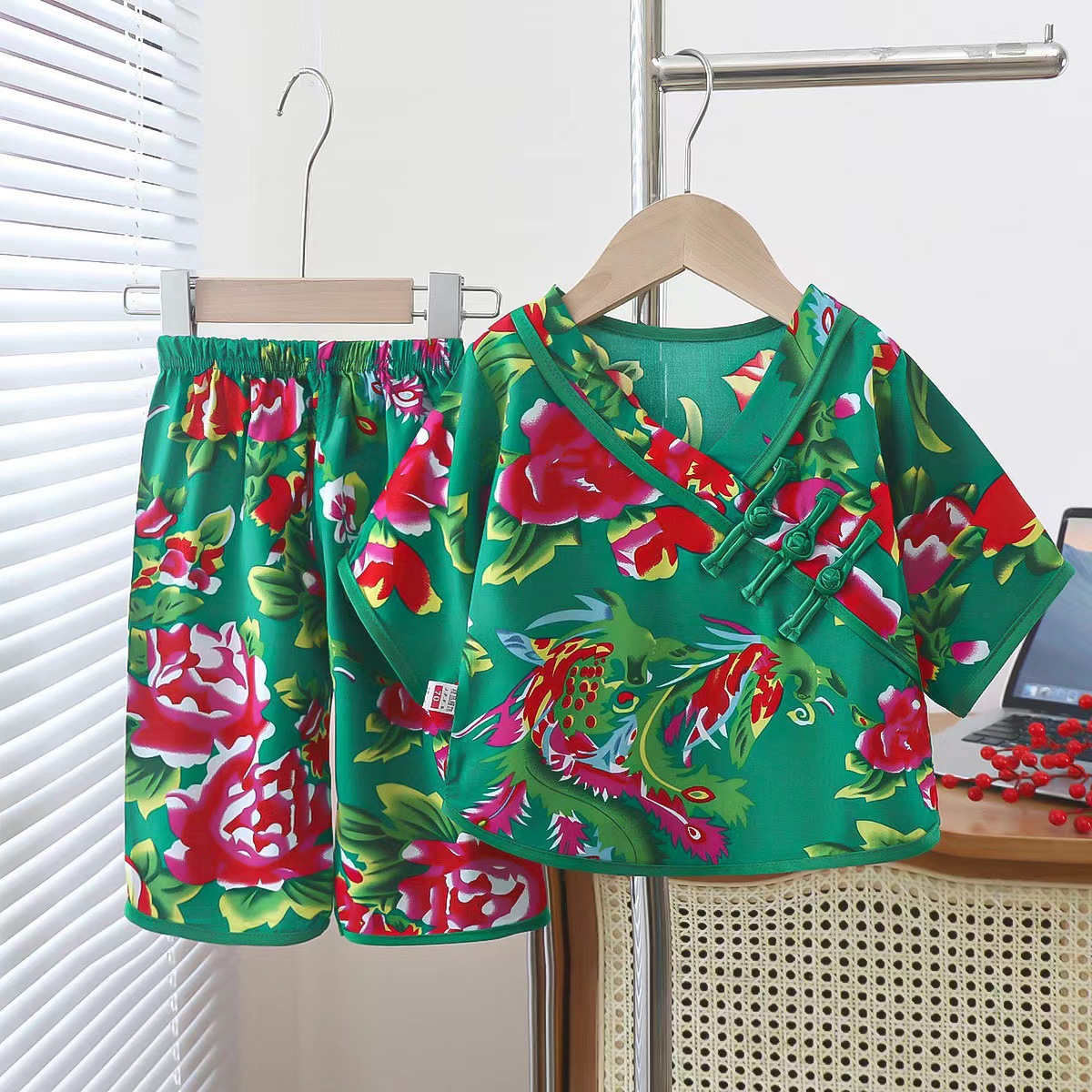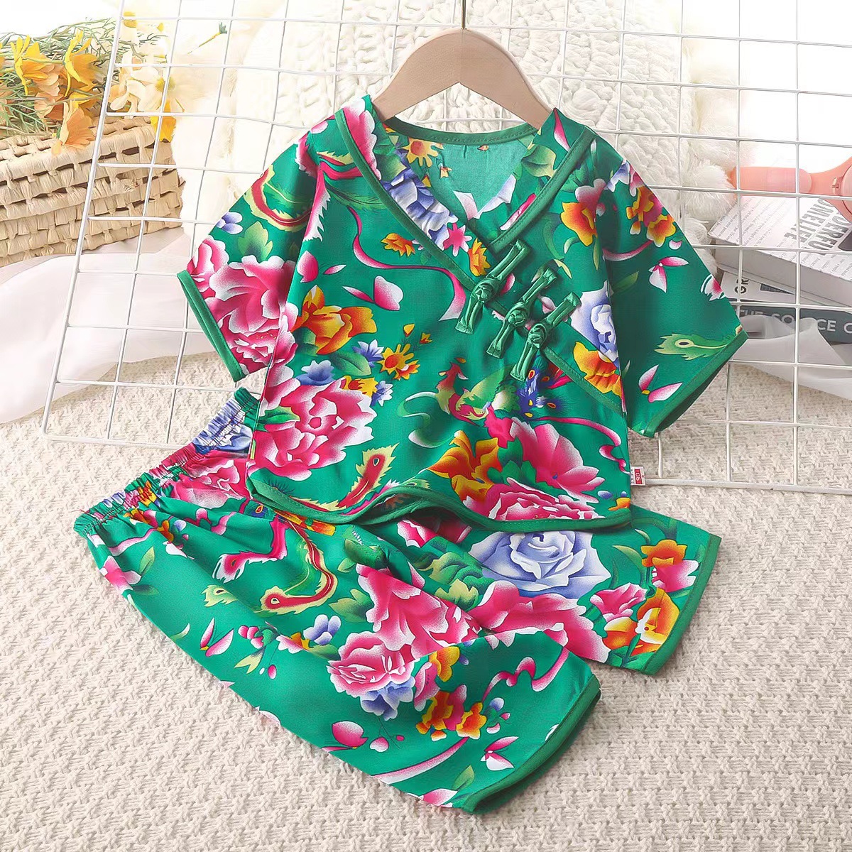 새로운 어린이 국가 스타일 잠옷 세트 아기 소녀 홈 의류 면 실크 여름 얇은 투피스 세트