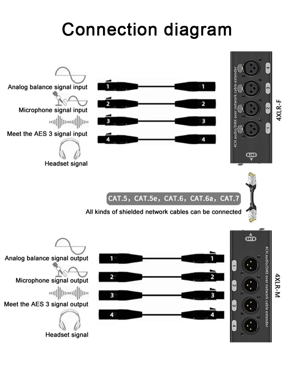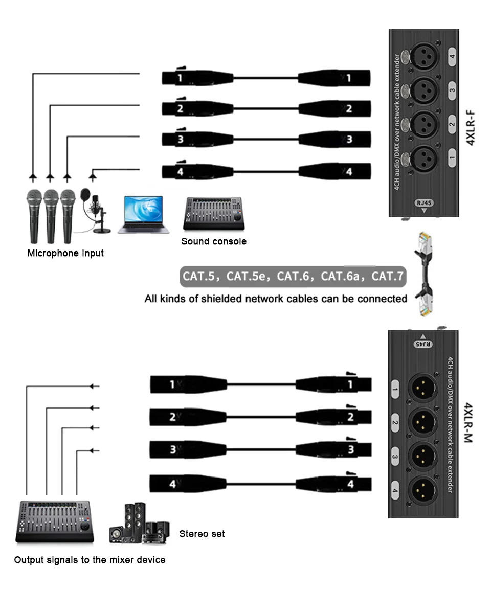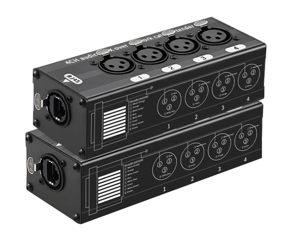 Ø 4 个模拟音频通道,一根电缆 — 这两个适配器一起使用,通过 RJ45 网络电缆传输 4 个模拟 XLR 音频信号。 将混音器、麦克风和乐器的音频连接到 XLR 端口,并通过屏蔽、平衡以太网电缆(另售)将所有 4 个信号传输到另一个适配器。
