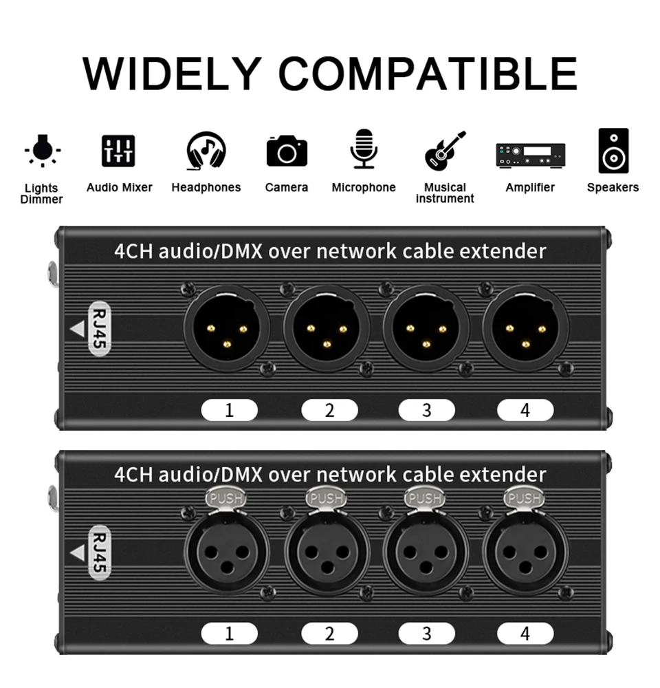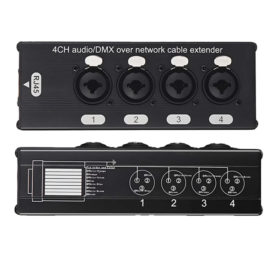 Ø 4 通道 XLR 到以太网适配器 — 将这两个扩展盒与高达 300 英尺的以太网电缆连接起来。(单独出售),通过单个连接传输多达 4 个通道的 XLR 音频或 3 针 DMX 控制信号