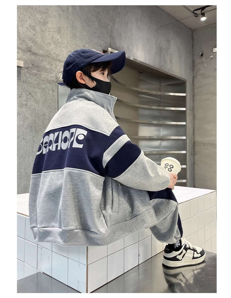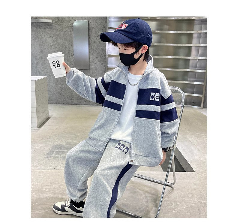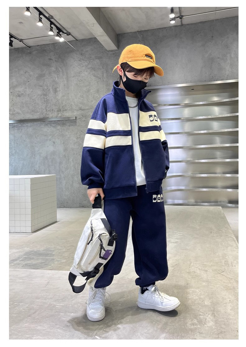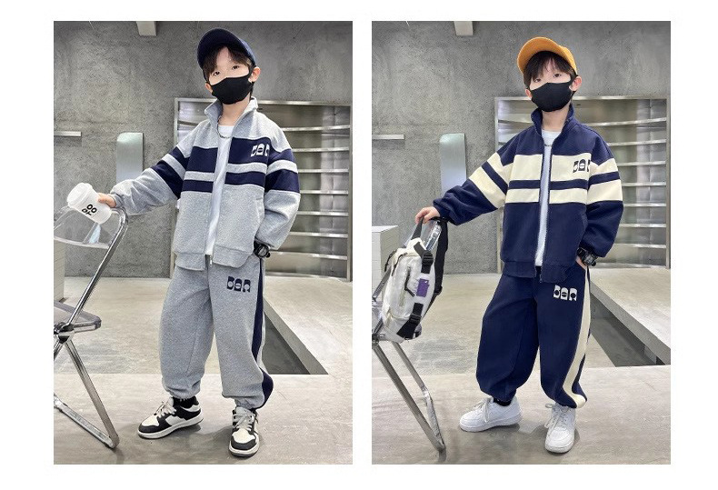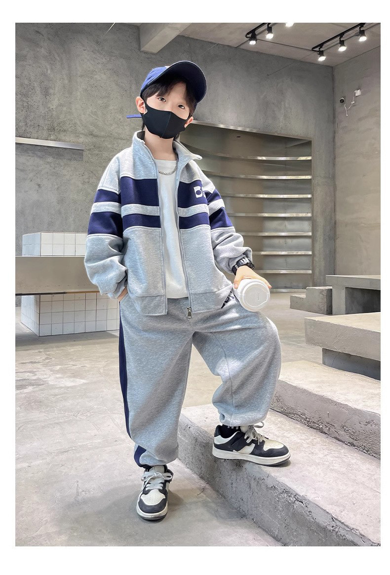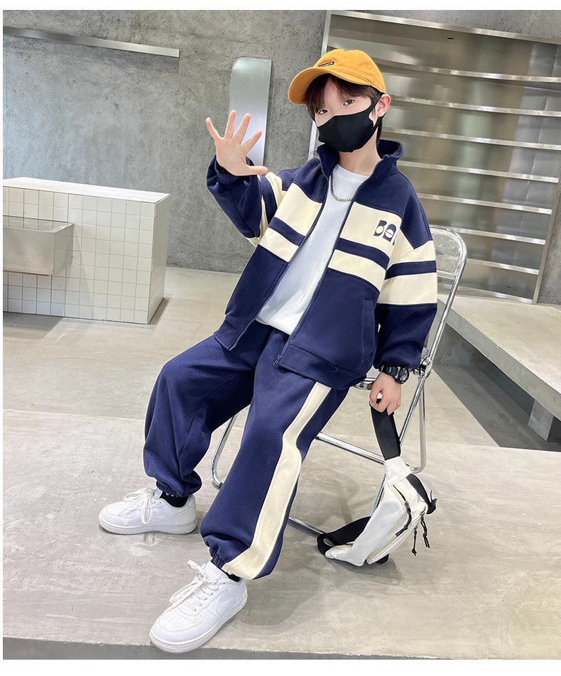 봄 어린이 줄무늬 스티칭 스포츠 레저 세트 25 소년 지퍼 카디건 스탠드 칼라 스웨터 바지 투피스 세트스토어 가기