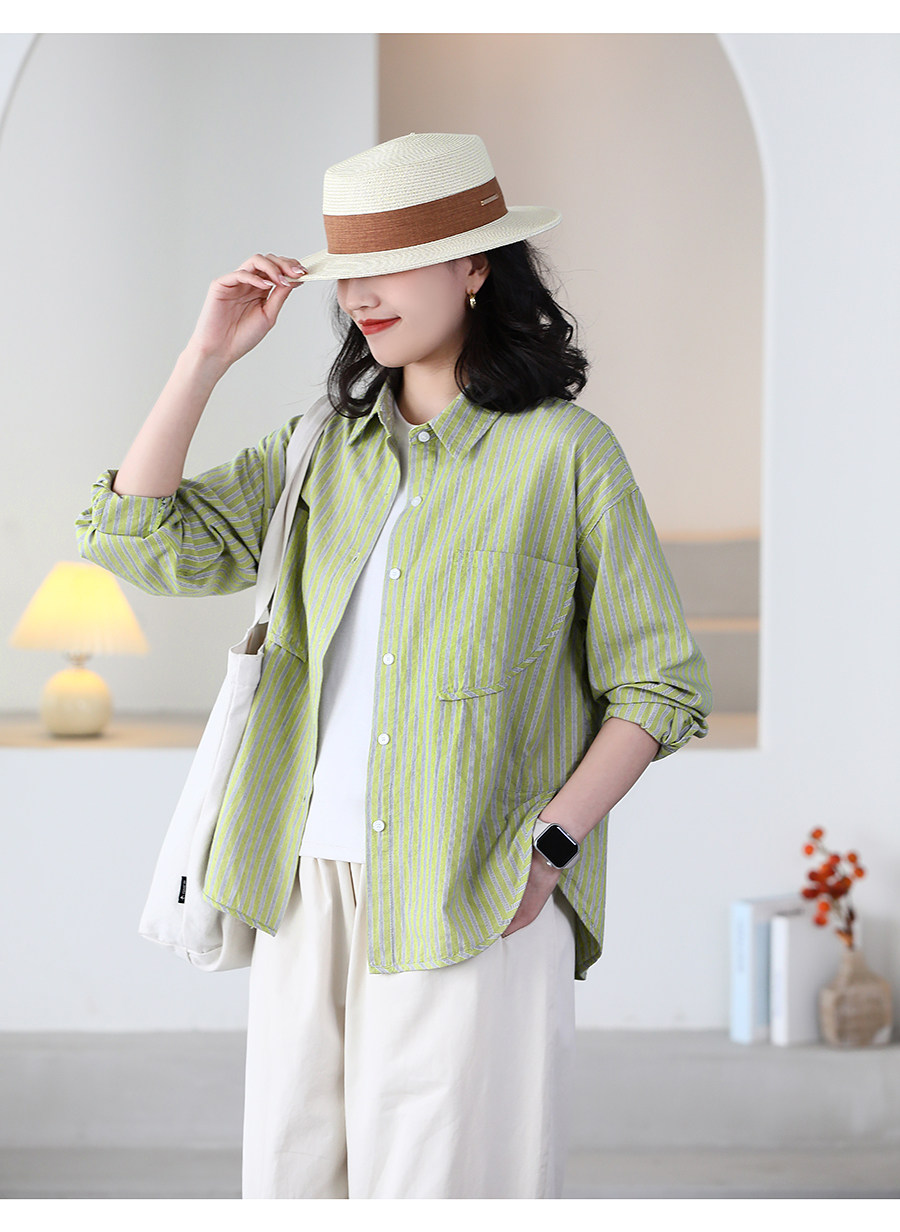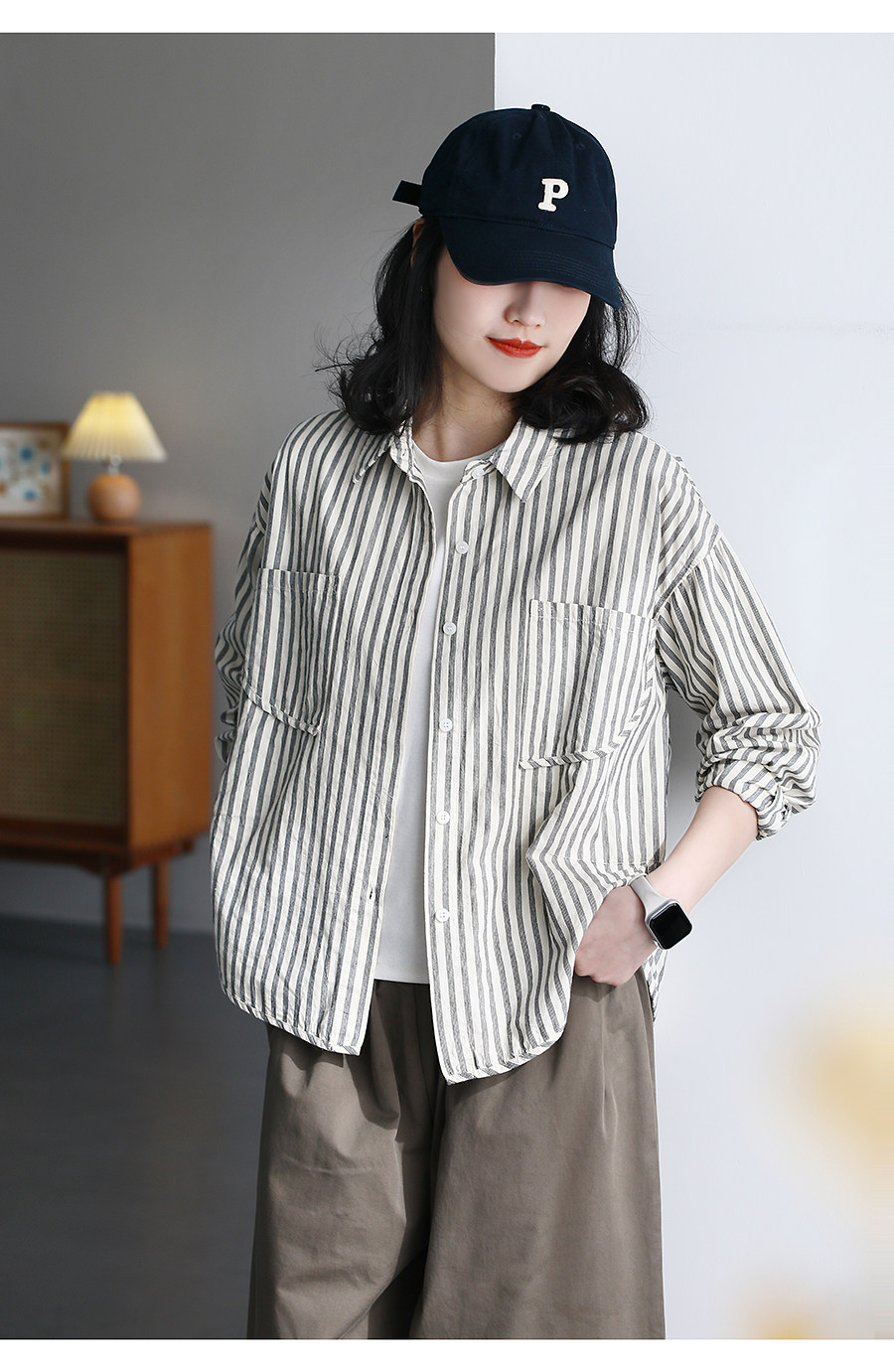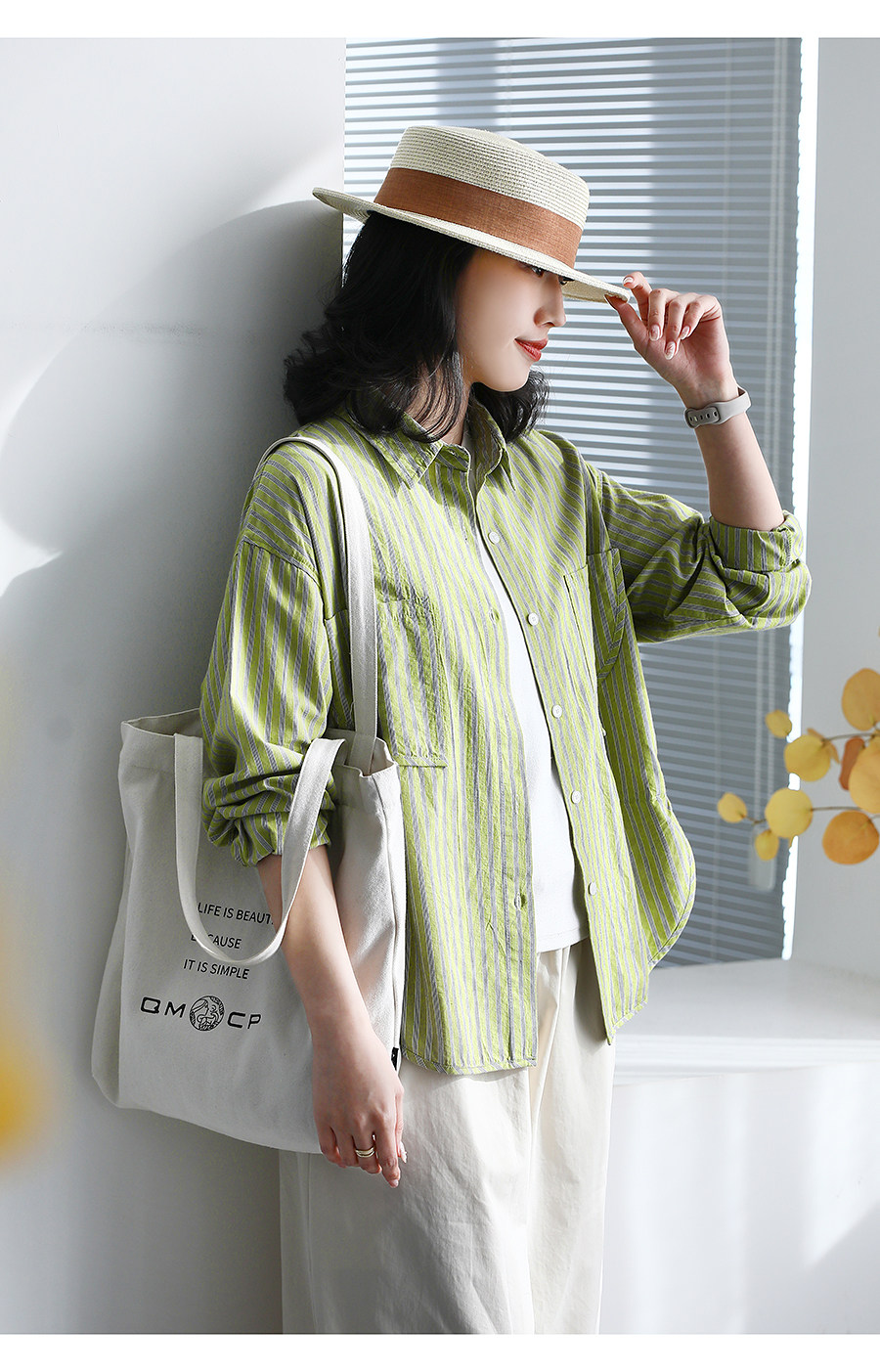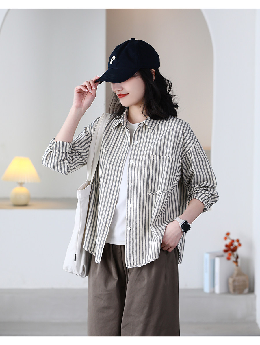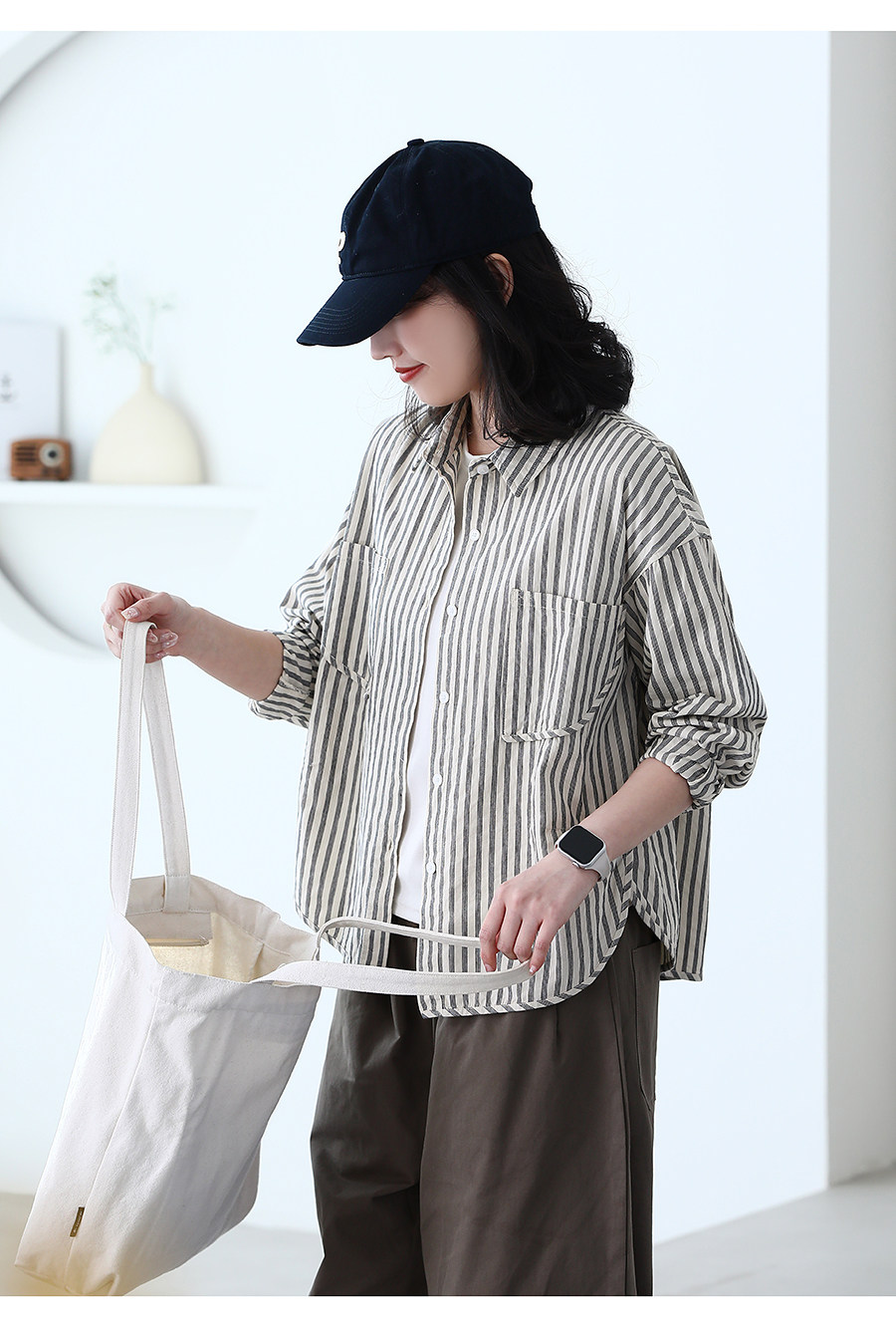 봄 새 도착 줄무늬 셔츠 여자 옷깃 캐주얼 올매치 느슨한 슬리밍 한국 긴팔 셔츠 6870스토어 가기