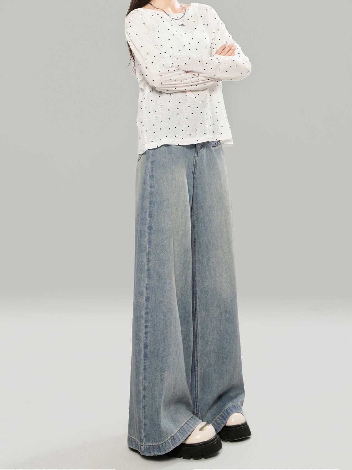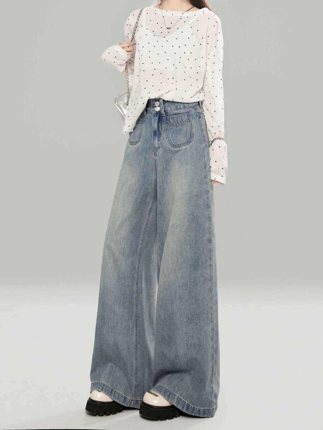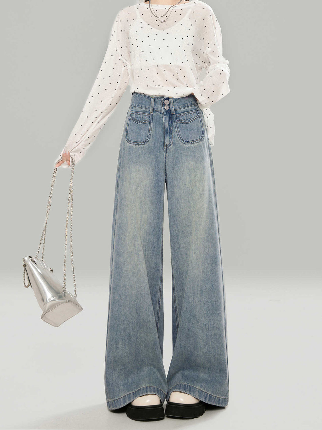 라이트 블루 레트로 높은 허리 넓은 다리 청바지 여성의 2025 년 봄과 가을 새로운 배 모양의 몸 느슨한 덤핑 바지