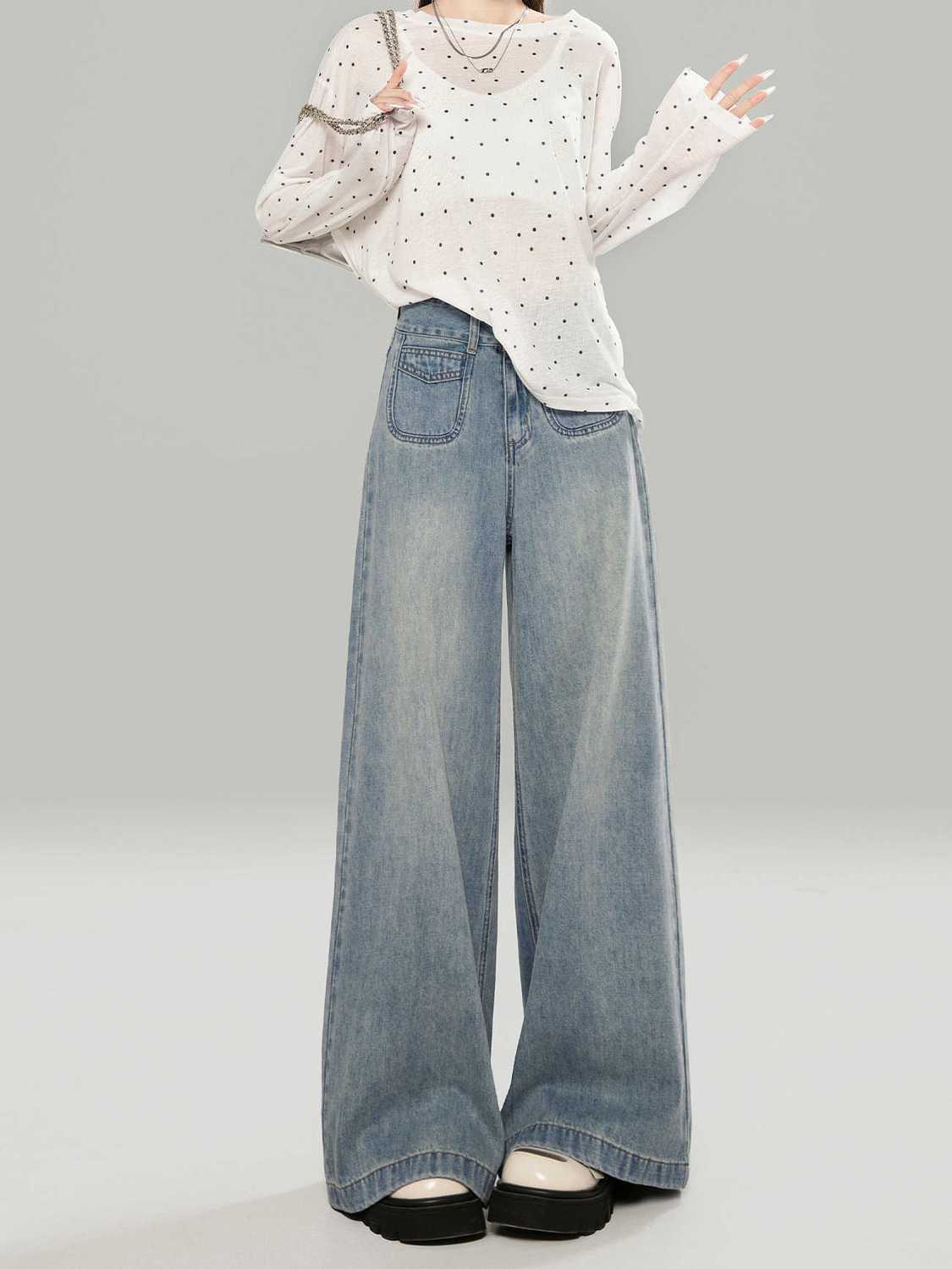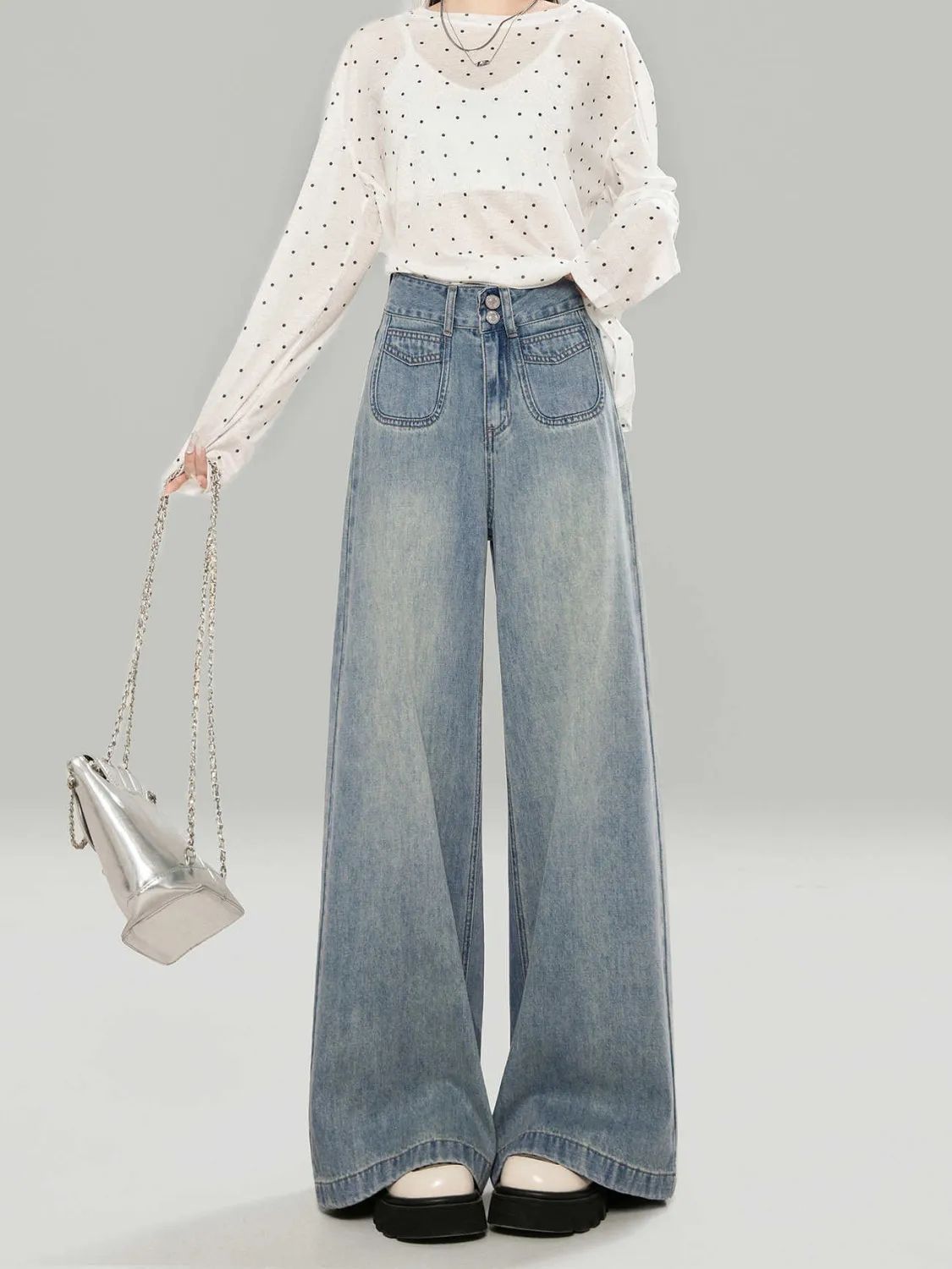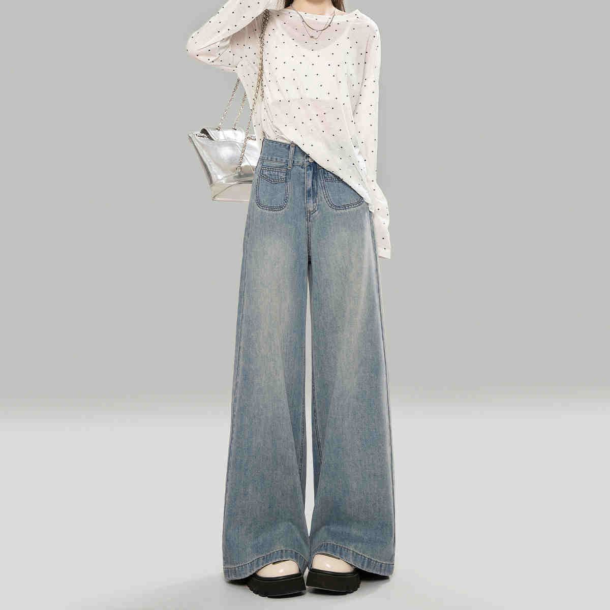 라이트 블루 레트로 높은 허리 넓은 다리 청바지 여성의 2025 년 봄과 가을 새로운 배 모양의 몸 느슨한 덤핑 바지스토어 가기