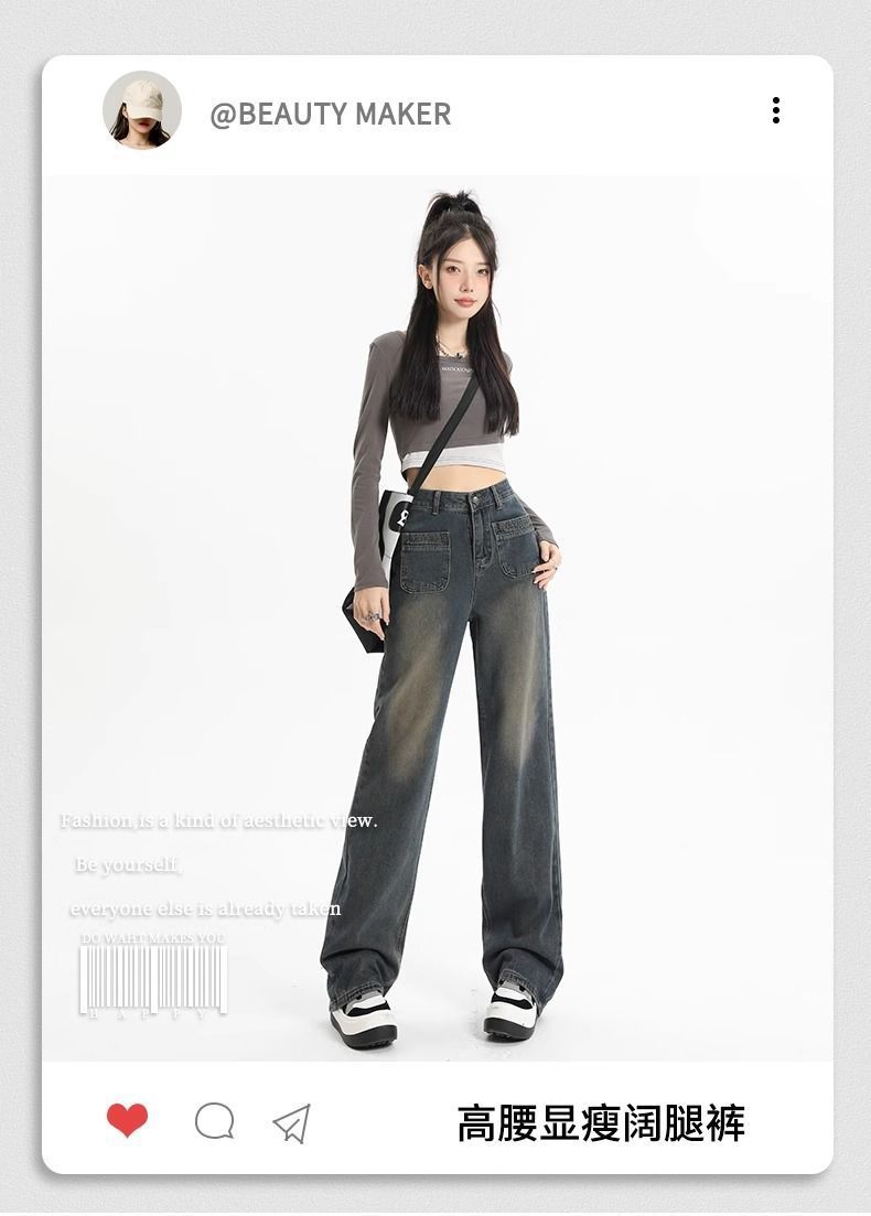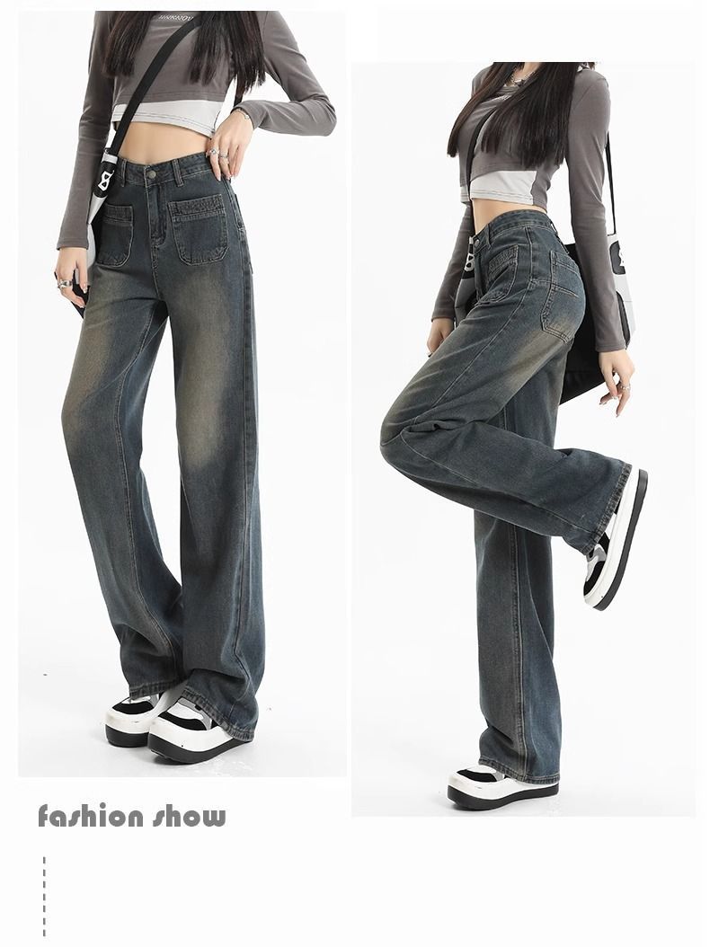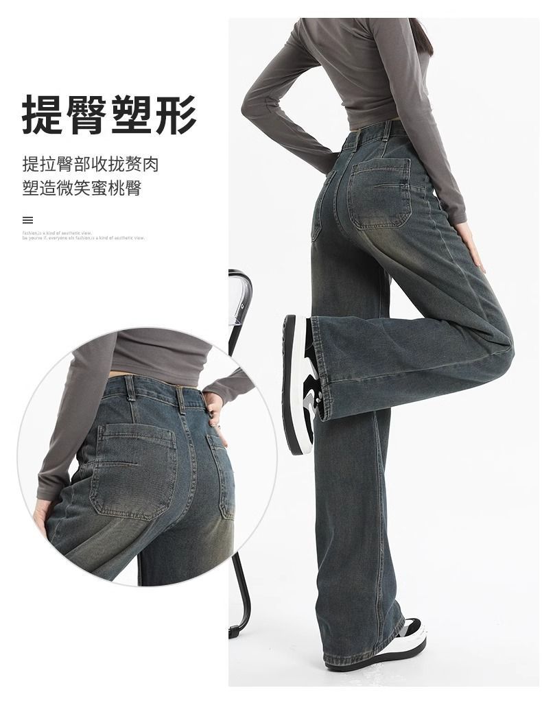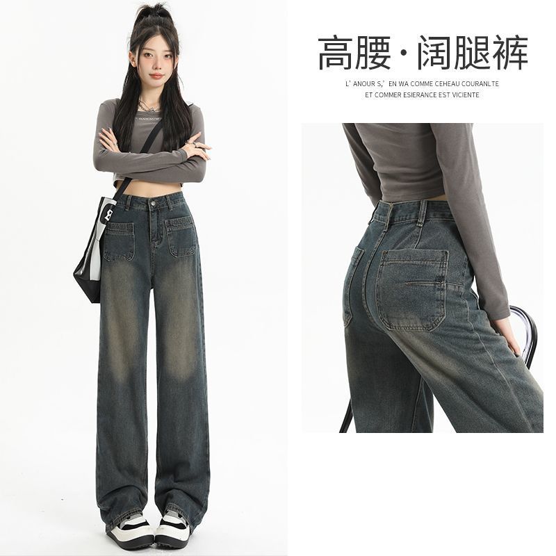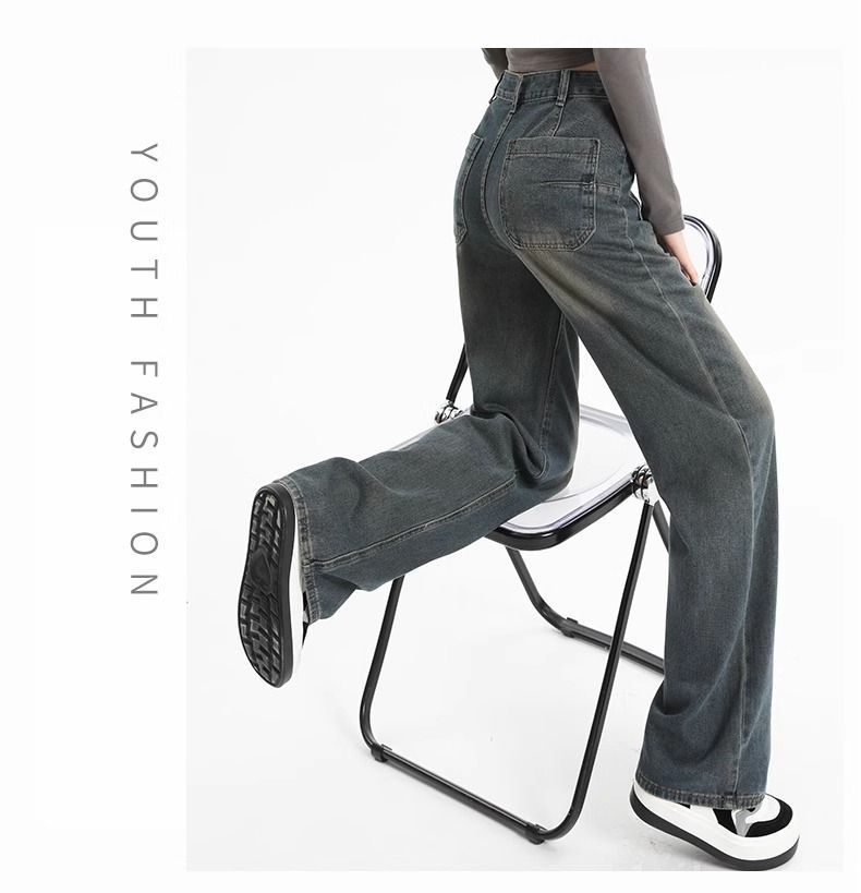 시멘트 회색 넓은 다리 청바지 여성의 느슨한 봄과 가을 새로운 높은 허리 향수 레트로 좁은 버전 스트레이트 바닥 긴 바지스토어 가기