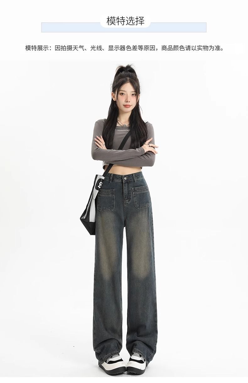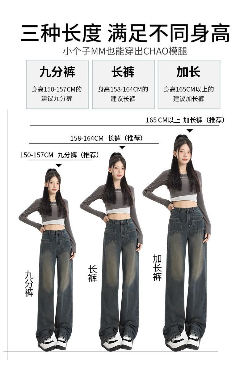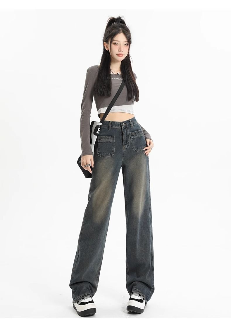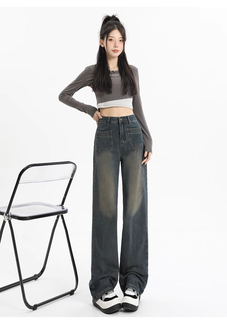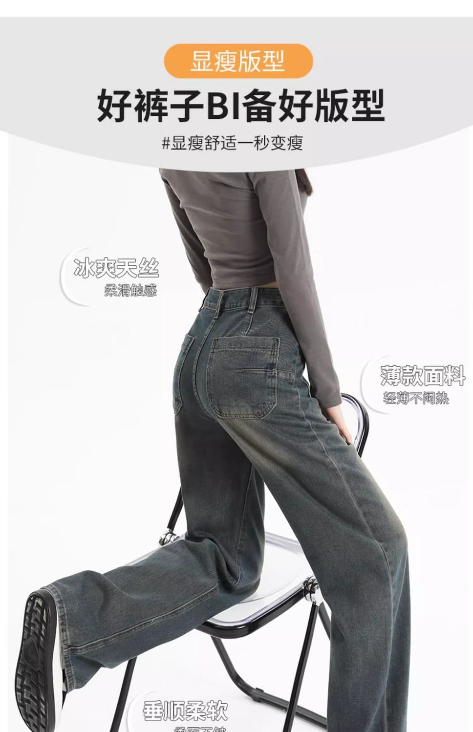 시멘트 회색 넓은 다리 청바지 여성의 느슨한 봄과 가을 새로운 높은 허리 향수 레트로 좁은 버전 스트레이트 바닥 긴 바지스토어 가기
