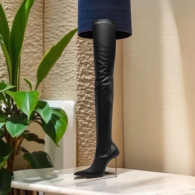 2025 유럽 및 미국 스타일 수출용 뾰족코 얇은 굽 하이힐 무릎 위 롱부츠 대형 사이즈 패션쇼 롱부츠 여성용 유럽 및 미국 인기 상품