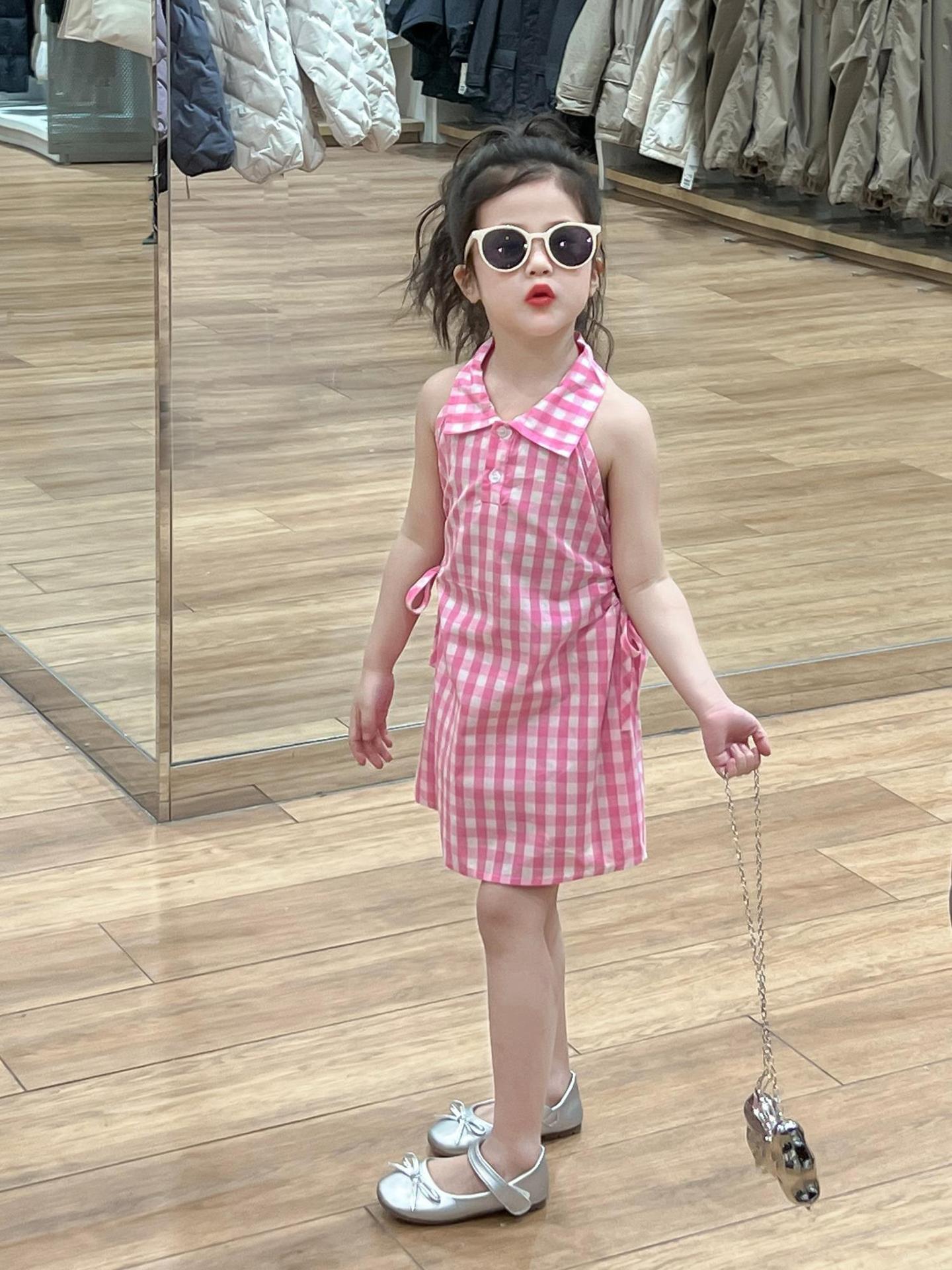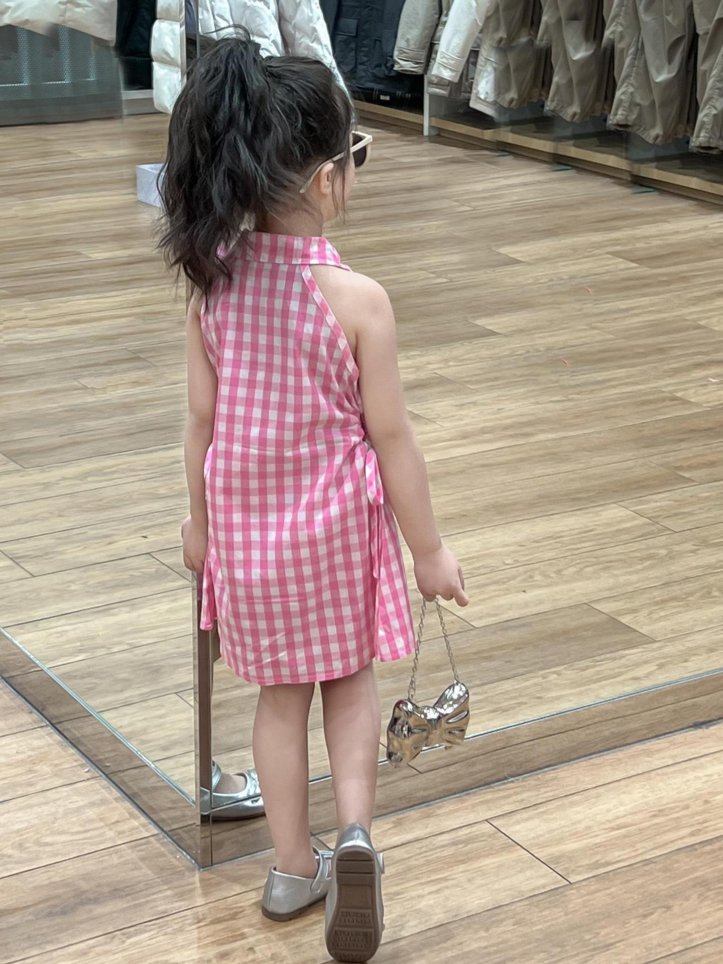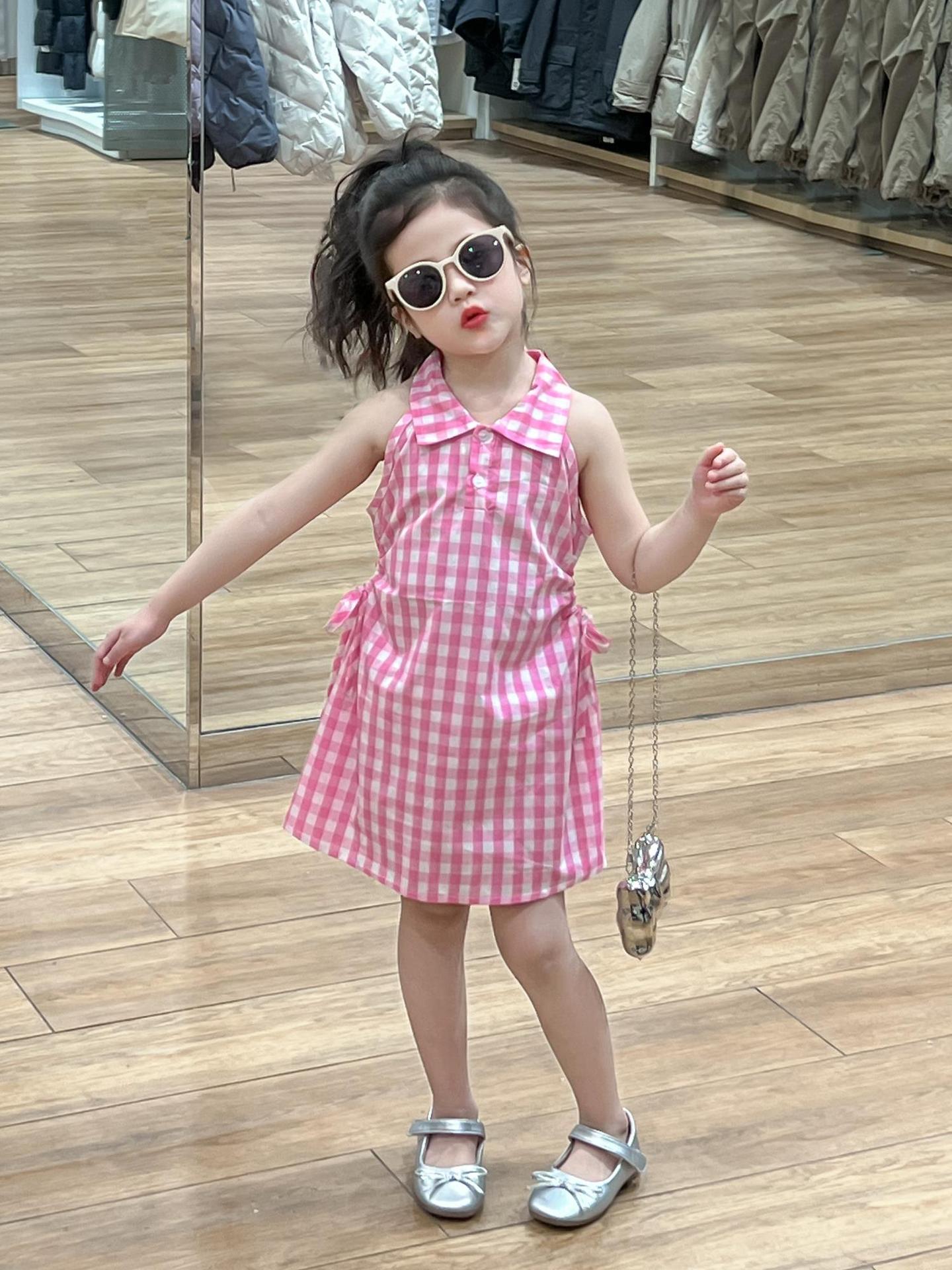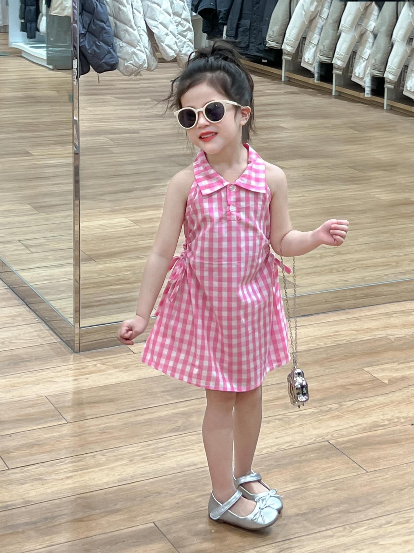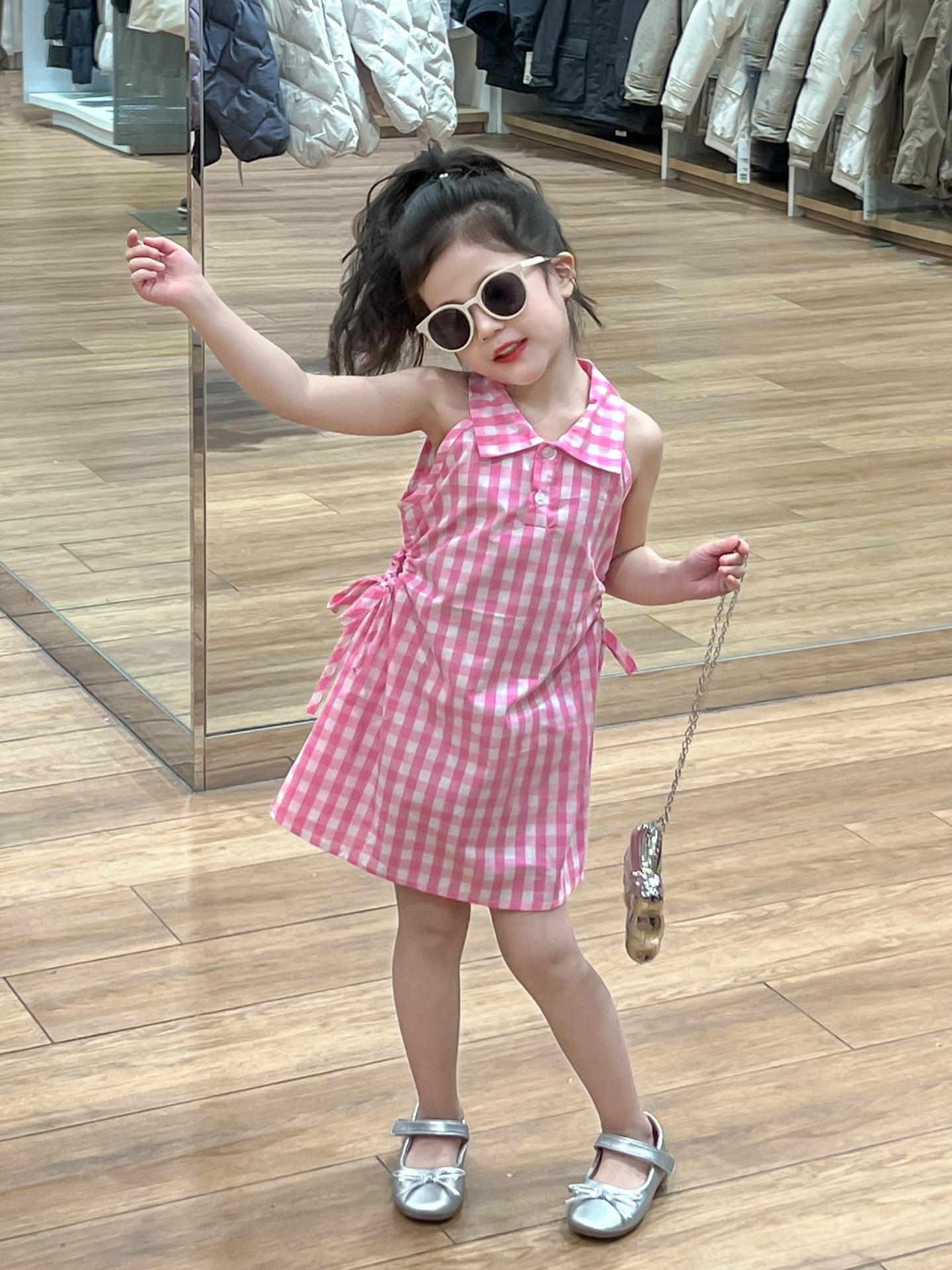 2025 년 여름 소녀의 달콤한 격자 무늬 민소매 원피스 동굴 허리 컷 아웃 셔츠 칼라 공주 탱크 원피스스토어 가기