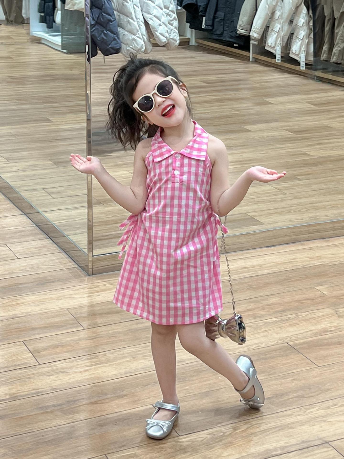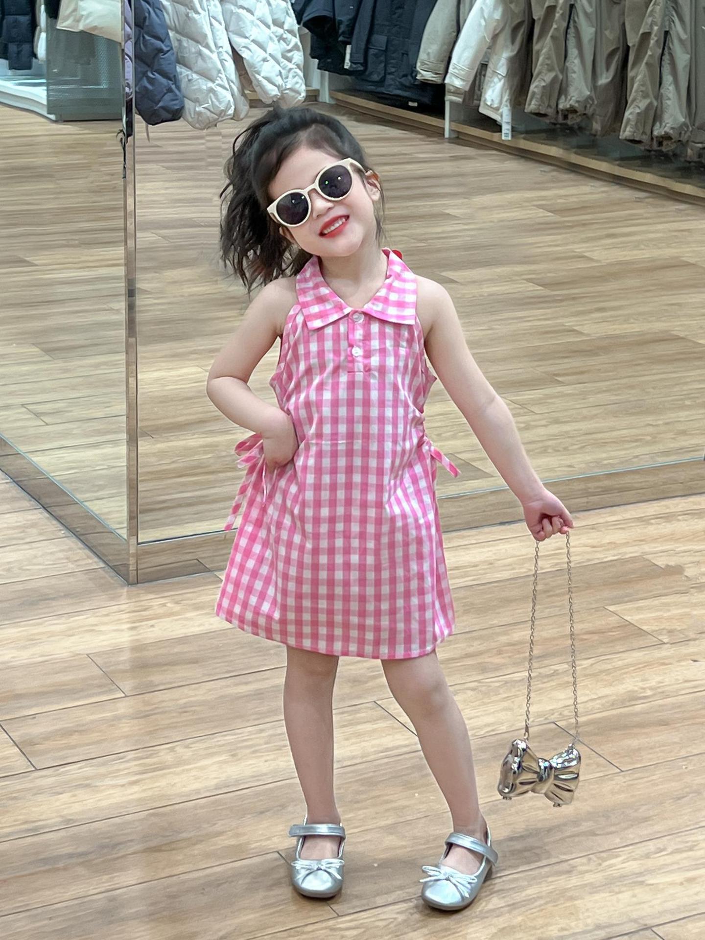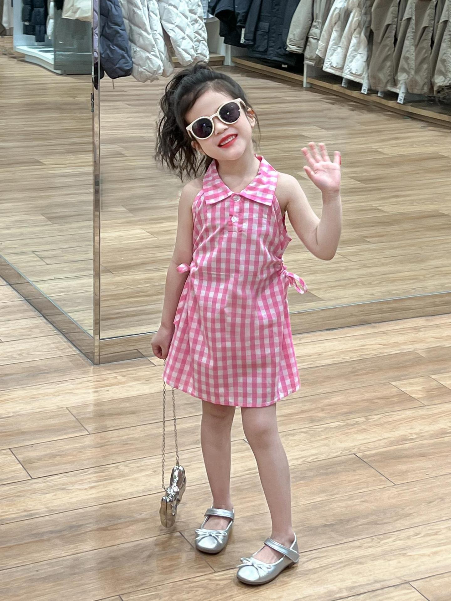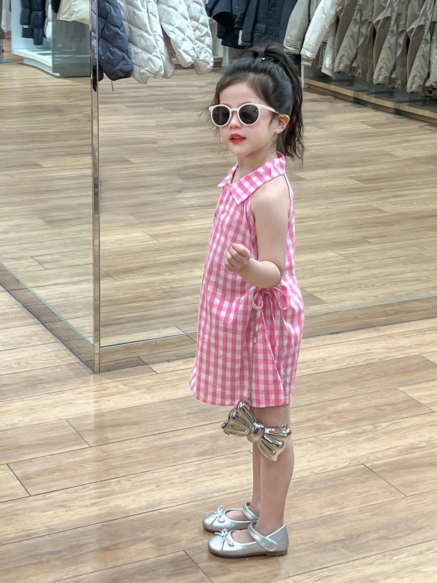 2025 년 여름 소녀의 달콤한 격자 무늬 민소매 원피스 동굴 허리 컷 아웃 셔츠 칼라 공주 탱크 원피스스토어 가기