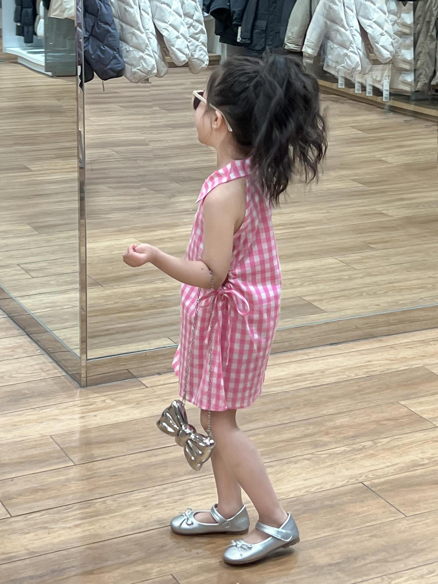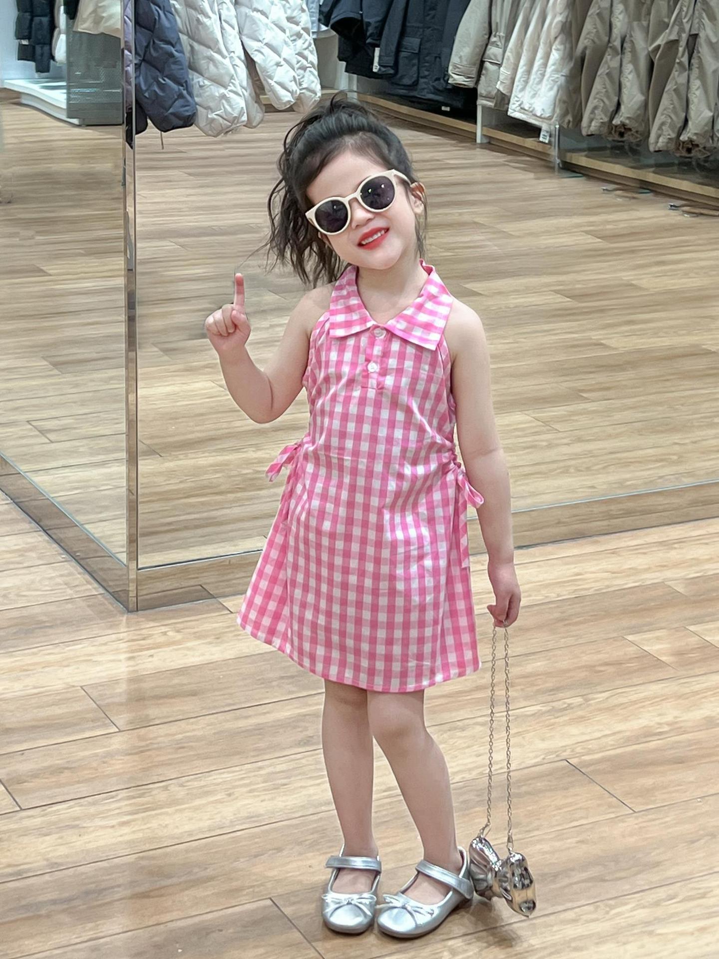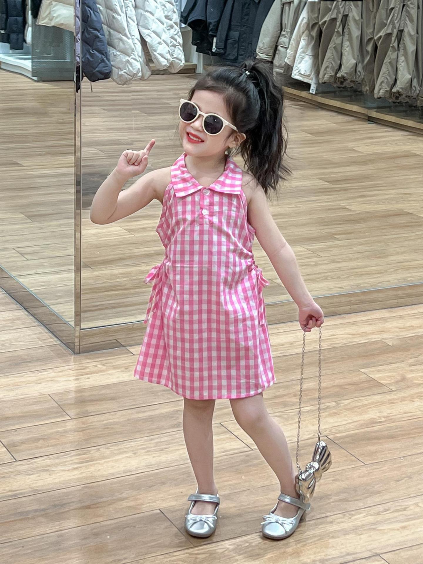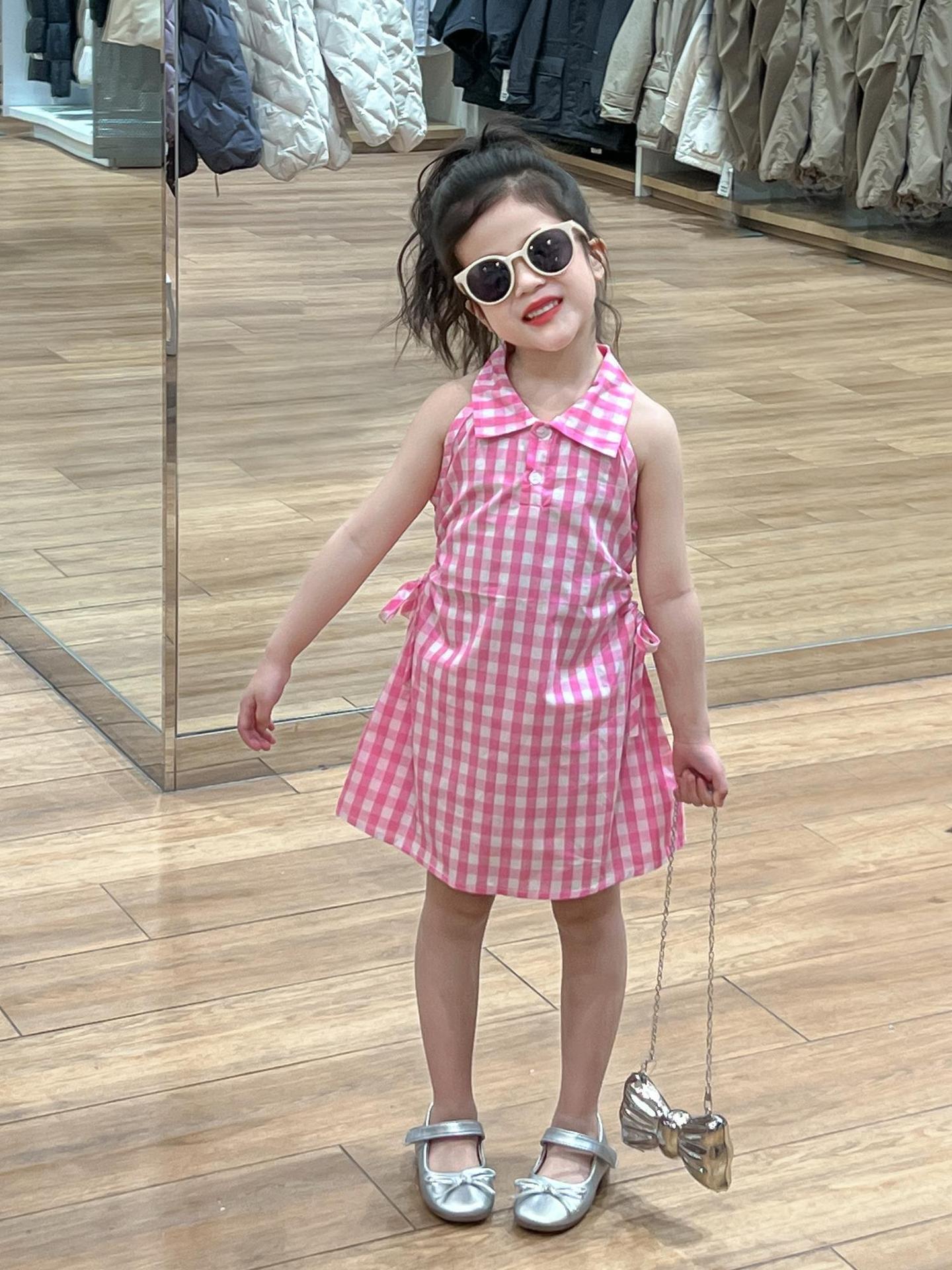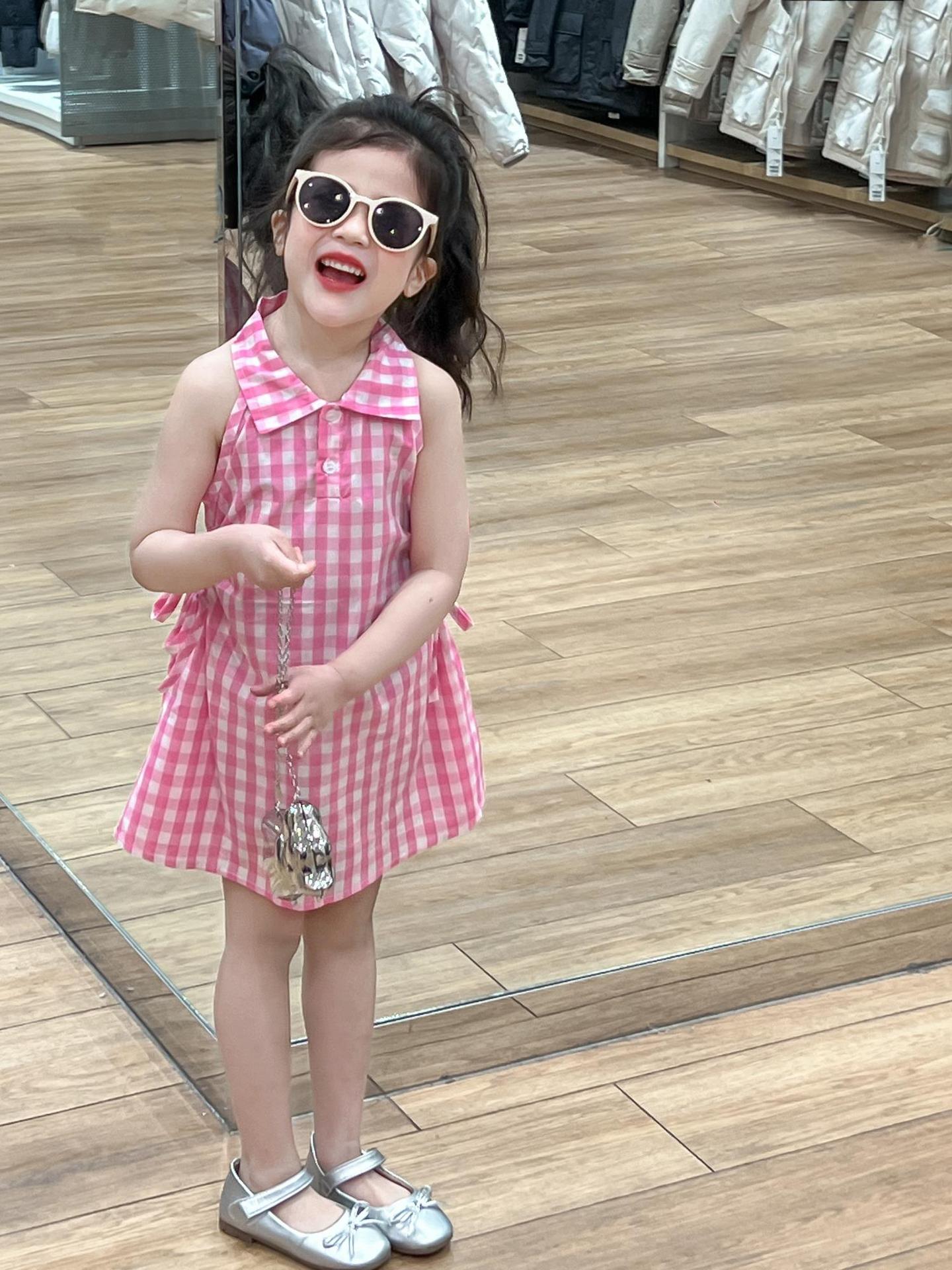 2025 년 여름 소녀의 달콤한 격자 무늬 민소매 원피스 동굴 허리 컷 아웃 셔츠 칼라 공주 탱크 원피스스토어 가기
