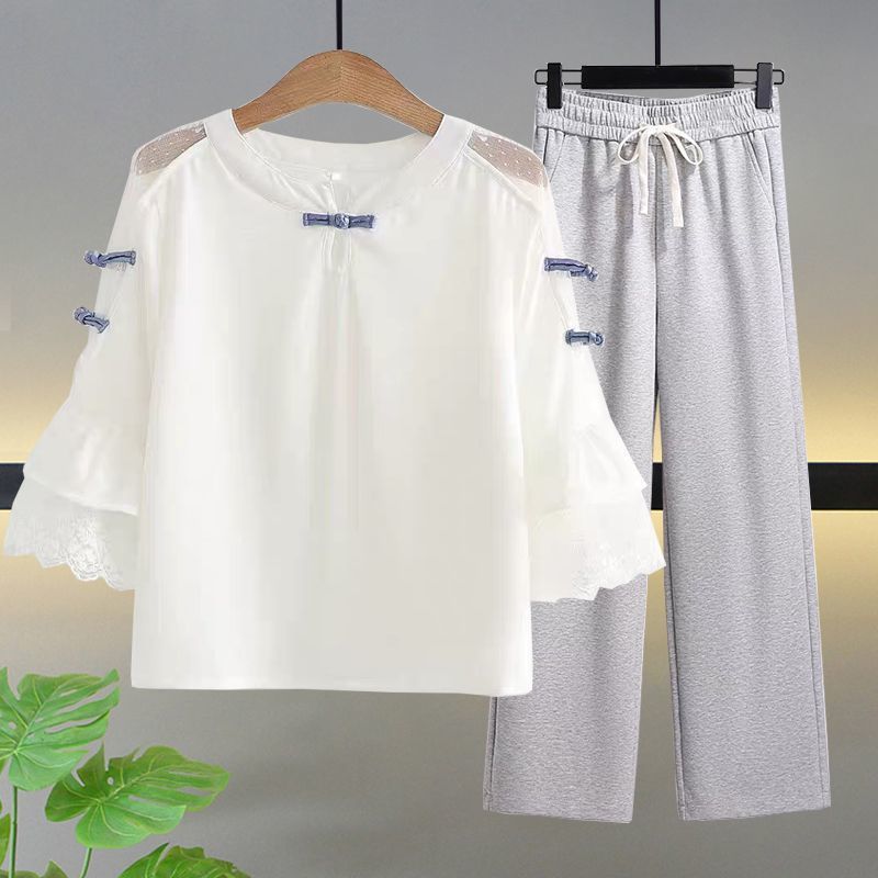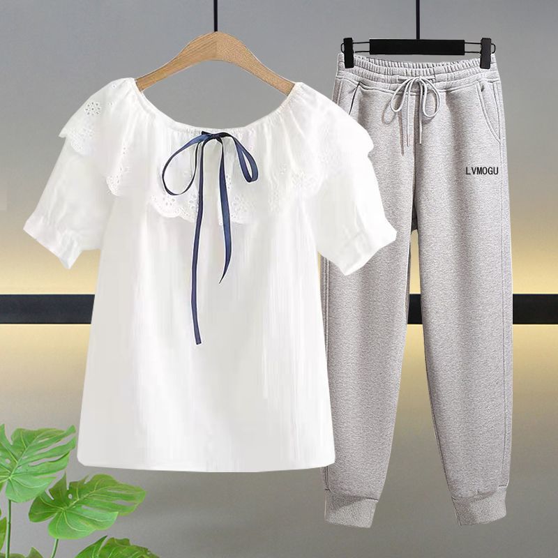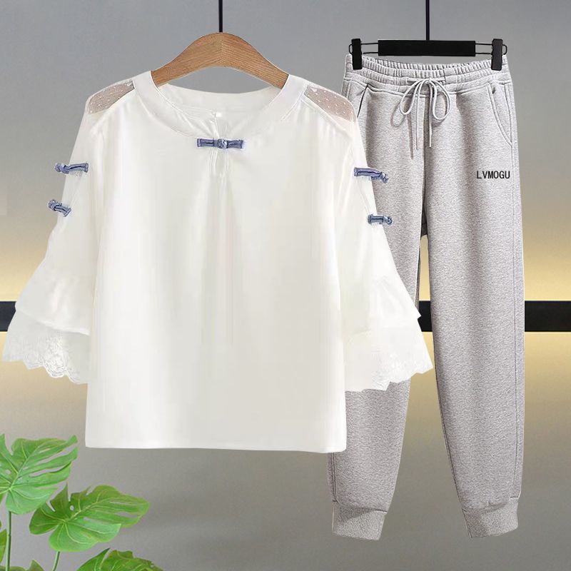 • 레이스 칼라 + 그레이 스웨트팬츠