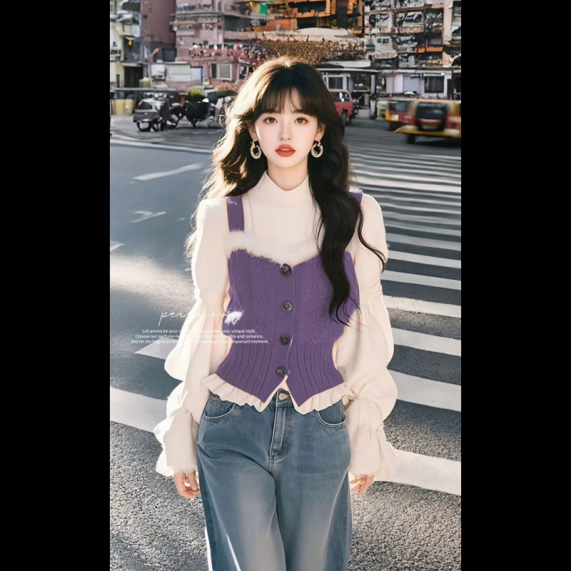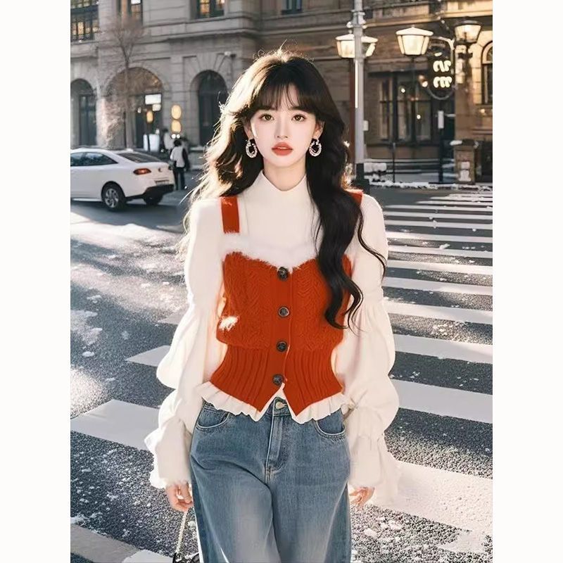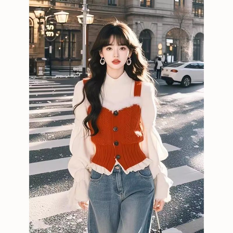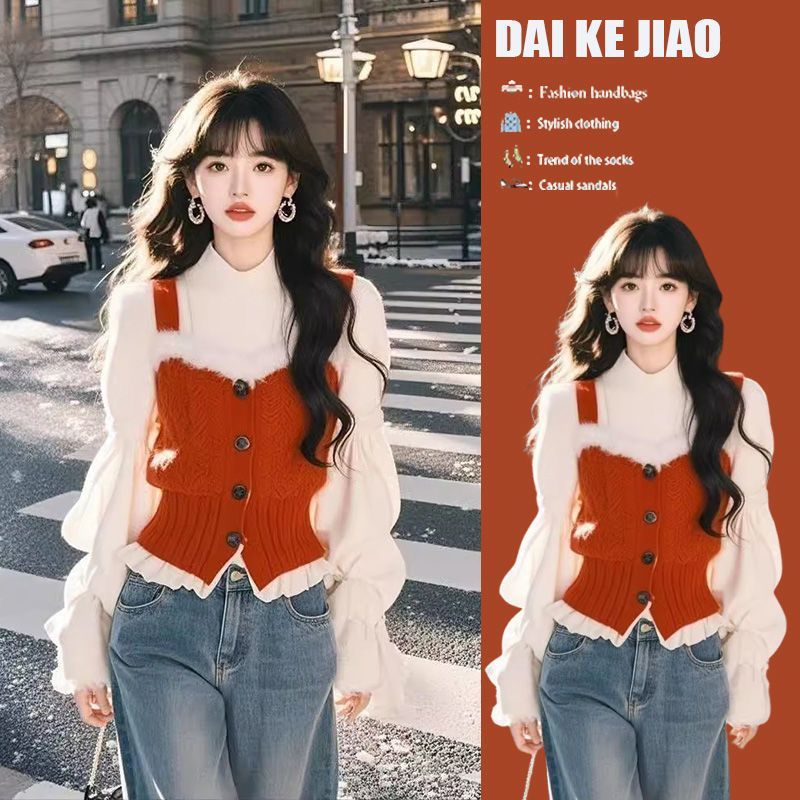 이른 봄, 크리스마스 하이 엔드 가짜 투피스 스웨터 청바지 투피스 세트 여성의 2025 새로운 한국어 버전 세트