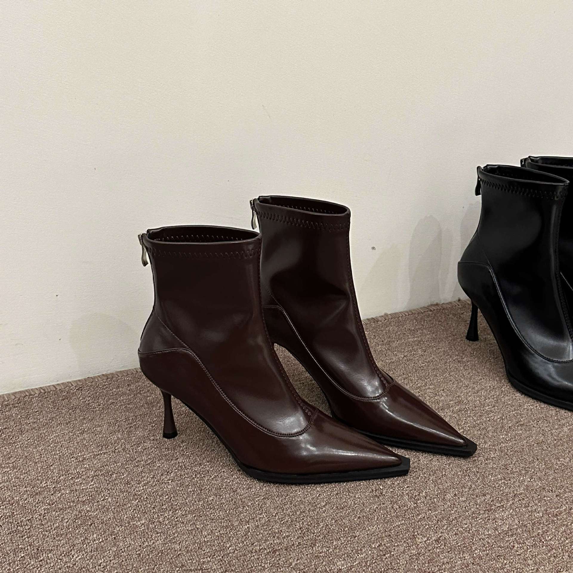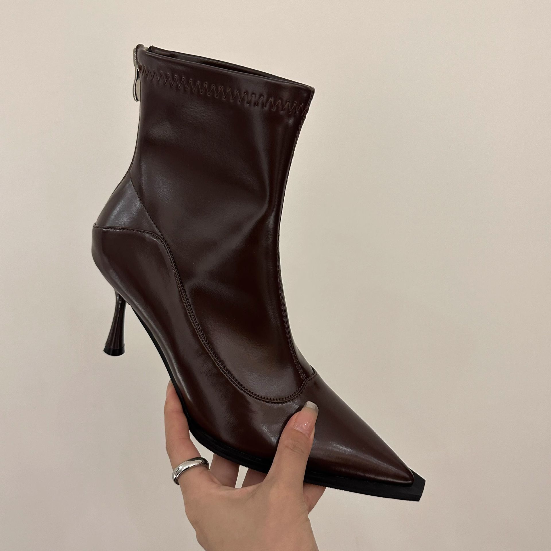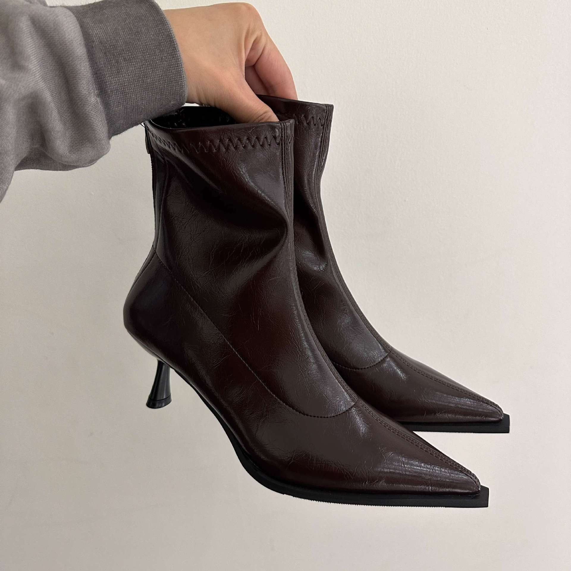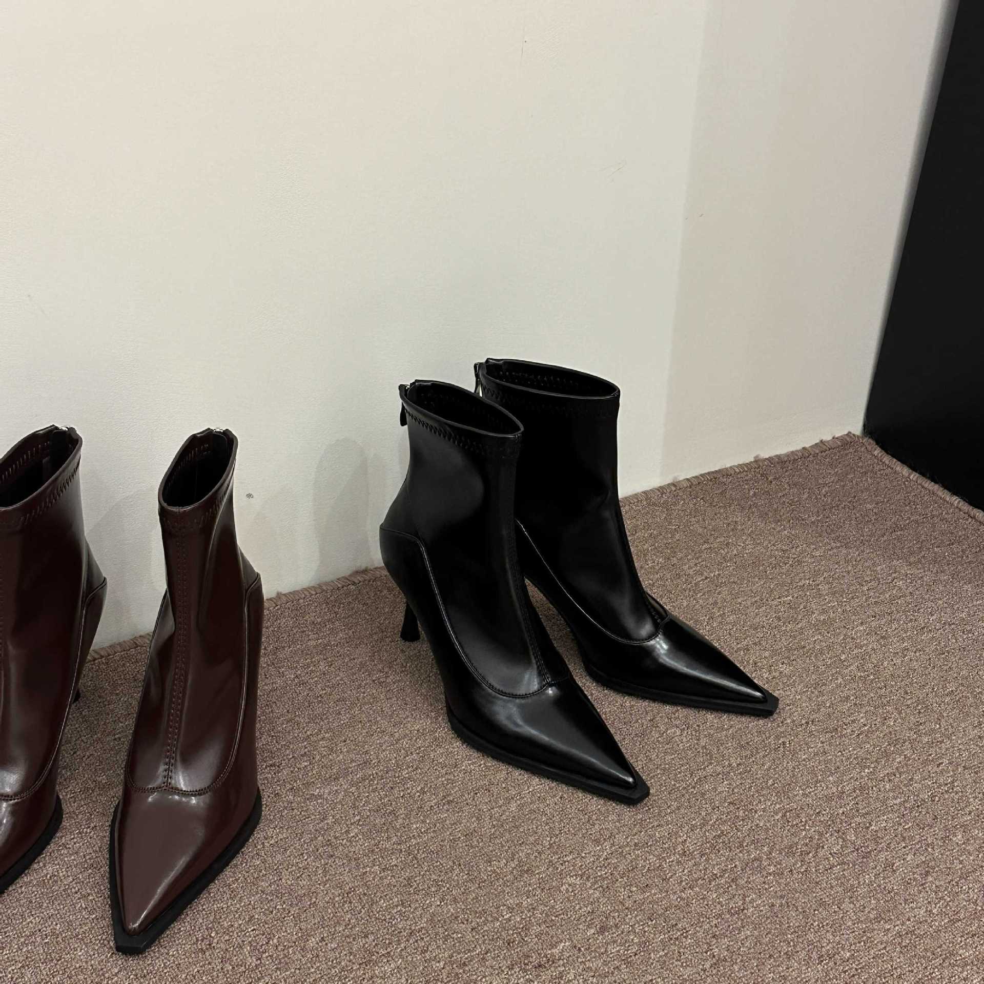높은 굽 뾰족한 발목 부츠 2025 가을 및 겨울 새로운 유럽과 미국의 얇은 굽 바느질 알몸 부츠 얇은 부츠 레트로 다크 브라운 발목 부츠스토어 가기