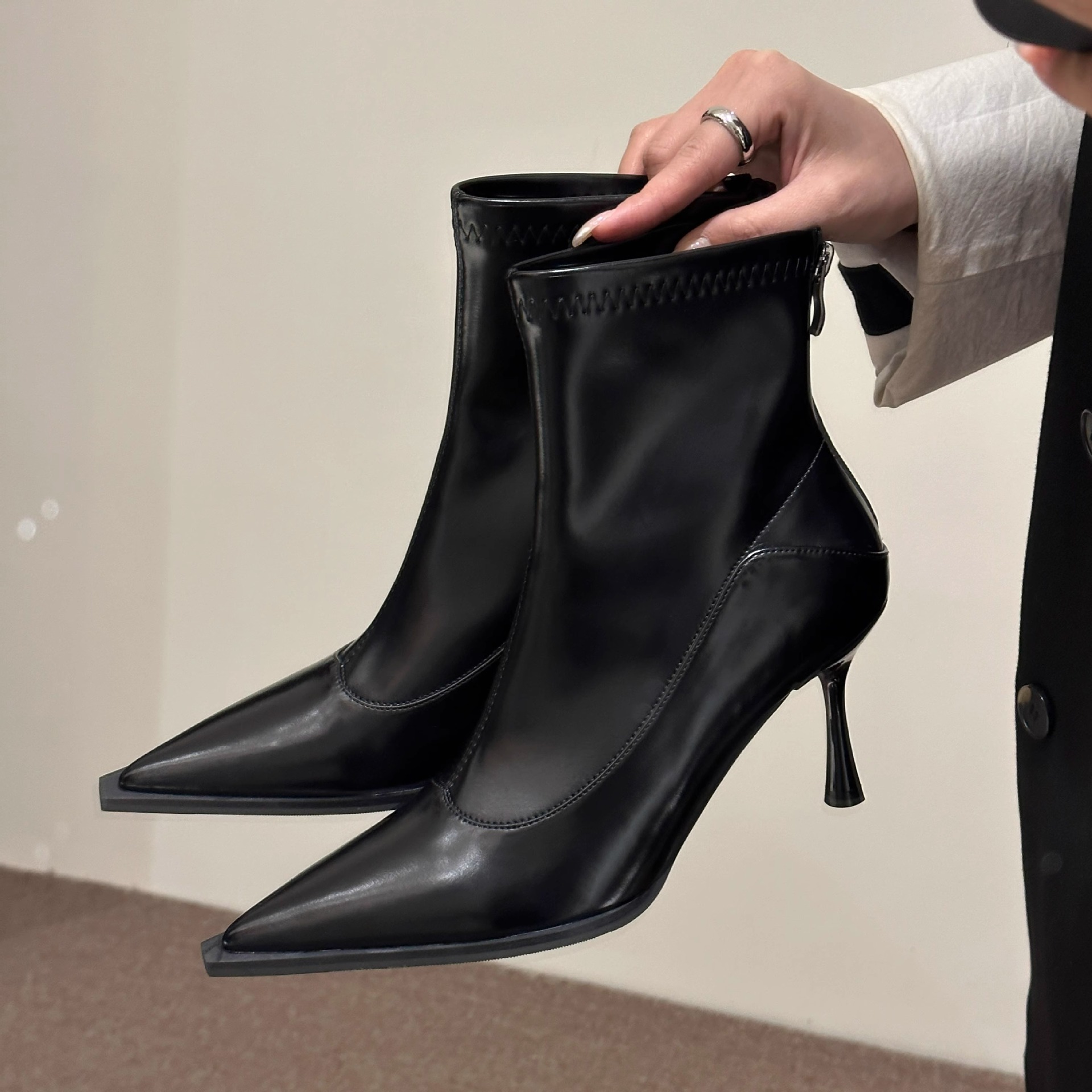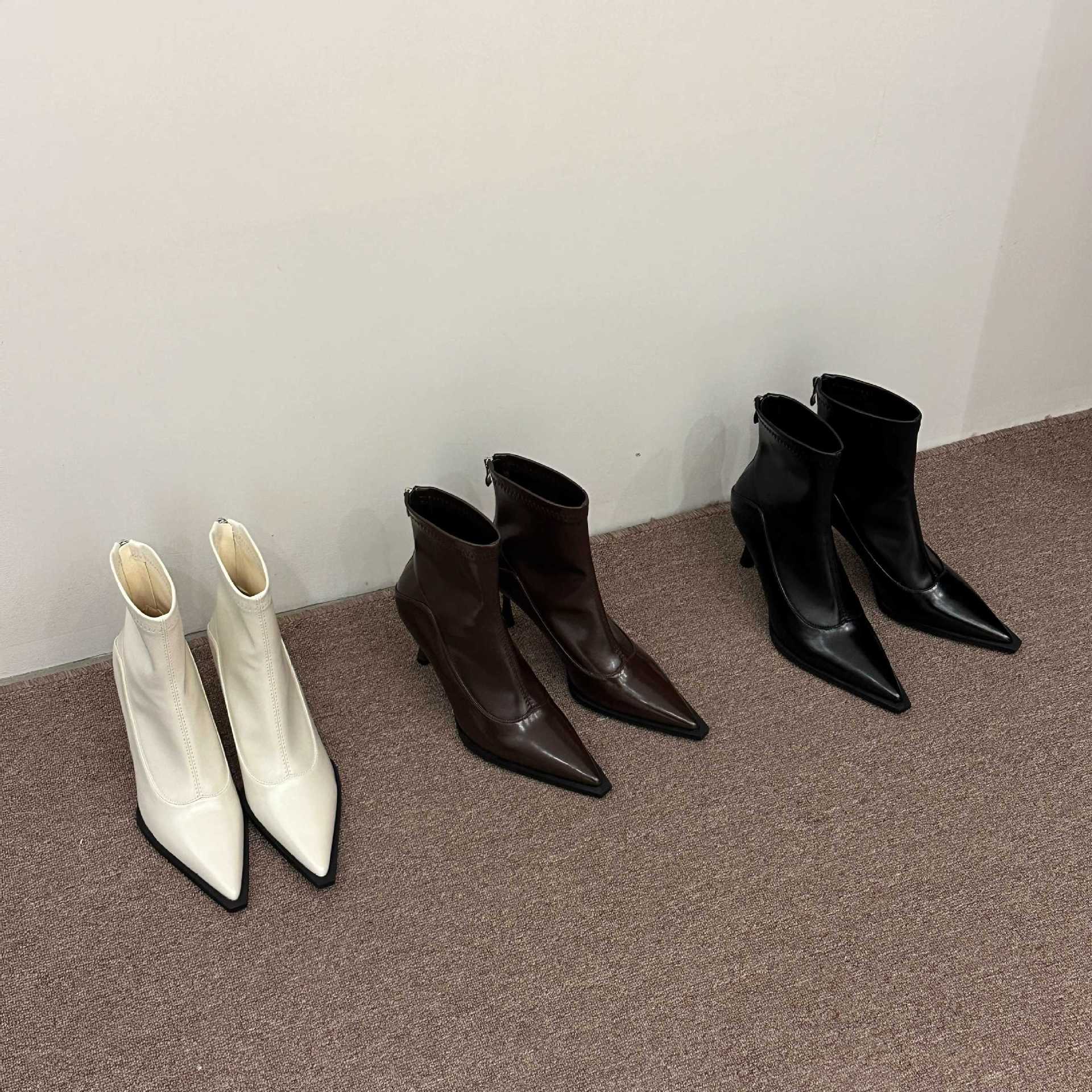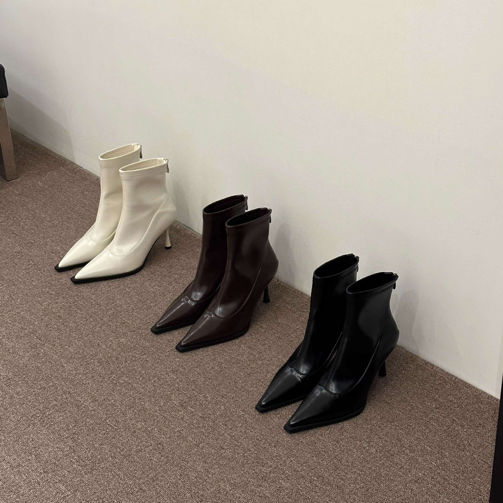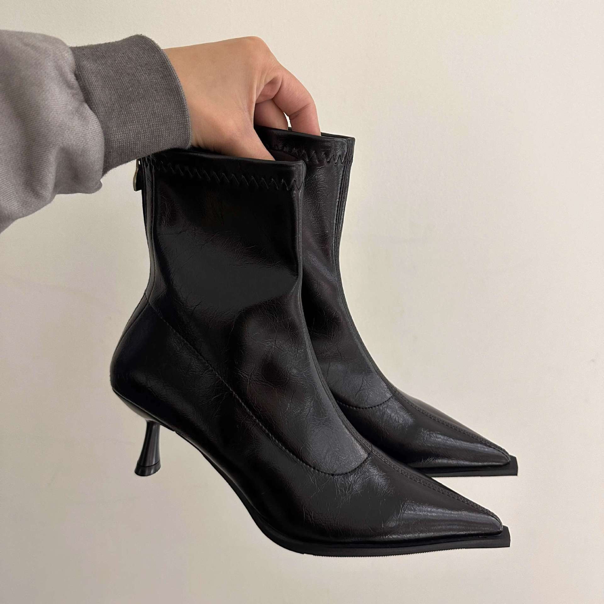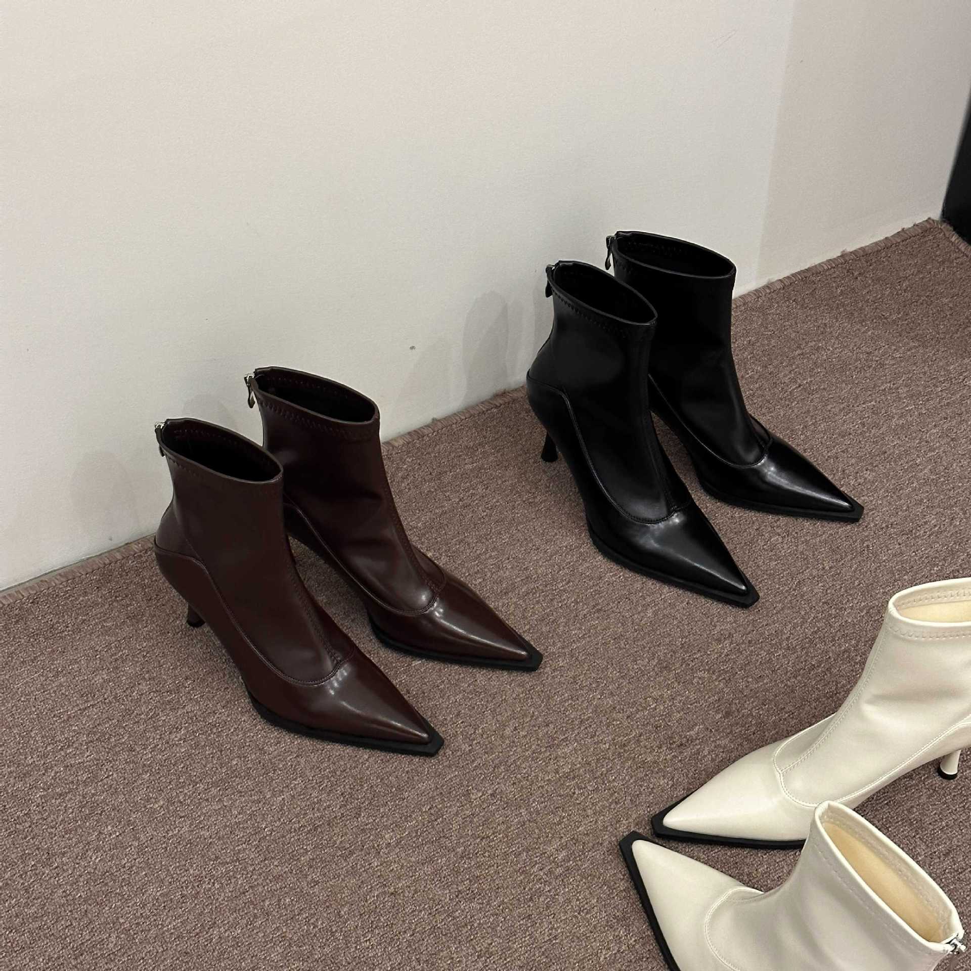 높은 굽 뾰족한 발목 부츠 2025 가을 및 겨울 새로운 유럽과 미국의 얇은 굽 바느질 알몸 부츠 얇은 부츠 레트로 다크 브라운 발목 부츠스토어 가기
