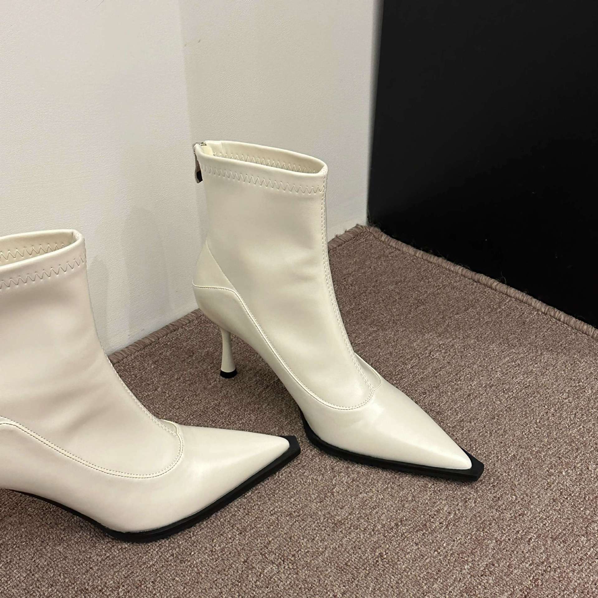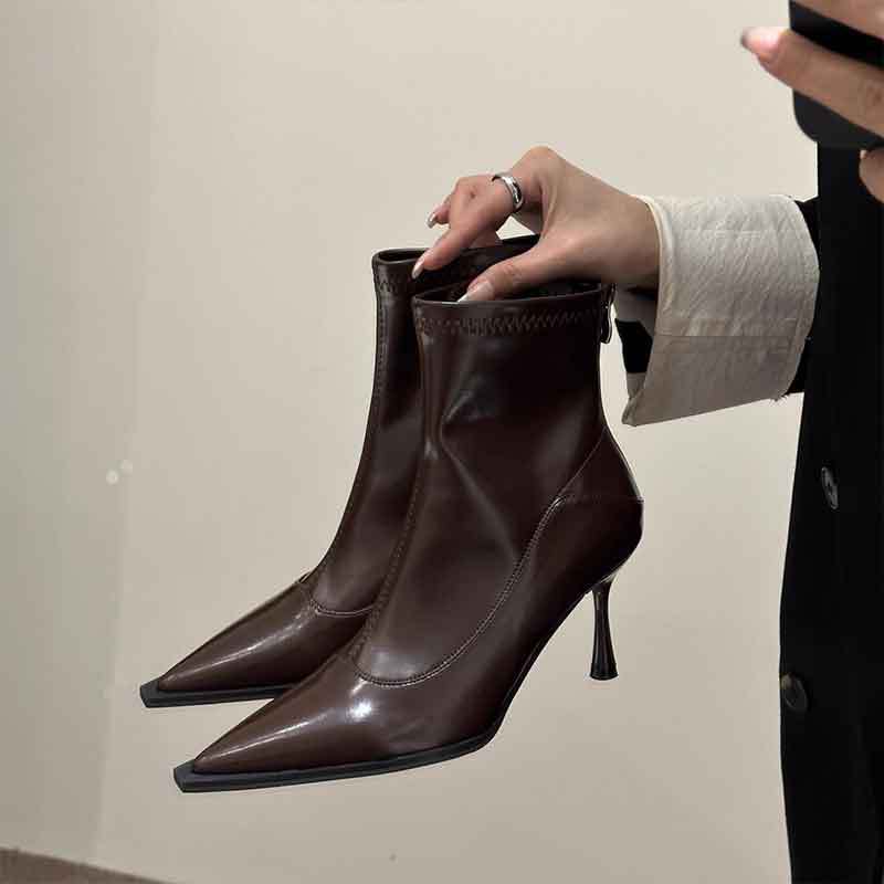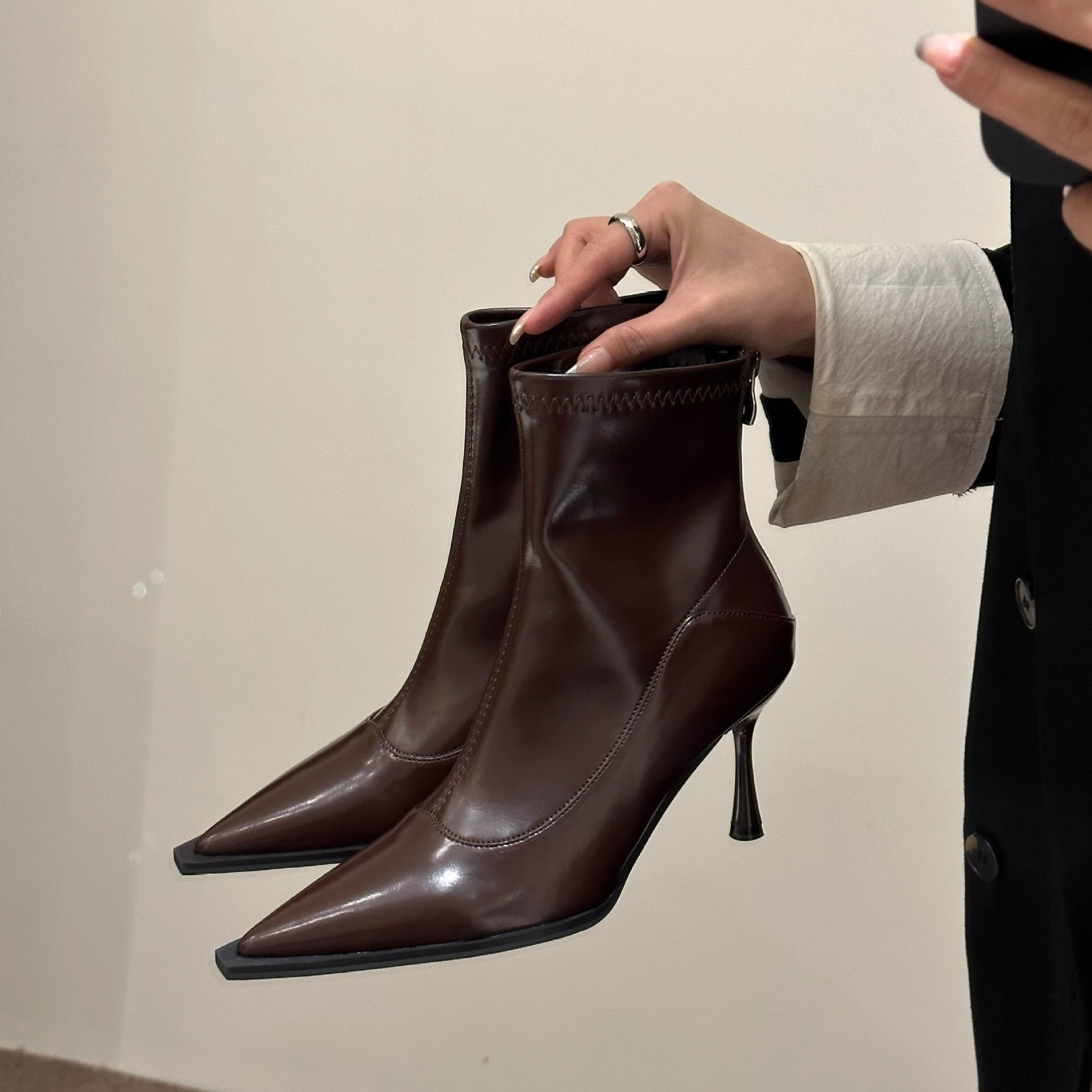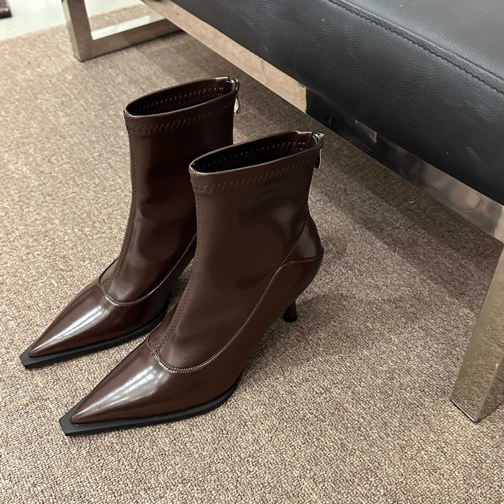 높은 굽 뾰족한 발목 부츠 2025 가을 및 겨울 새로운 유럽과 미국의 얇은 굽 바느질 알몸 부츠 얇은 부츠 레트로 다크 브라운 발목 부츠