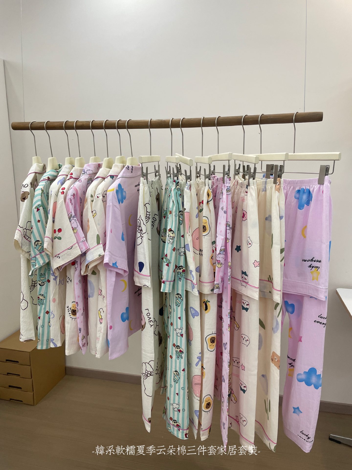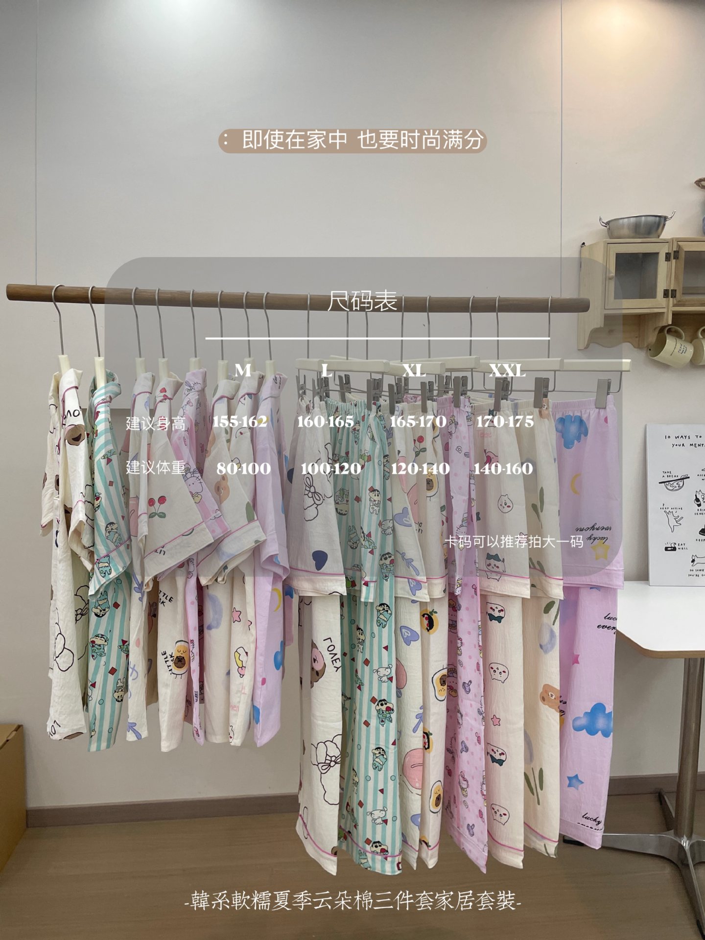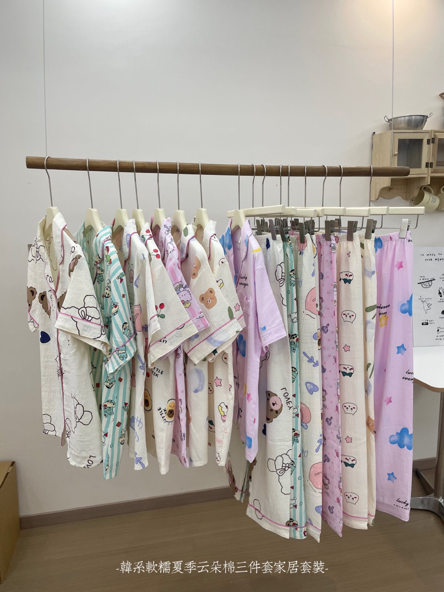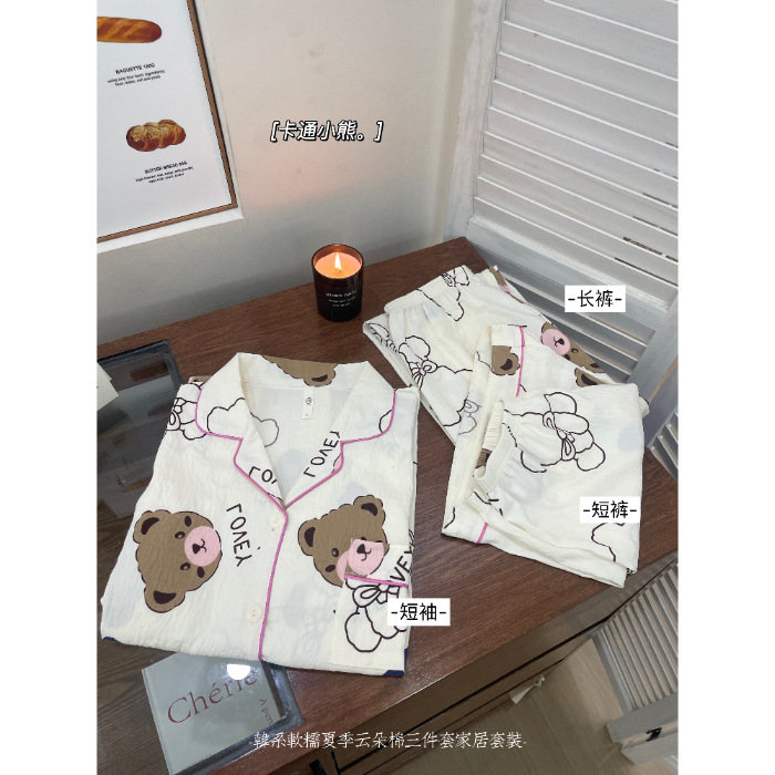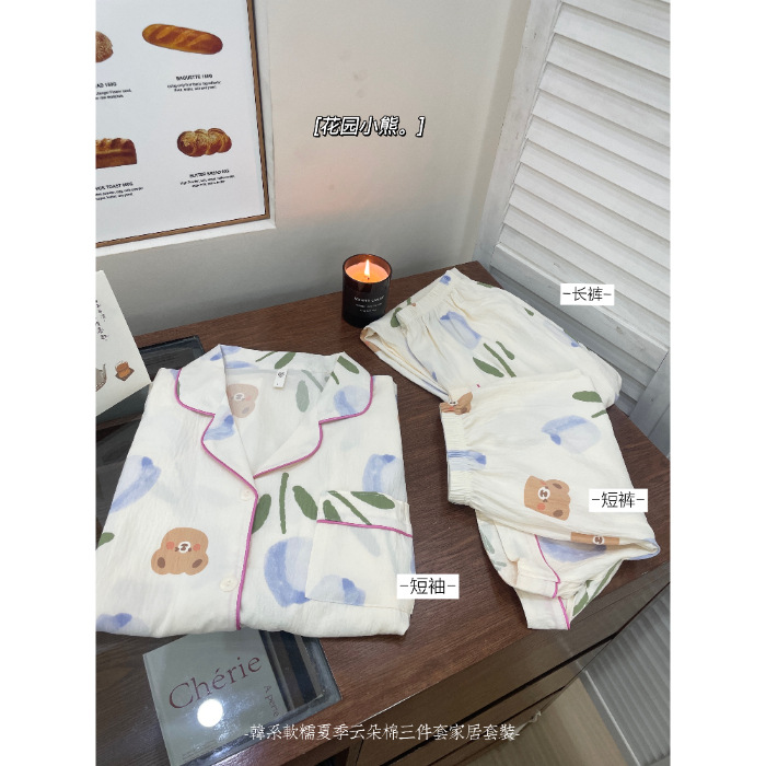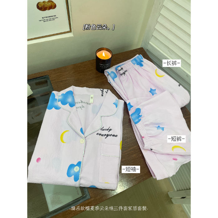 재고 라이브 120g 구름 면 3 조각 잠옷 여성 가을 달콤한 반팔 반바지 바지 홈 옷스토어 가기