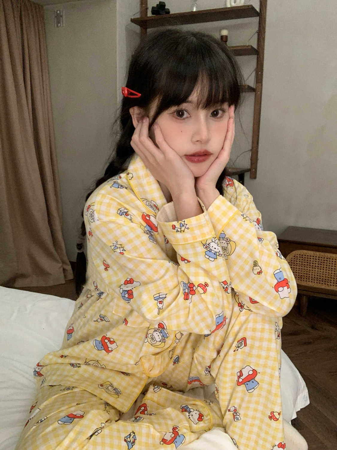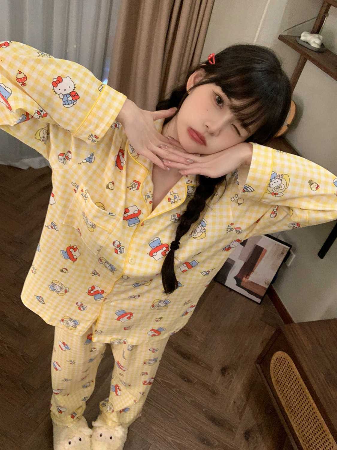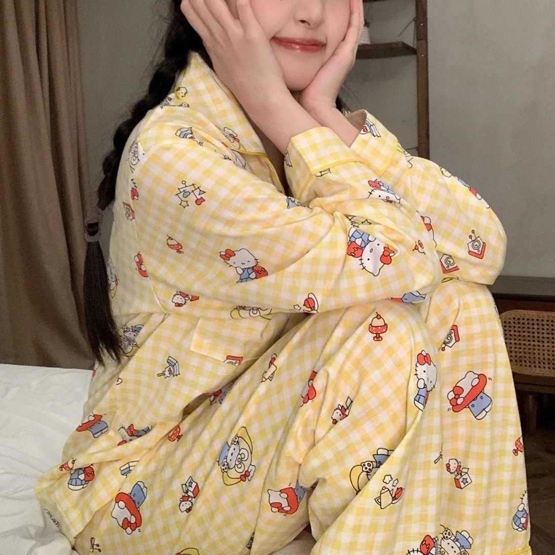 격자 무늬 hellokitty 파자마 여성의 봄과 가을 새로운 긴 소매 바지 일본식 만화 홈 의류 세트 외부 착용스토어 가기