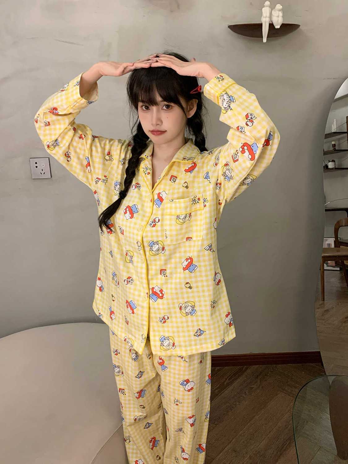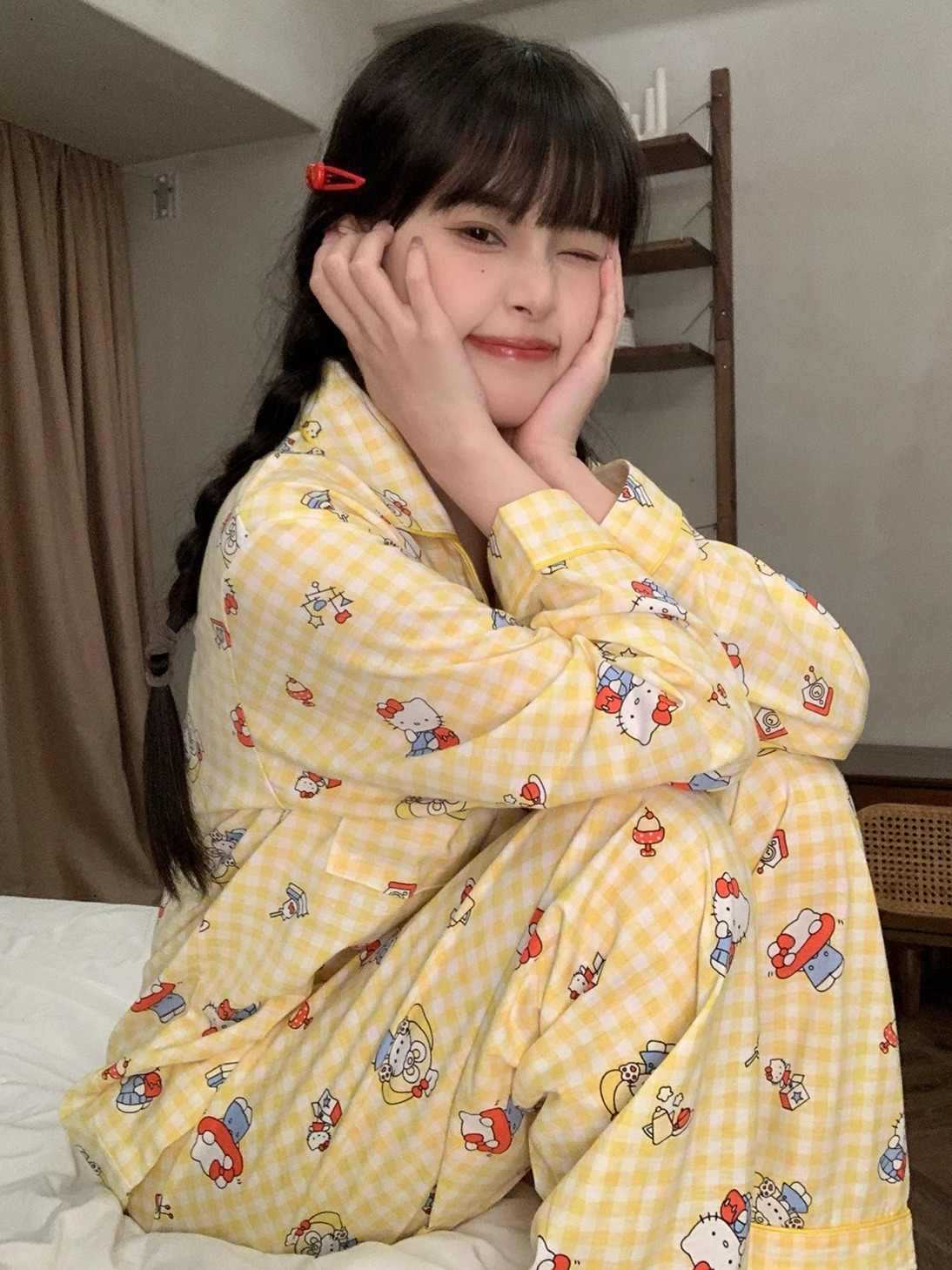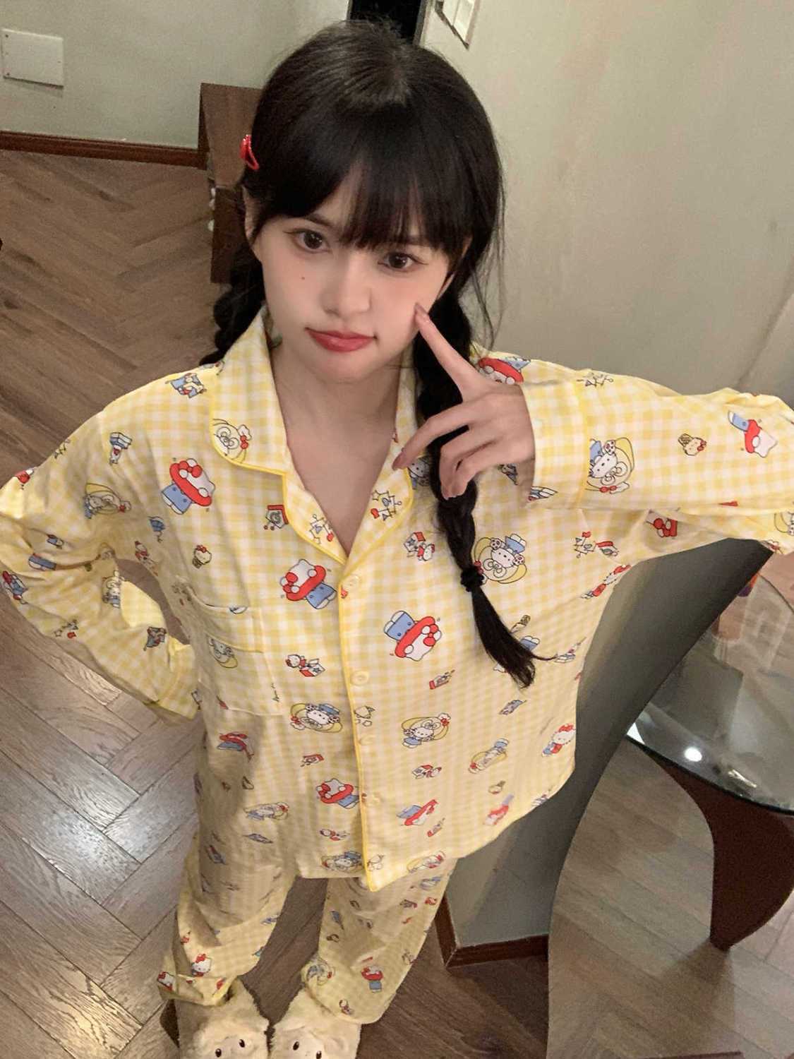 격자 무늬 hellokitty 파자마 여성의 봄과 가을 새로운 긴 소매 바지 일본식 만화 홈 의류 세트 외부 착용스토어 가기