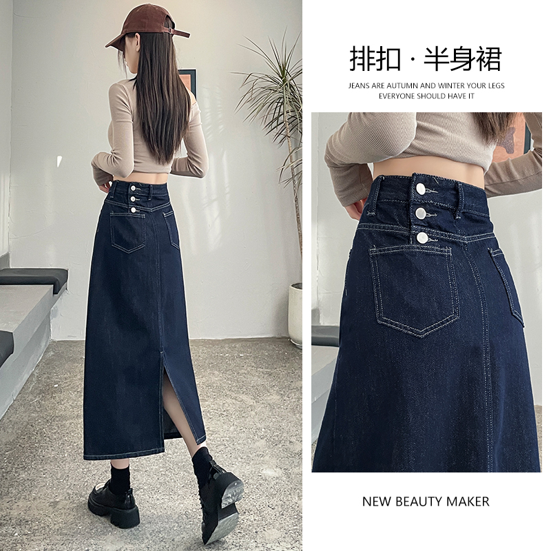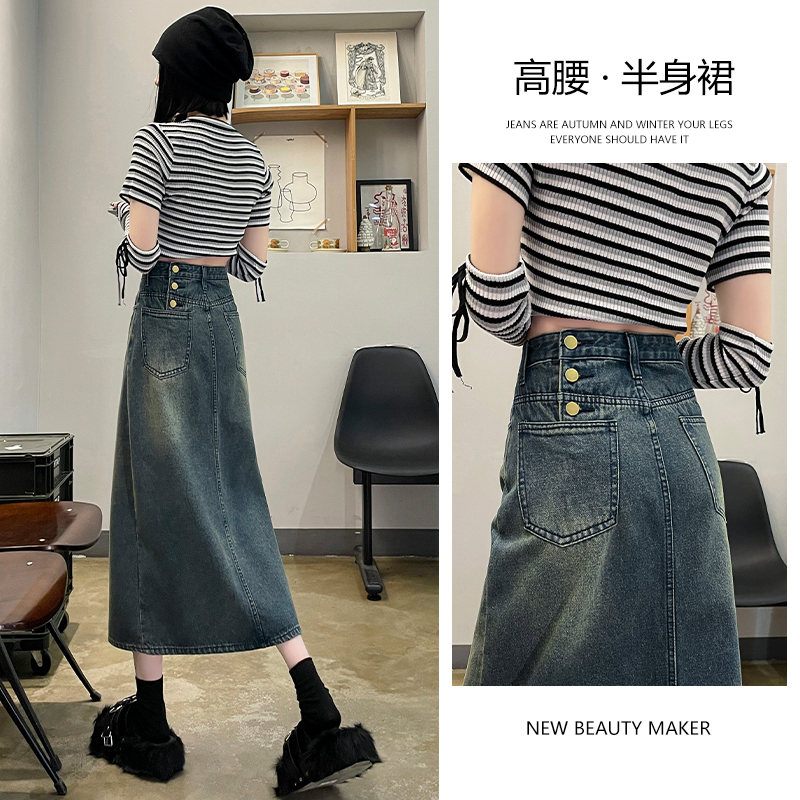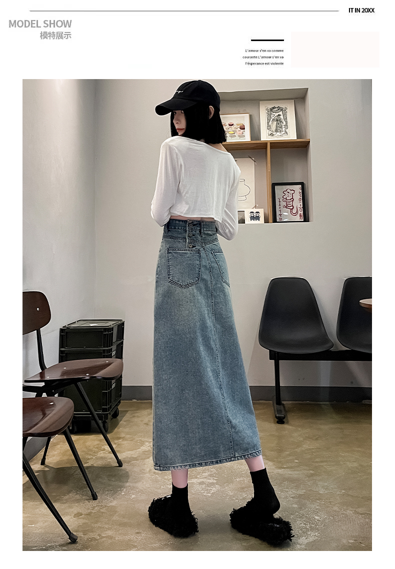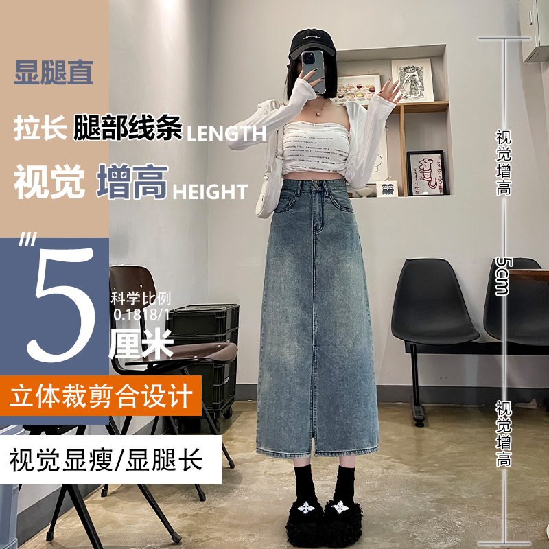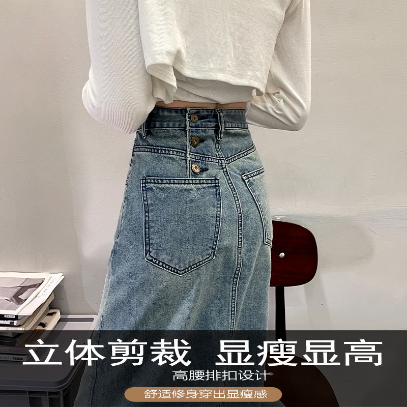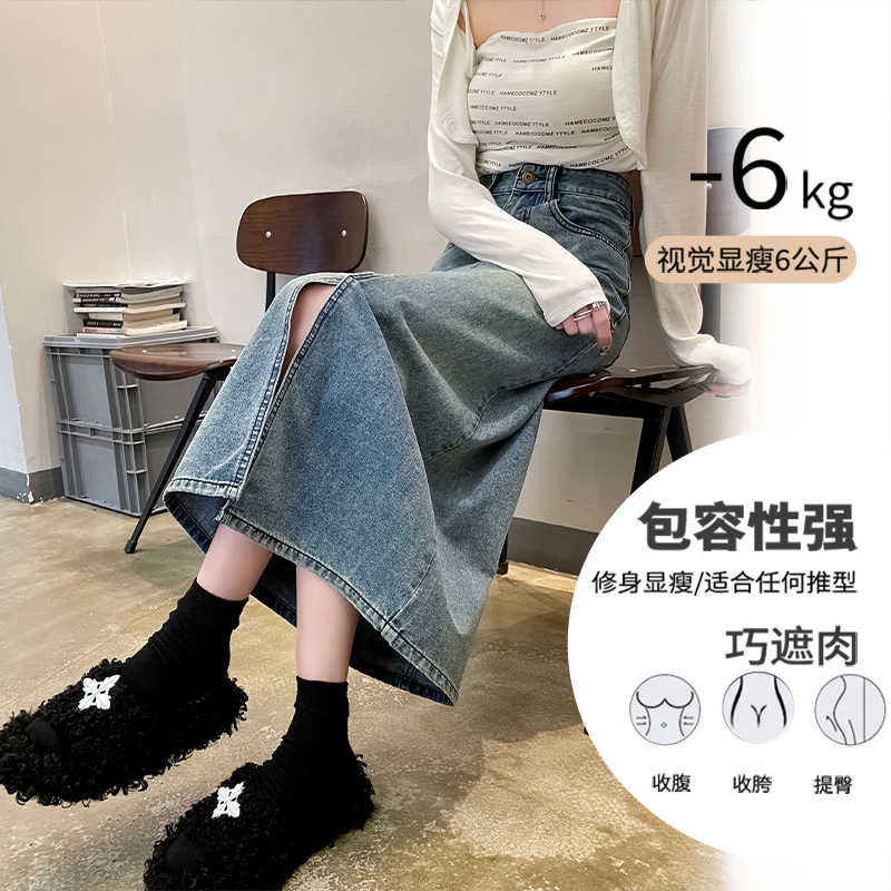 데님 치마 여자 치마 2025 봄 새로운 높은 허리 가슴 쪼개지는 A-라인 스커트 엉덩이 스커트 중간 길이 치마스토어 가기