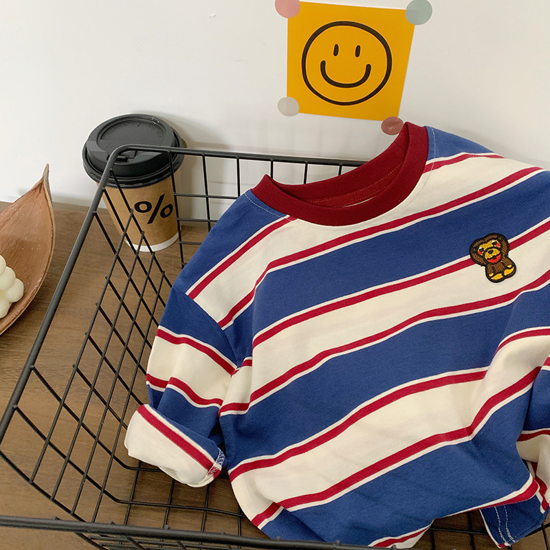 남성용 긴팔 티셔츠 느슨한 유행 봄 어린이 순면 통기성 줄무늬 세련된 티셔츠 탑 트렌디 한 만화 원숭이스토어 가기