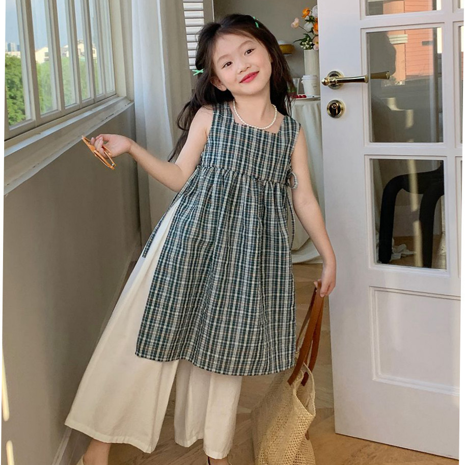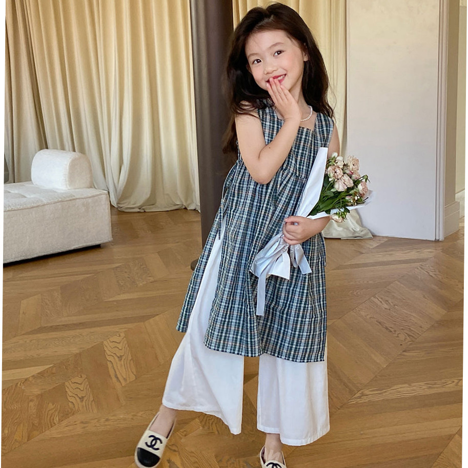소녀 세트 여름 새로운 한국식 격자 무늬 블라우스 어린이를위한 와이드 레그 바지 2 피스 세트스토어 가기