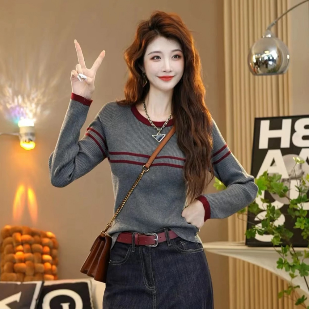 빨간 줄무늬 스웨터 긴 소매 가을 2024 새로운 플러스 사이즈 통통녀 슬리밍 바닥 탑스토어 가기