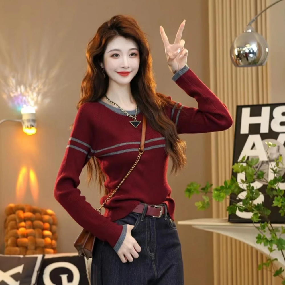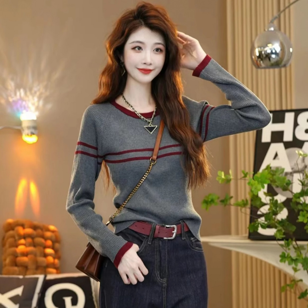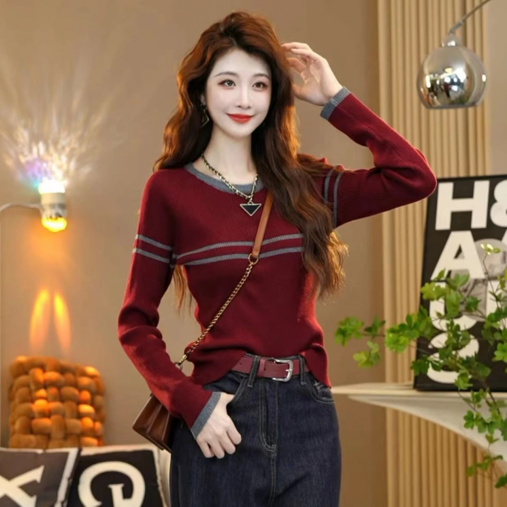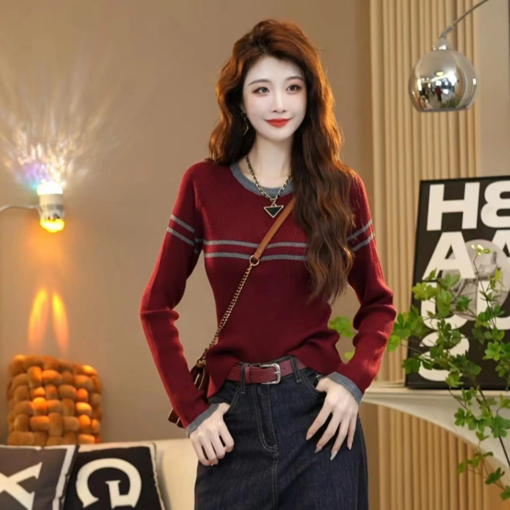 빨간 줄무늬 스웨터 긴 소매 가을 2024 새로운 플러스 사이즈 통통녀 슬리밍 바닥 탑