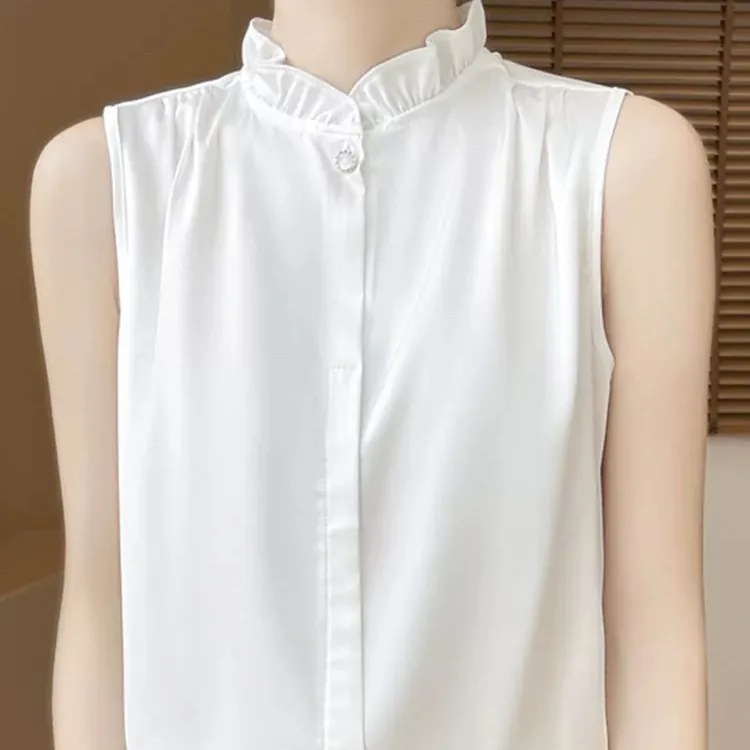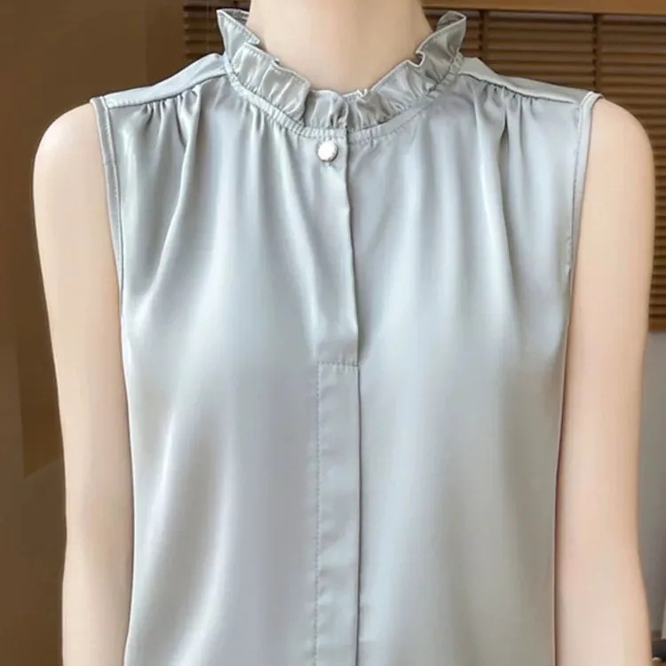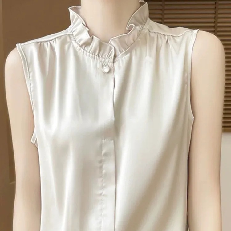 프랑스 스타일 민소매 귀 칼라 기지 2025 여름 새로운 새틴 연꽃 잎 셔츠 최고 감각 조끼