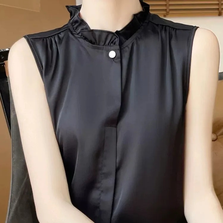 프랑스 스타일 민소매 귀 칼라 기지 2025 여름 새로운 새틴 연꽃 잎 셔츠 최고 감각 조끼스토어 가기