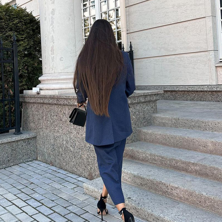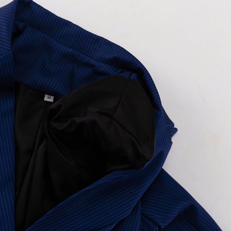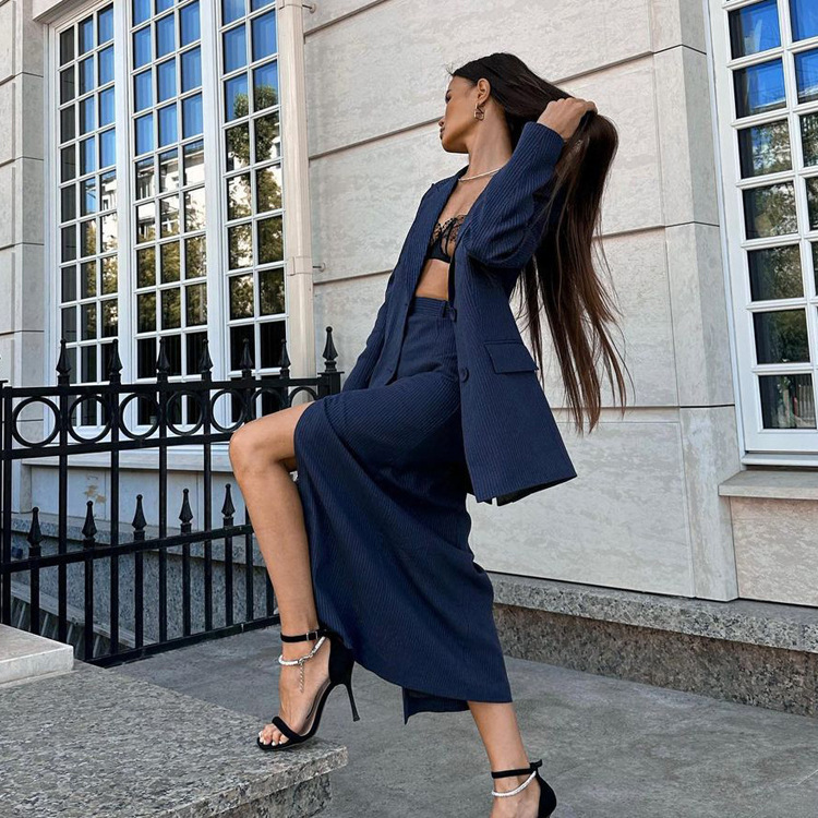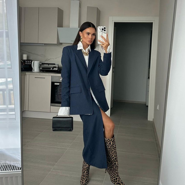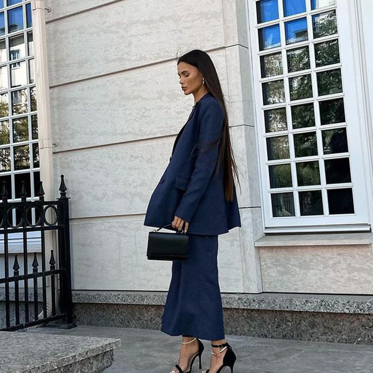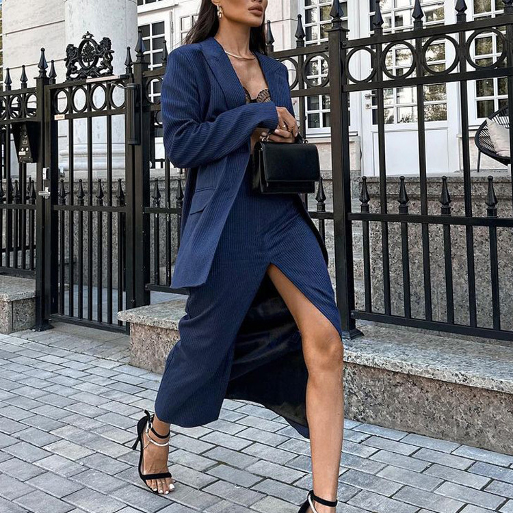 유럽과 미국의 패션 하이 엔드 센스 스트라이프 세트 여성용 옷깃 긴팔 탑 세트 하이 허리 스플릿 스커트 투피스 세트스토어 가기