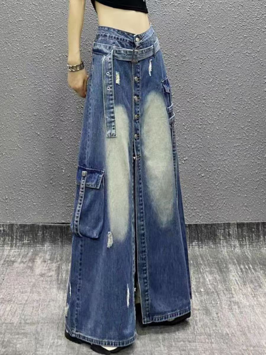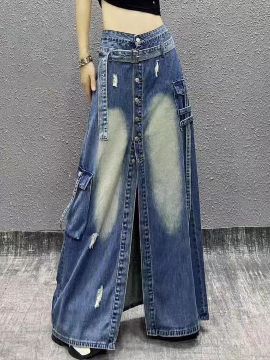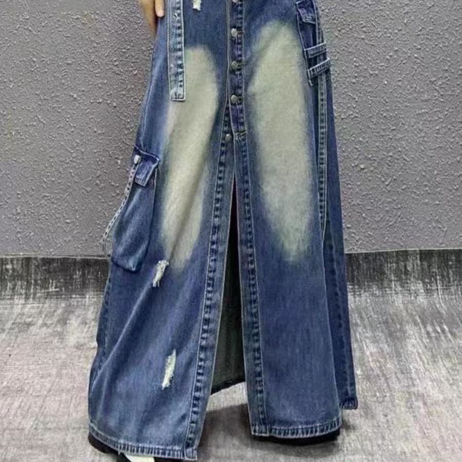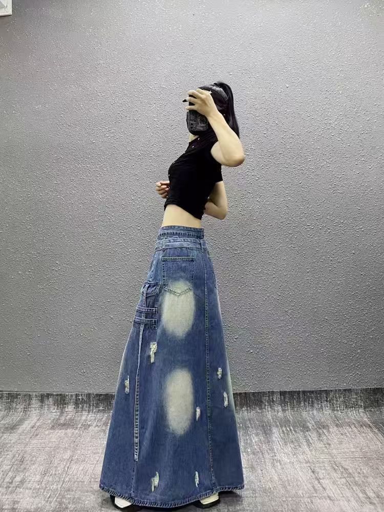 2025 새로운 봄 하이 엔드 서양식 하이 웨이스트 슬리밍 스플리트 버클 찢어진 데님 스커트 여자 A-라인 스커트