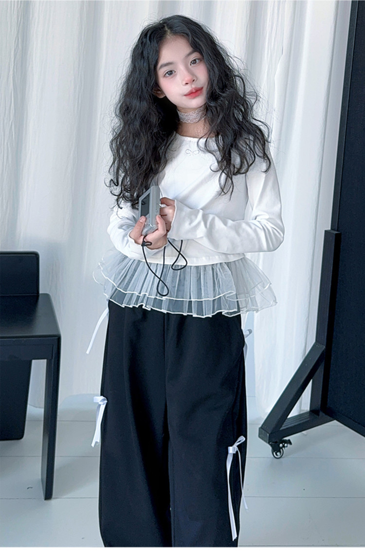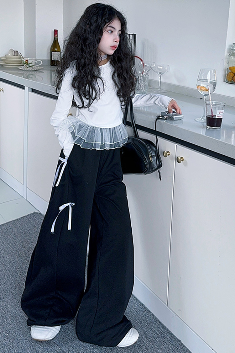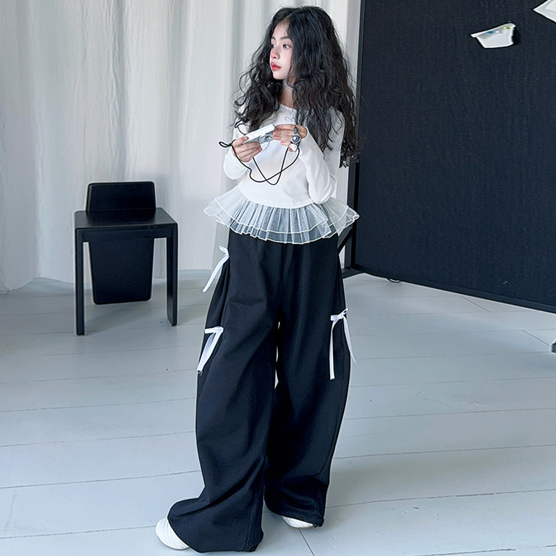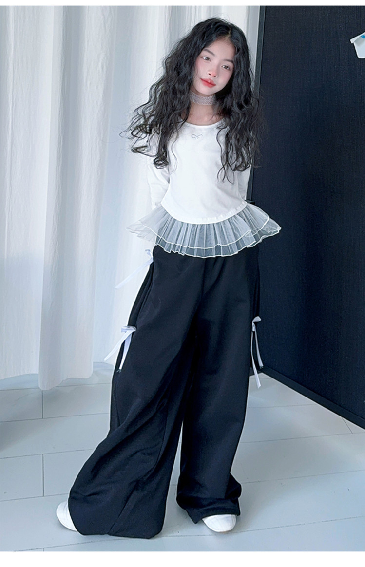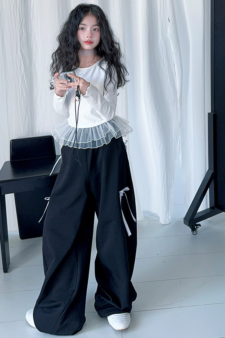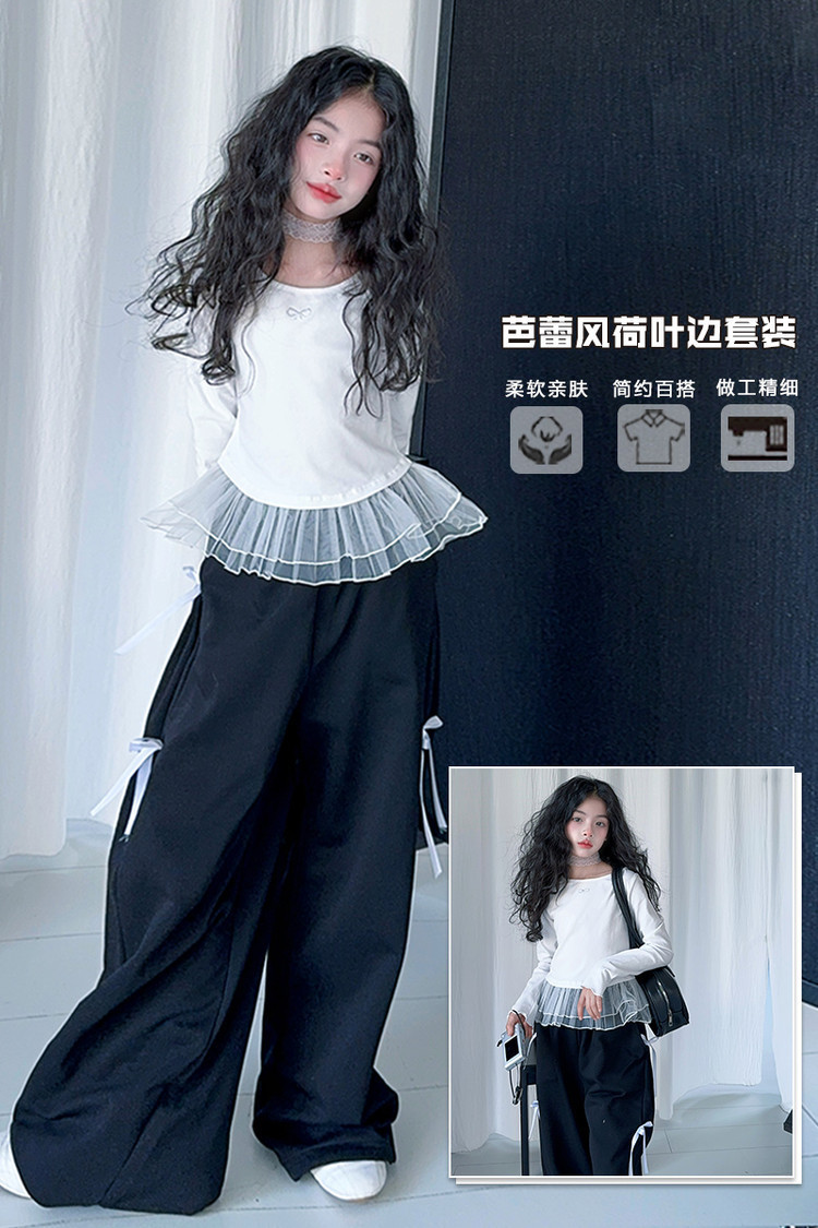 여자 달콤한 시원한 봄 세트 스타일 중년 키즈 한 팬 캐주얼 러플 긴팔 티셔츠 유행 와이드 레그 바지 투피스 세트