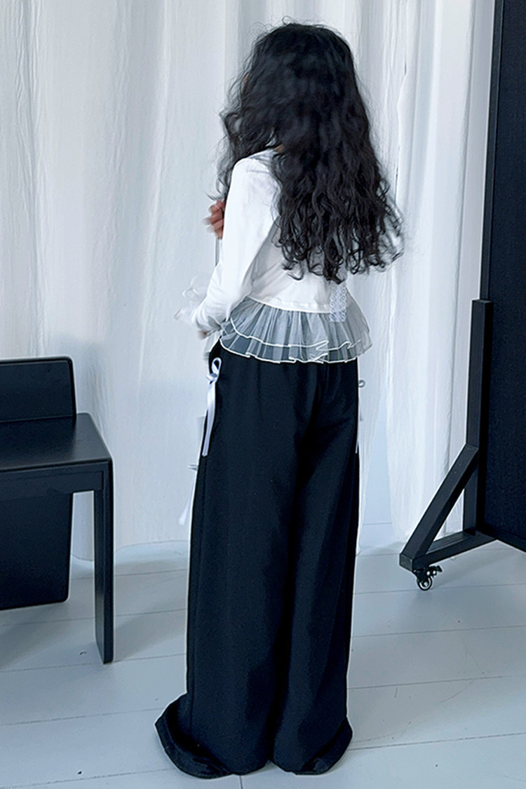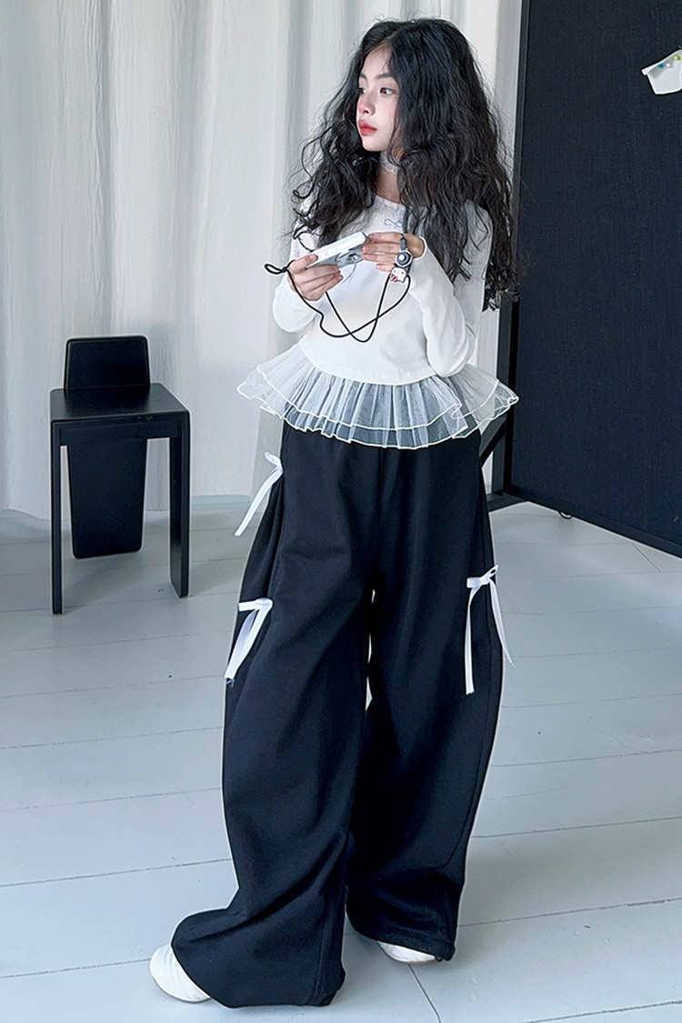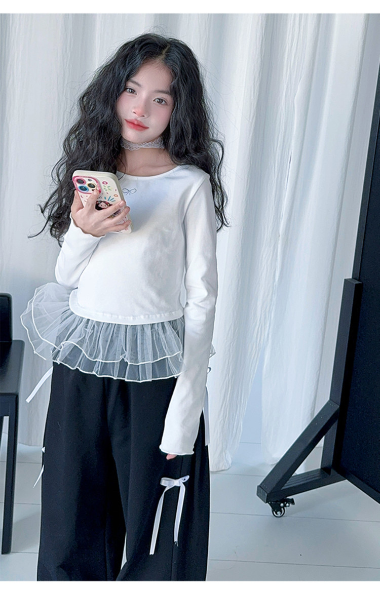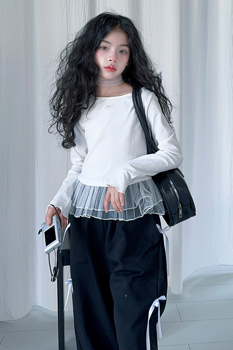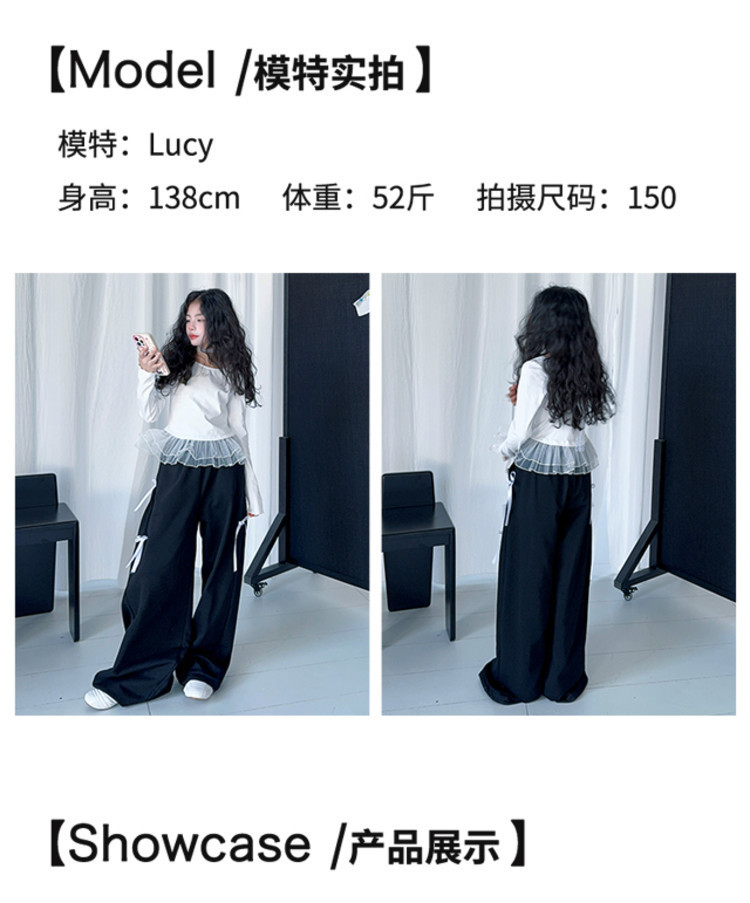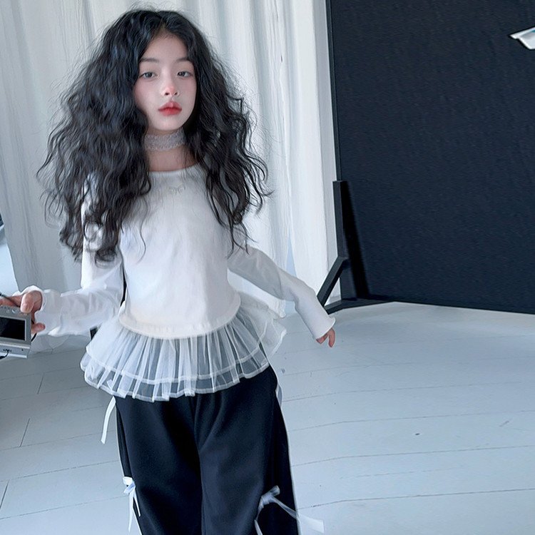 여자 달콤한 시원한 봄 세트 스타일 중년 키즈 한 팬 캐주얼 러플 긴팔 티셔츠 유행 와이드 레그 바지 투피스 세트