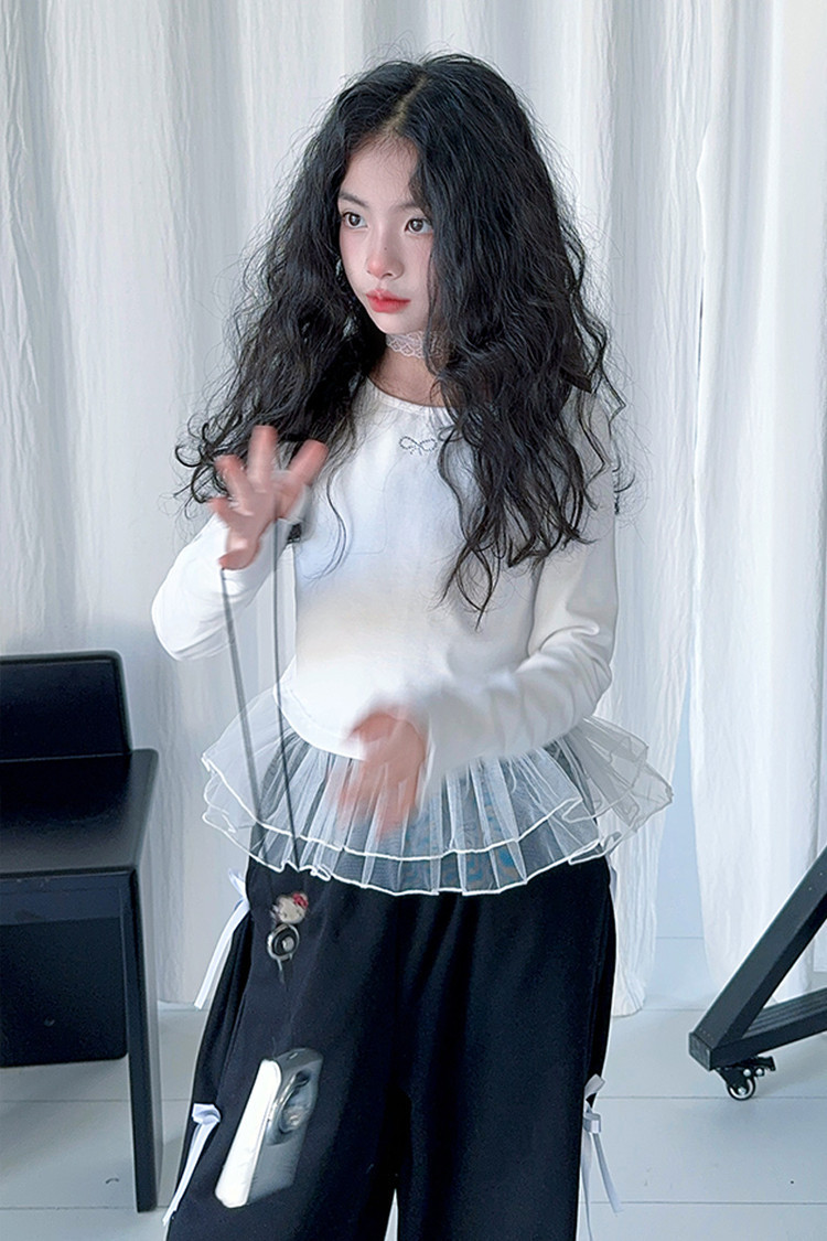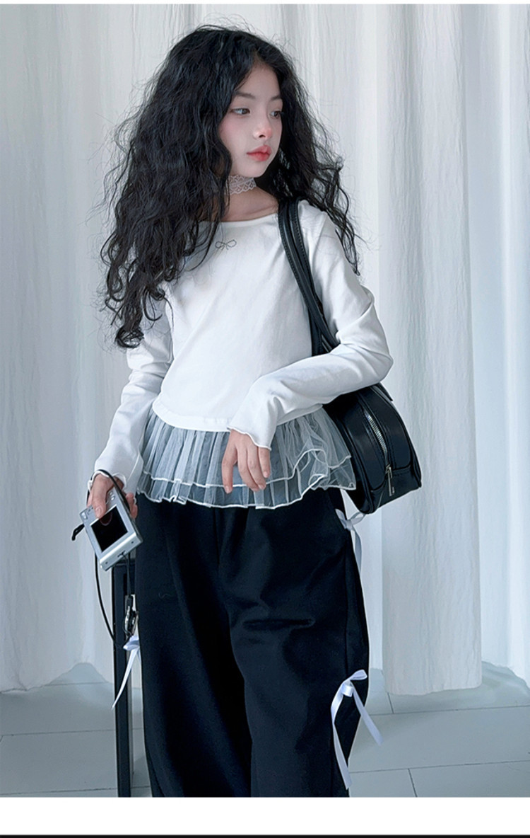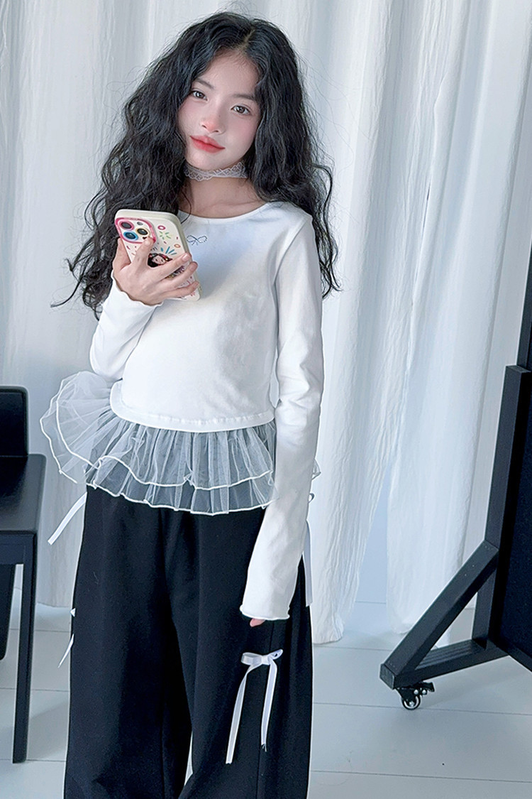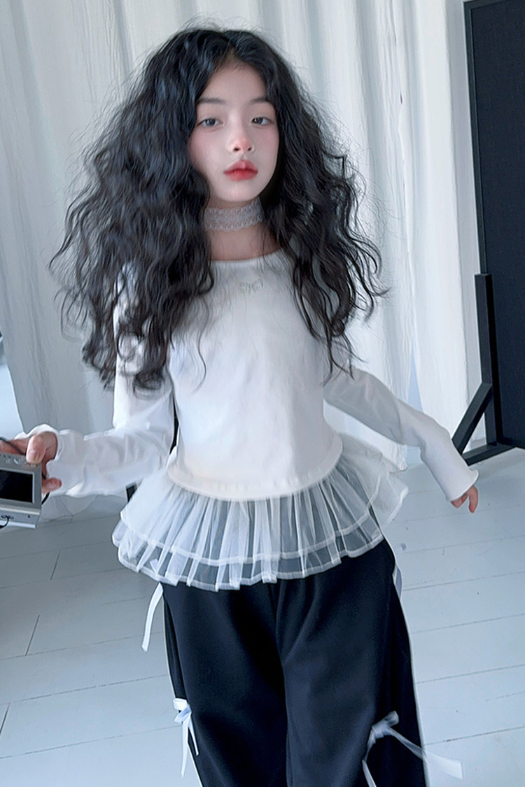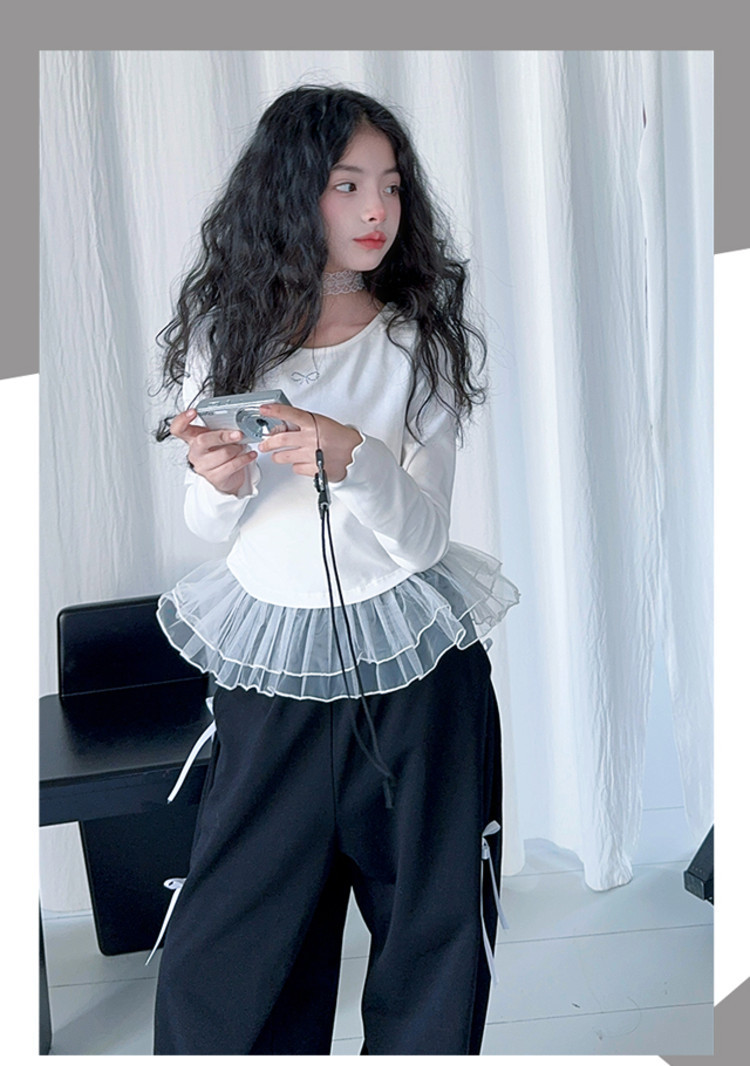 여자 달콤한 시원한 봄 세트 스타일 중년 키즈 한 팬 캐주얼 러플 긴팔 티셔츠 유행 와이드 레그 바지 투피스 세트