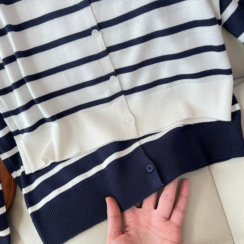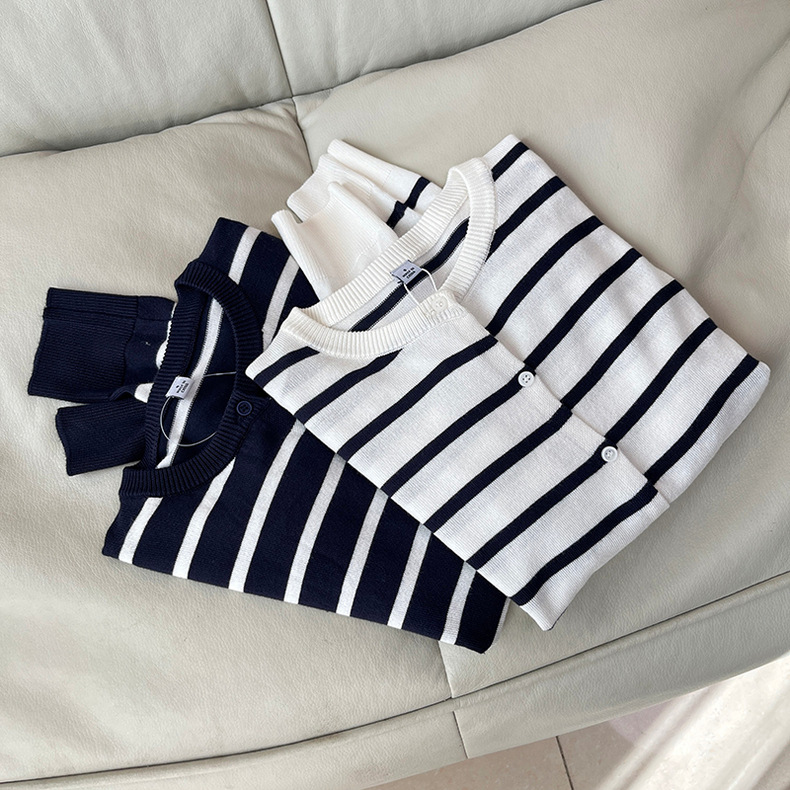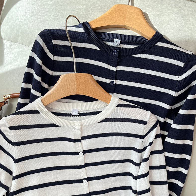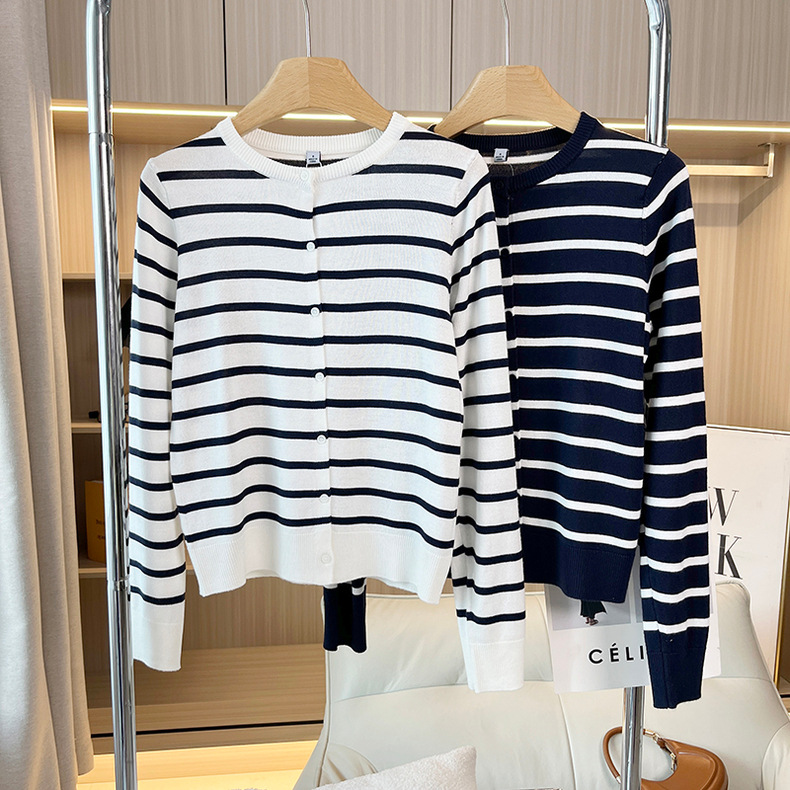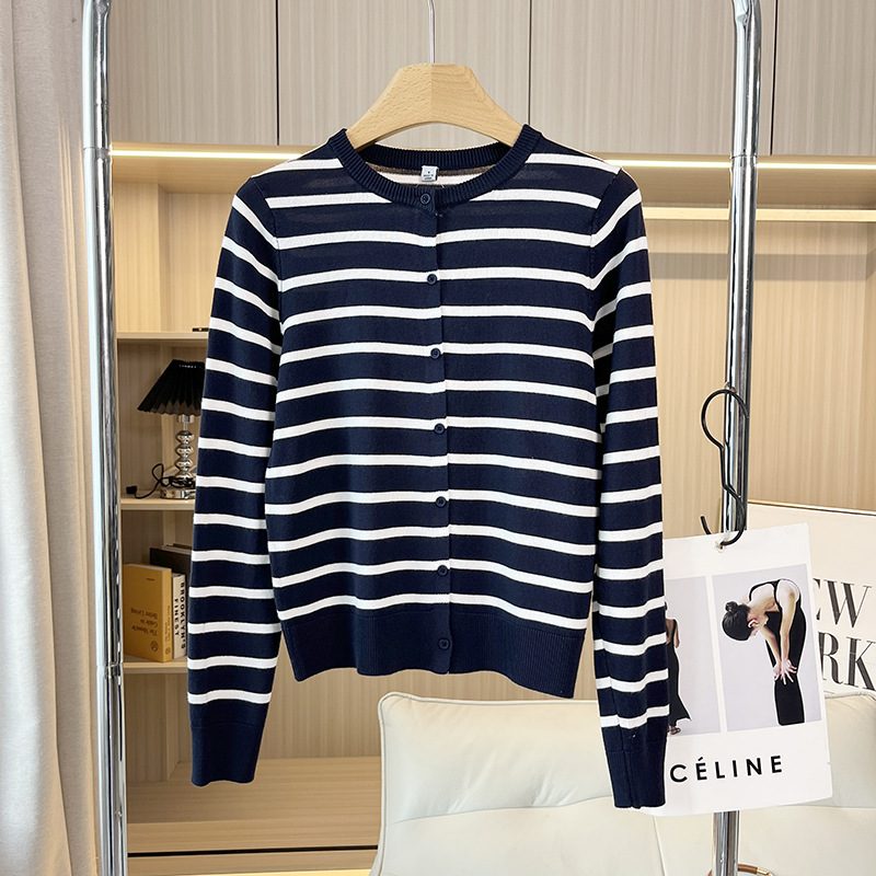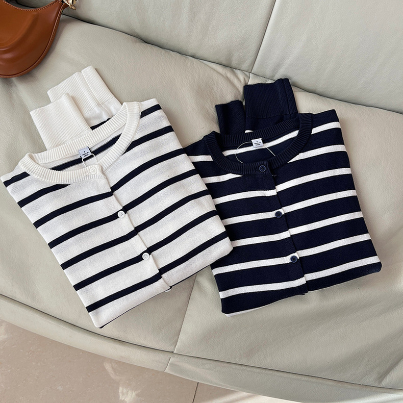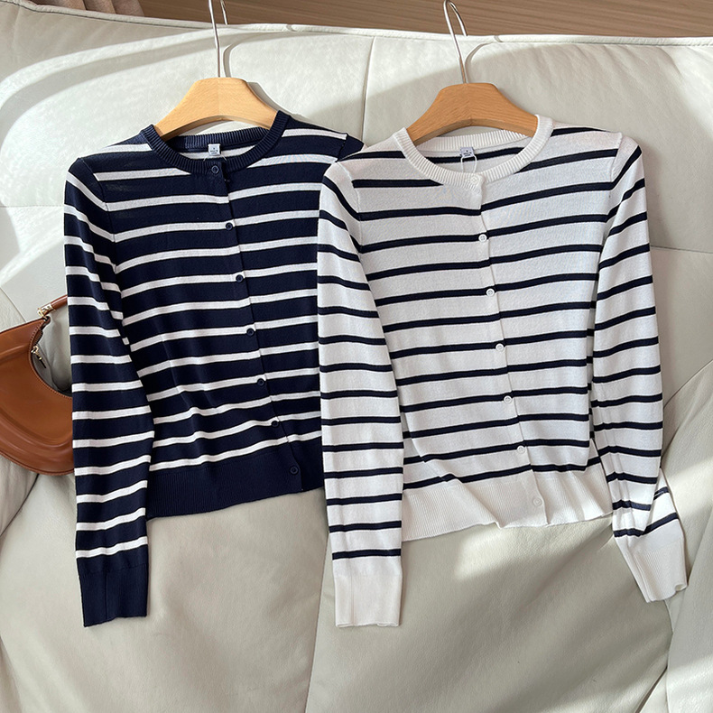 피팅 룸 여성 의류 25 이른 봄 코튼 블렌드 크루 넥 스트라이프 니트 카디건 여성용 긴 소매 에어컨베이스 셔츠 476975