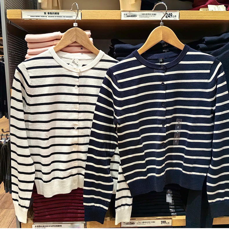 피팅 룸 여성 의류 25 이른 봄 코튼 블렌드 크루 넥 스트라이프 니트 카디건 여성용 긴 소매 에어컨베이스 셔츠 476975스토어 가기