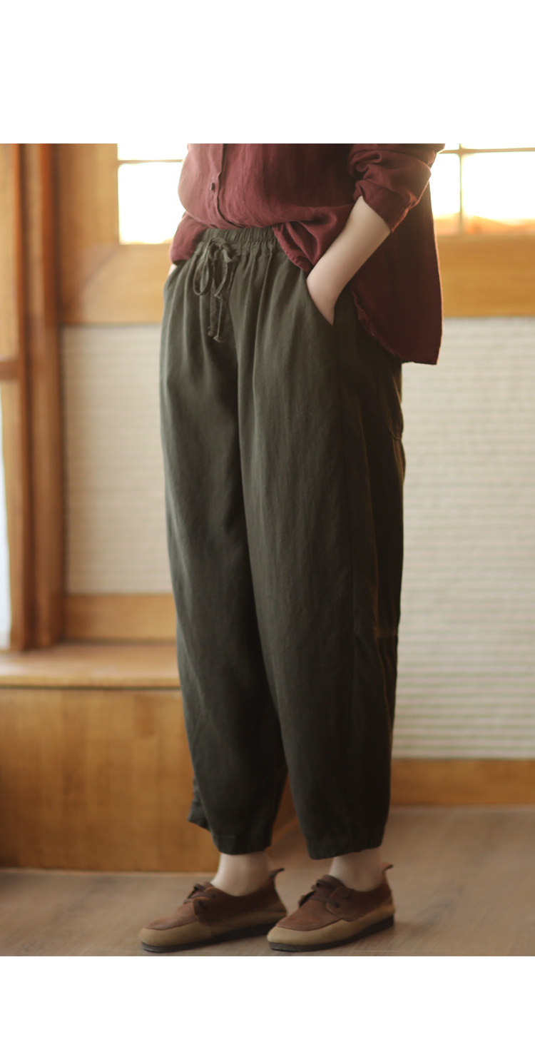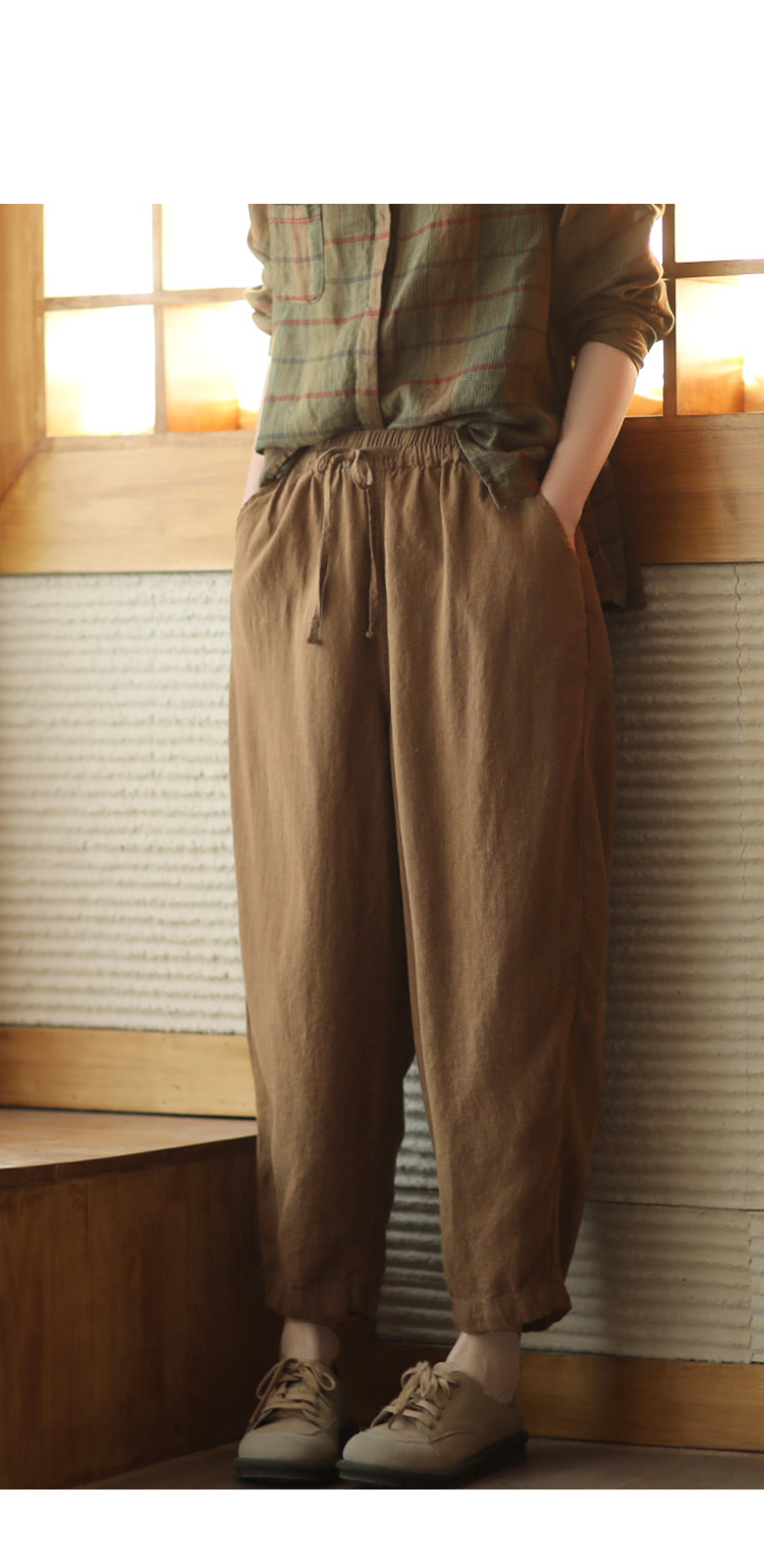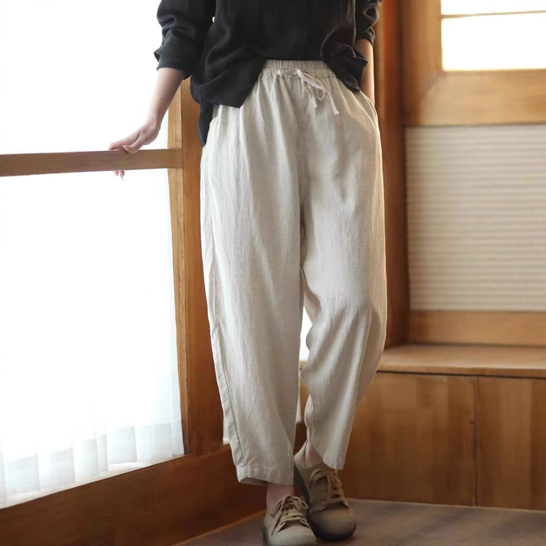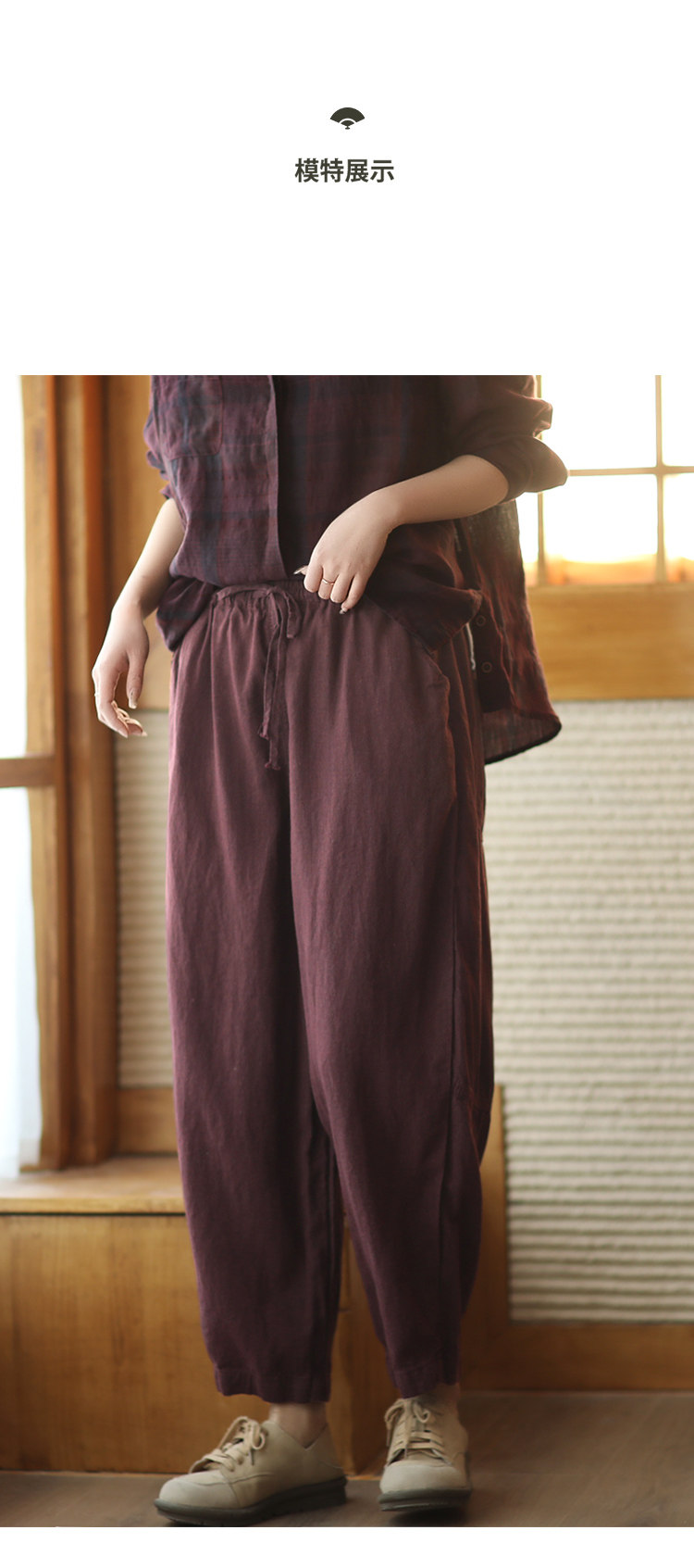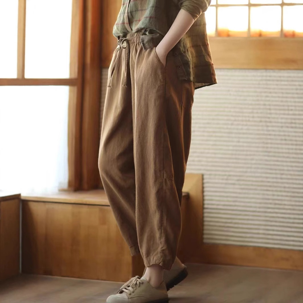 봄 2025 중공업 모래 세척 리넨 할란 바지 여성 레이스 업 느슨한 허리 슬리밍 캐주얼 바지 예술적 느슨한 린넨 바지스토어 가기