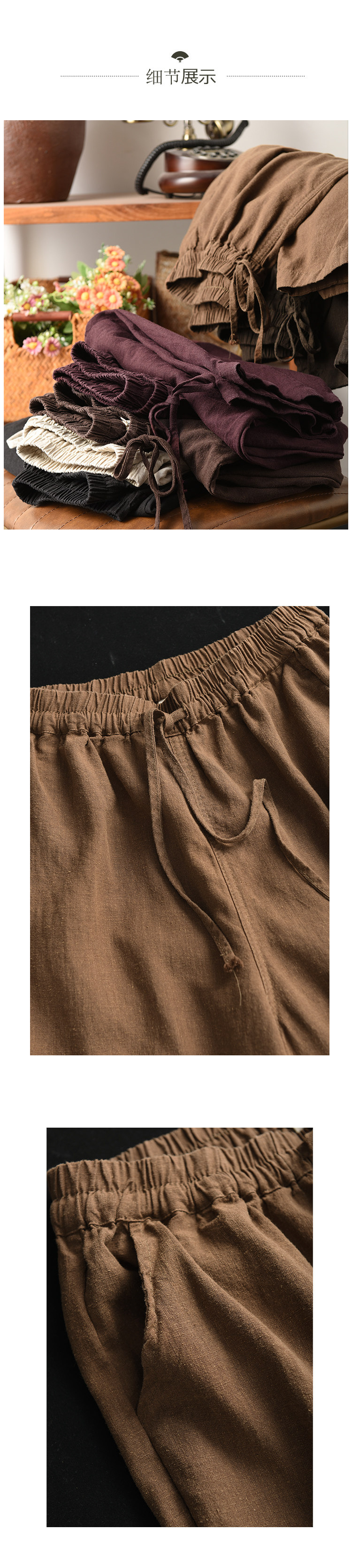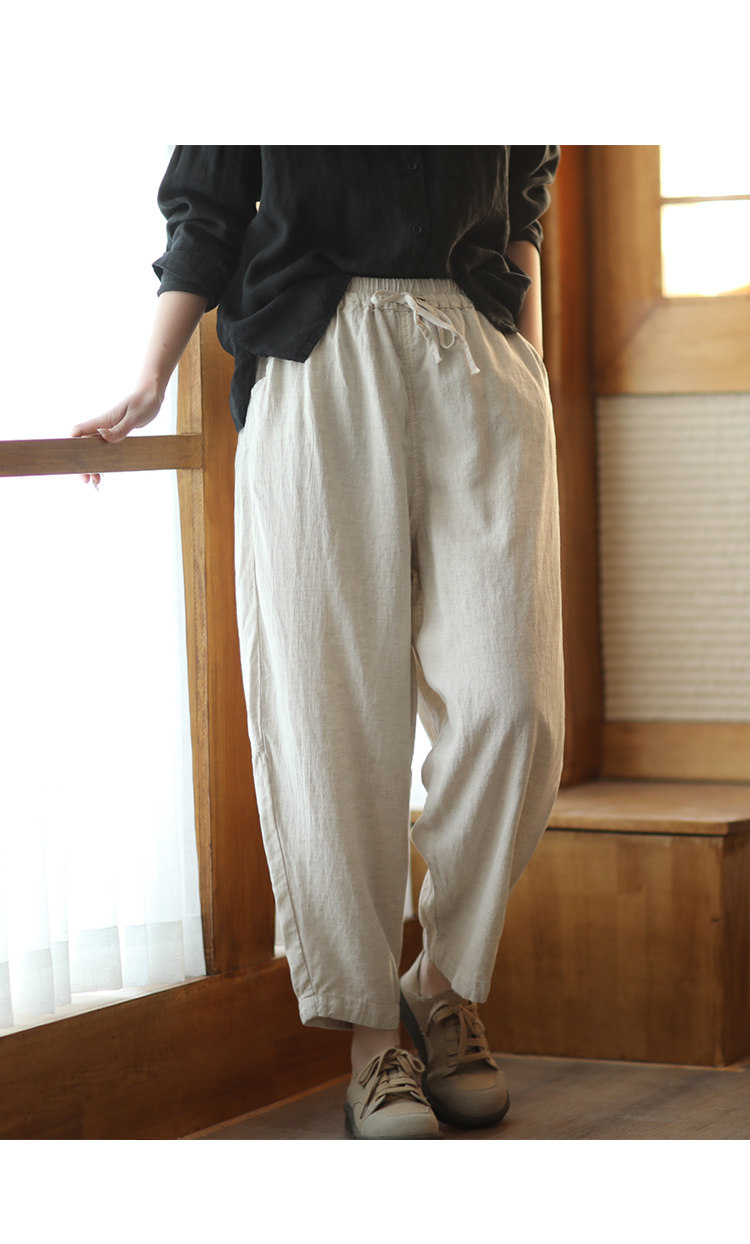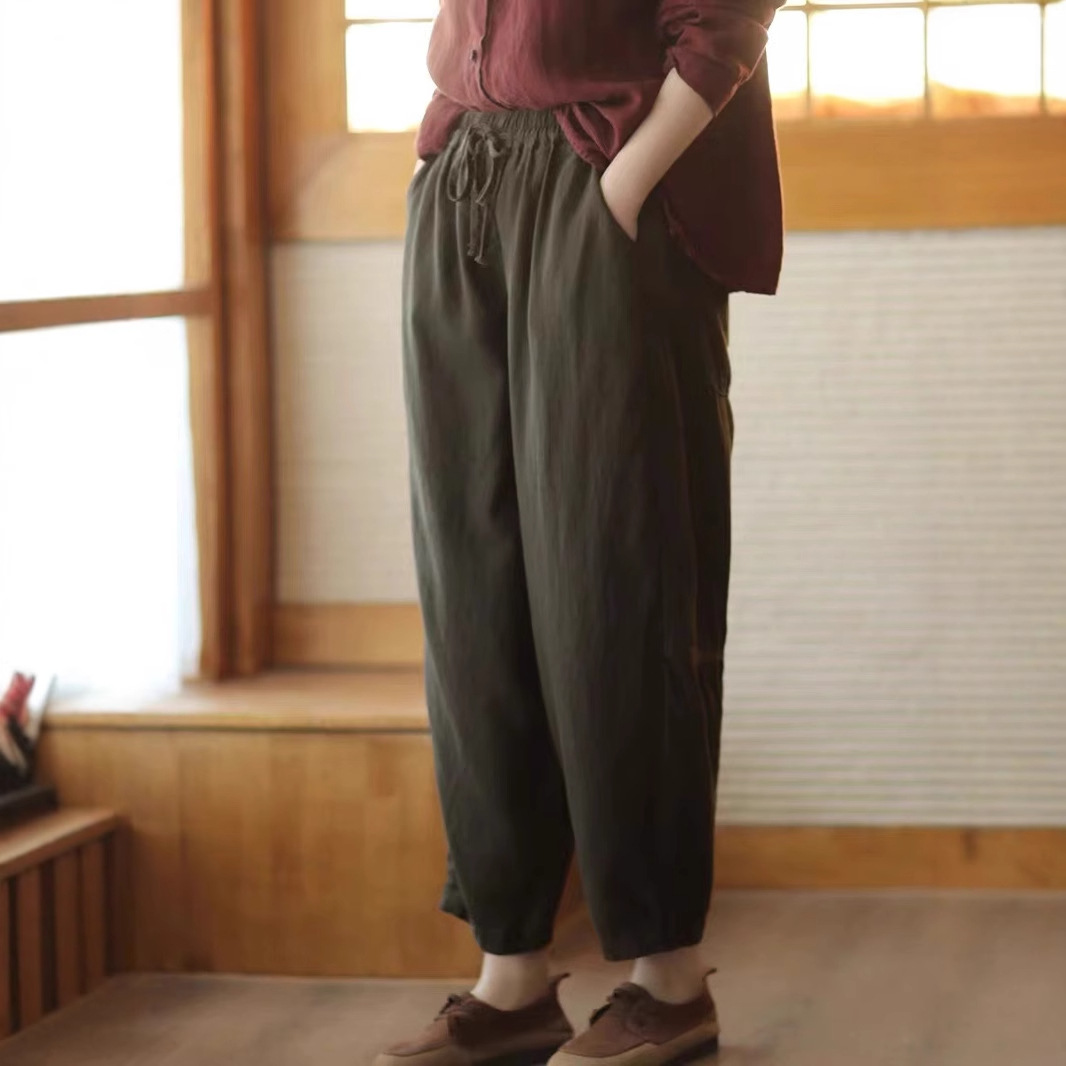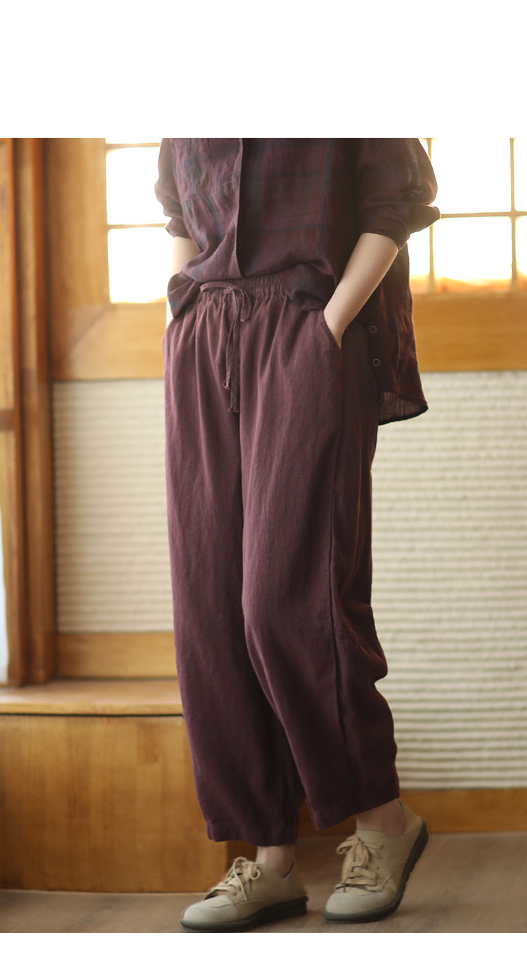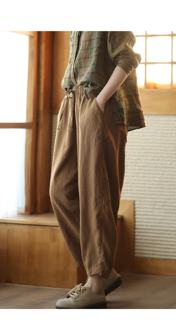 봄 2025 중공업 모래 세척 리넨 할란 바지 여성 레이스 업 느슨한 허리 슬리밍 캐주얼 바지 예술적 느슨한 린넨 바지스토어 가기
