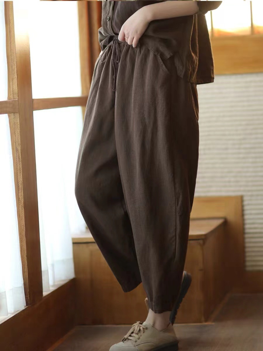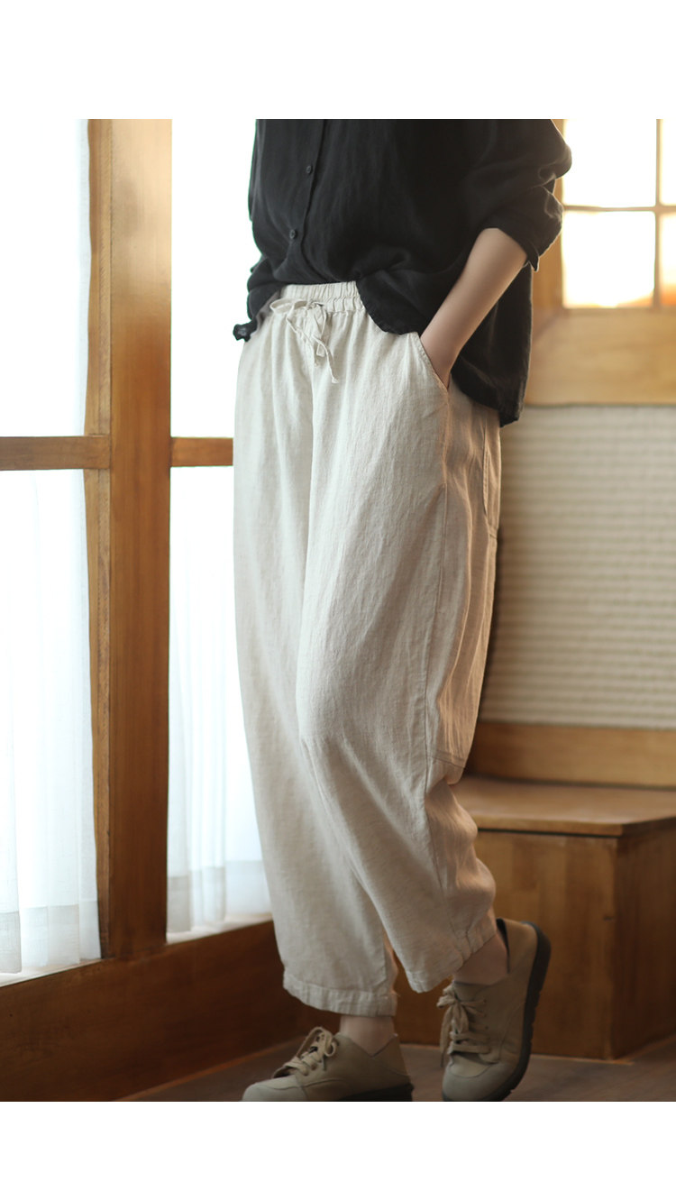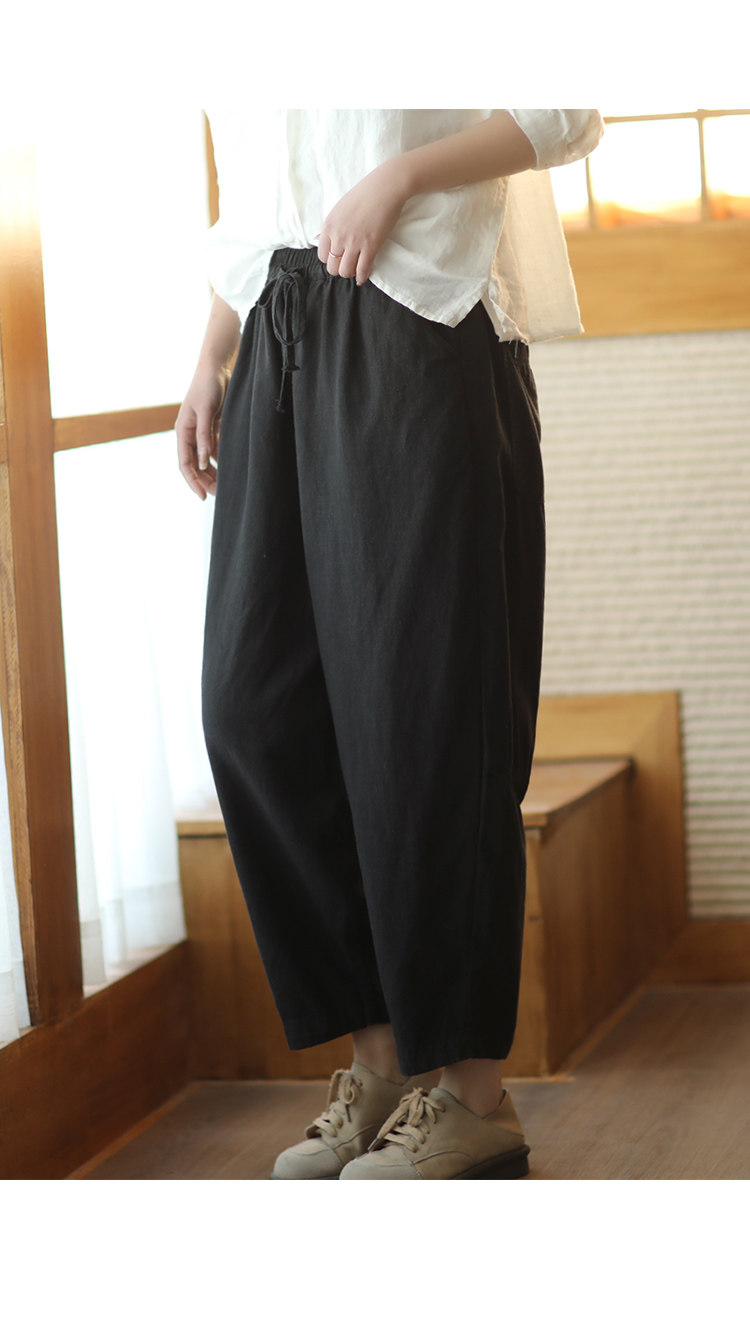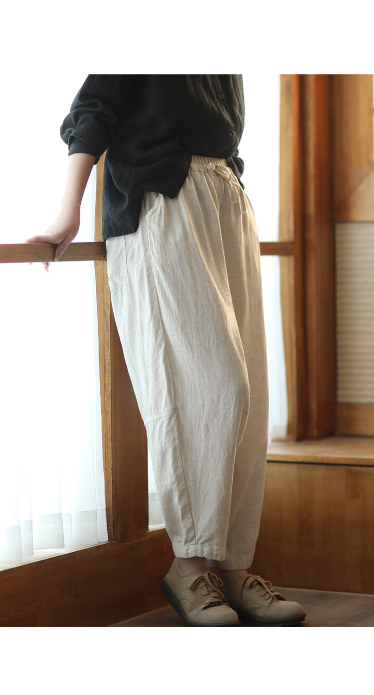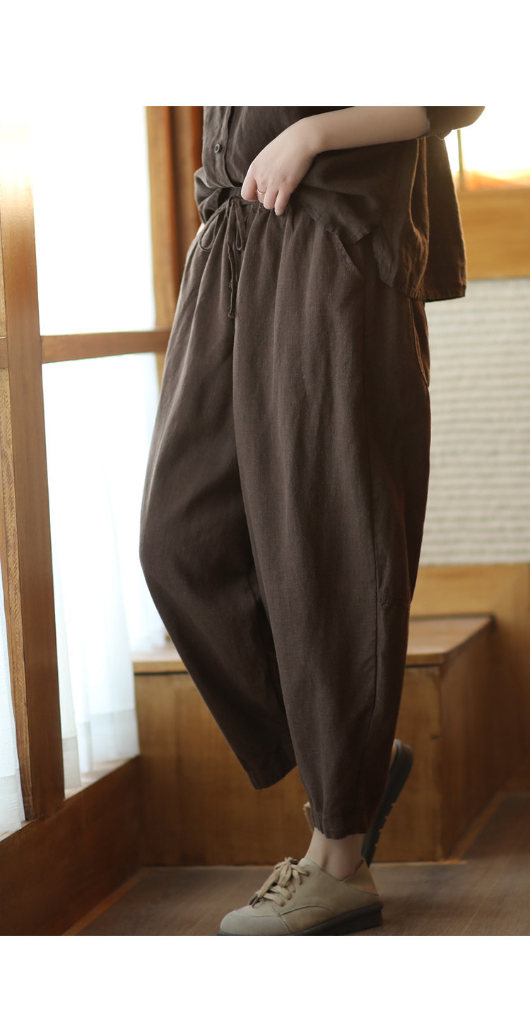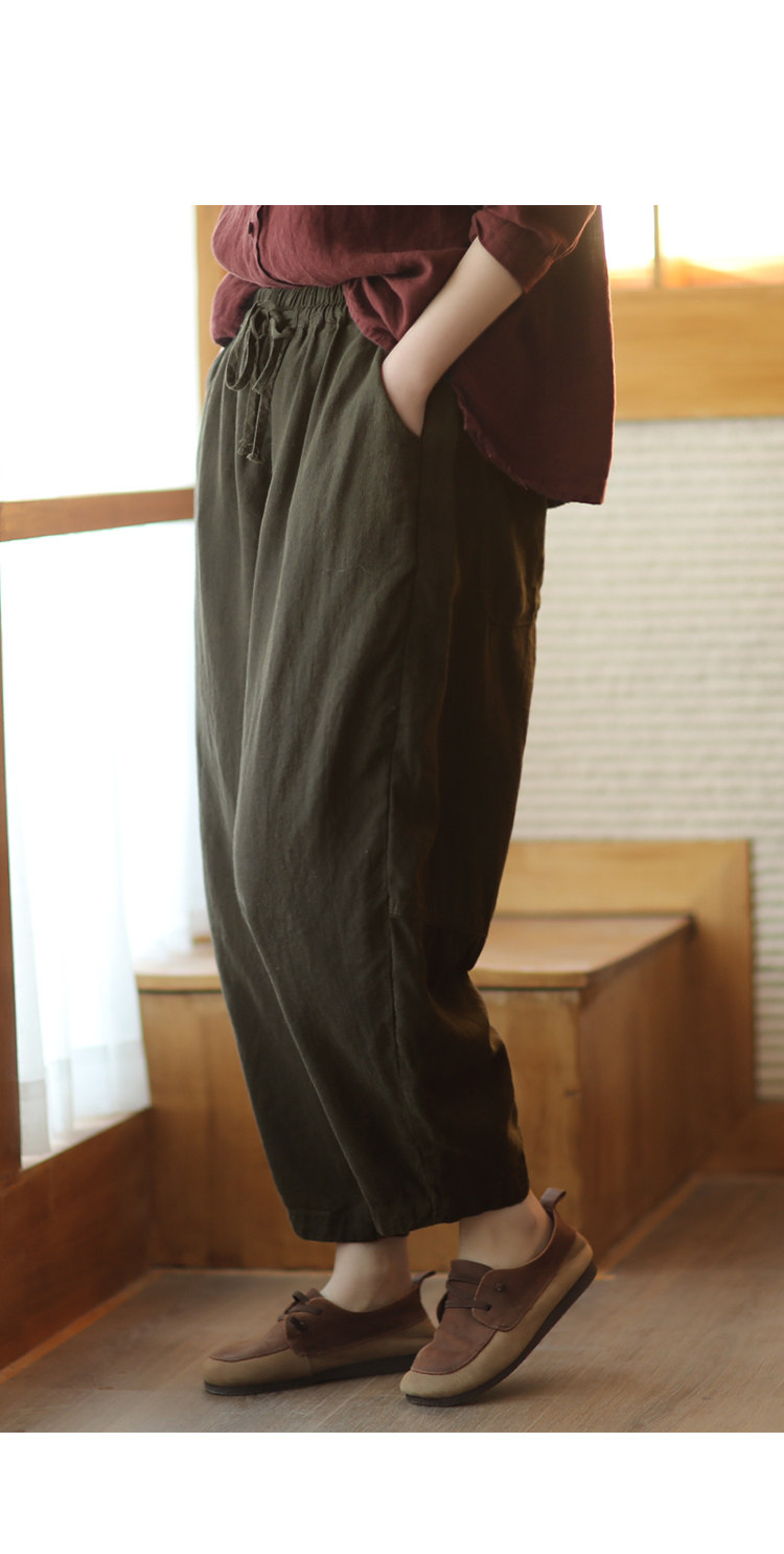 봄 2025 중공업 모래 세척 리넨 할란 바지 여성 레이스 업 느슨한 허리 슬리밍 캐주얼 바지 예술적 느슨한 린넨 바지스토어 가기