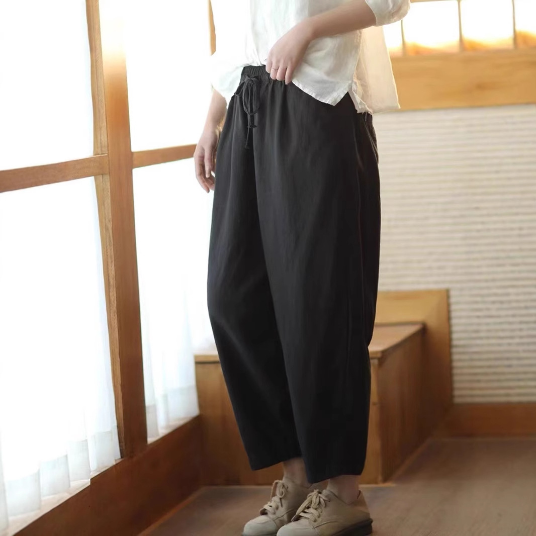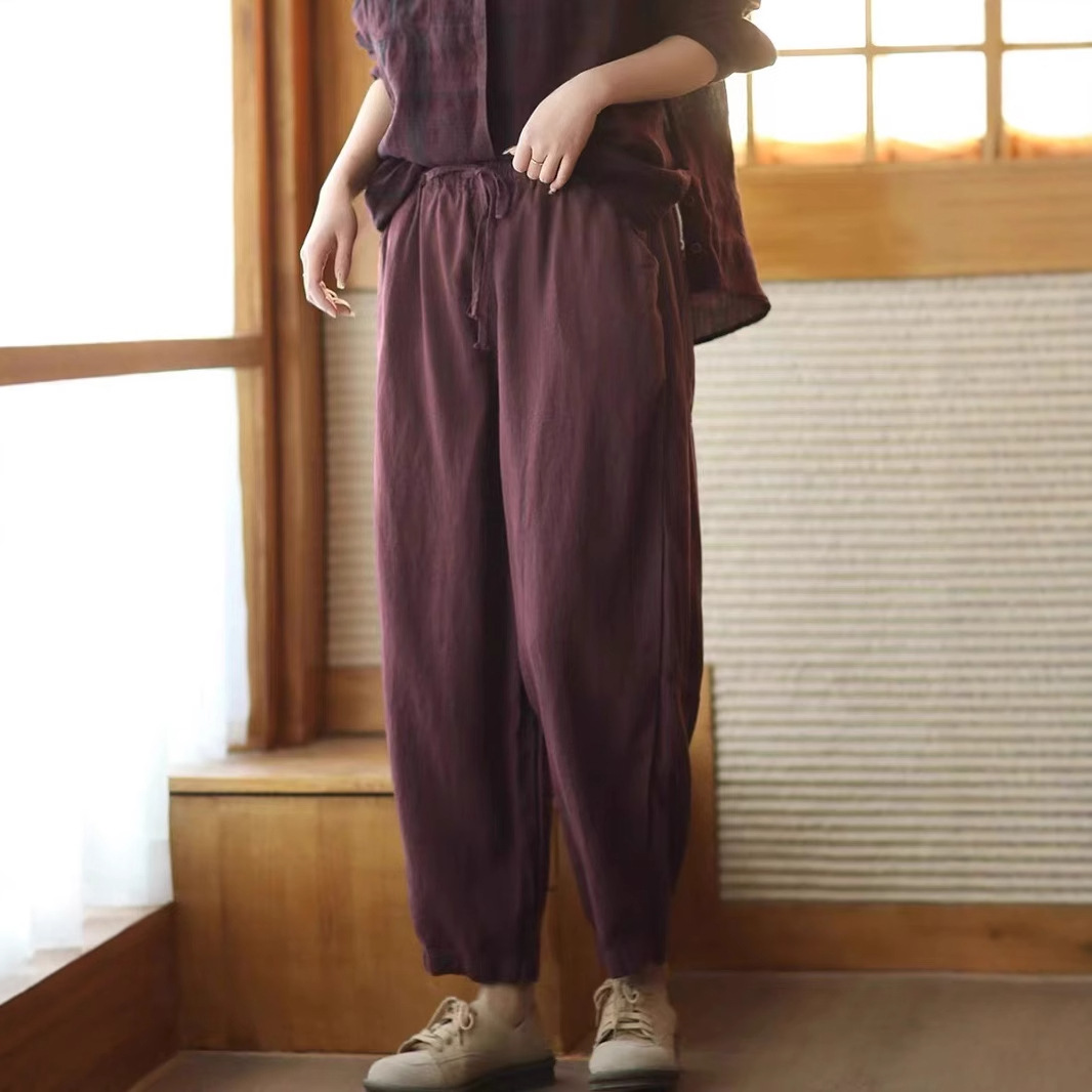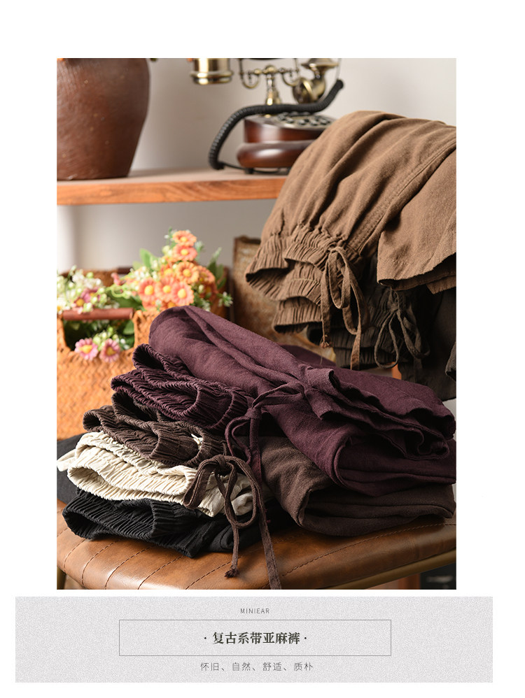 봄 2025 중공업 모래 세척 리넨 할란 바지 여성 레이스 업 느슨한 허리 슬리밍 캐주얼 바지 예술적 느슨한 린넨 바지