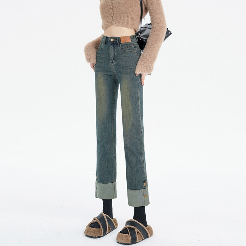 다리 디자인 바느질 작은 스트레이트 레트로 스트레치 틈새 가죽 라벨 높은 허리 슬림 핏 연기 튜브 데님 자른 바지 어린이