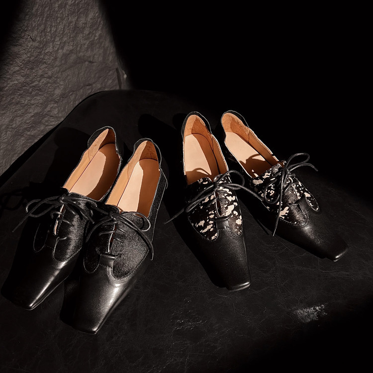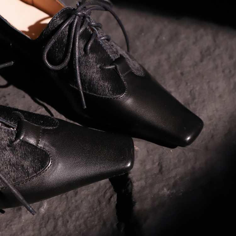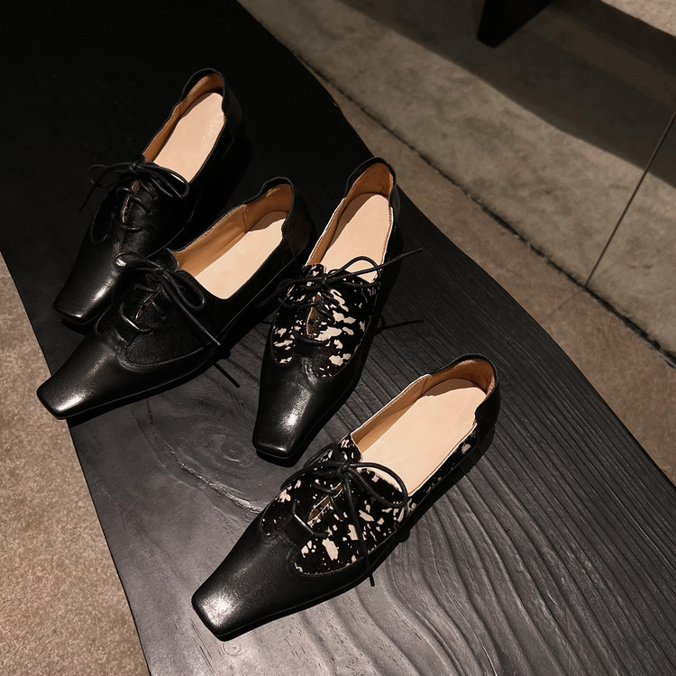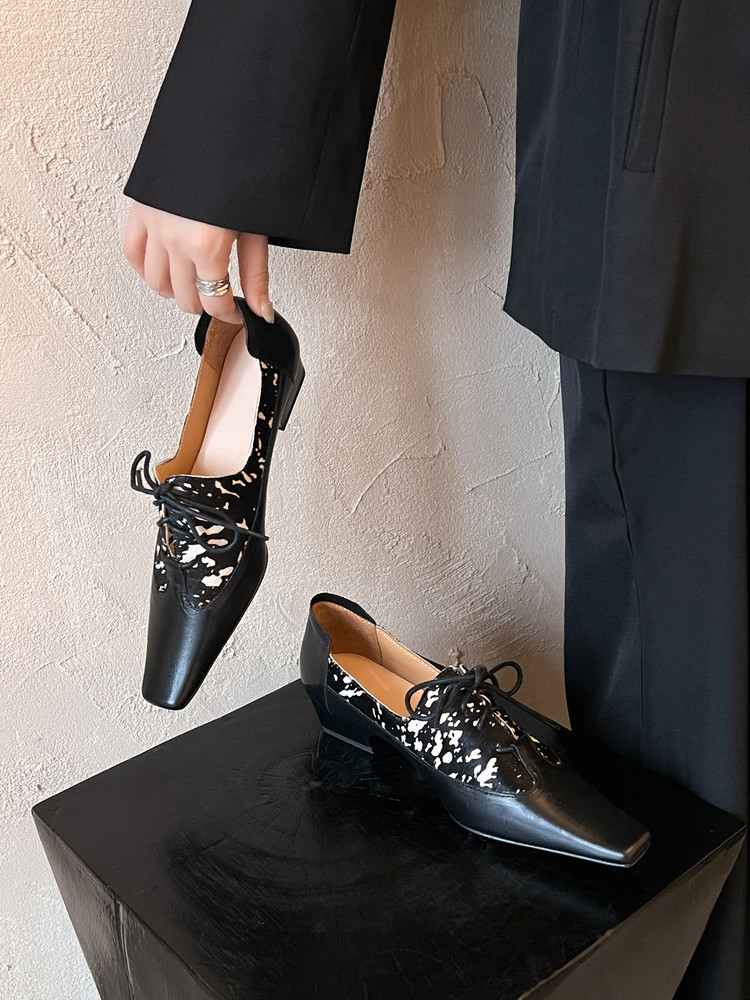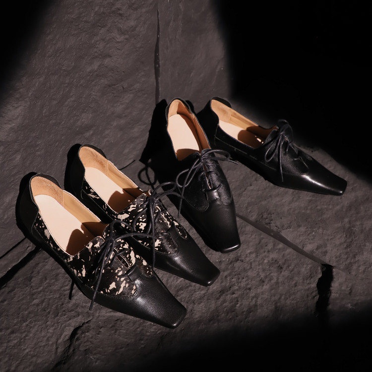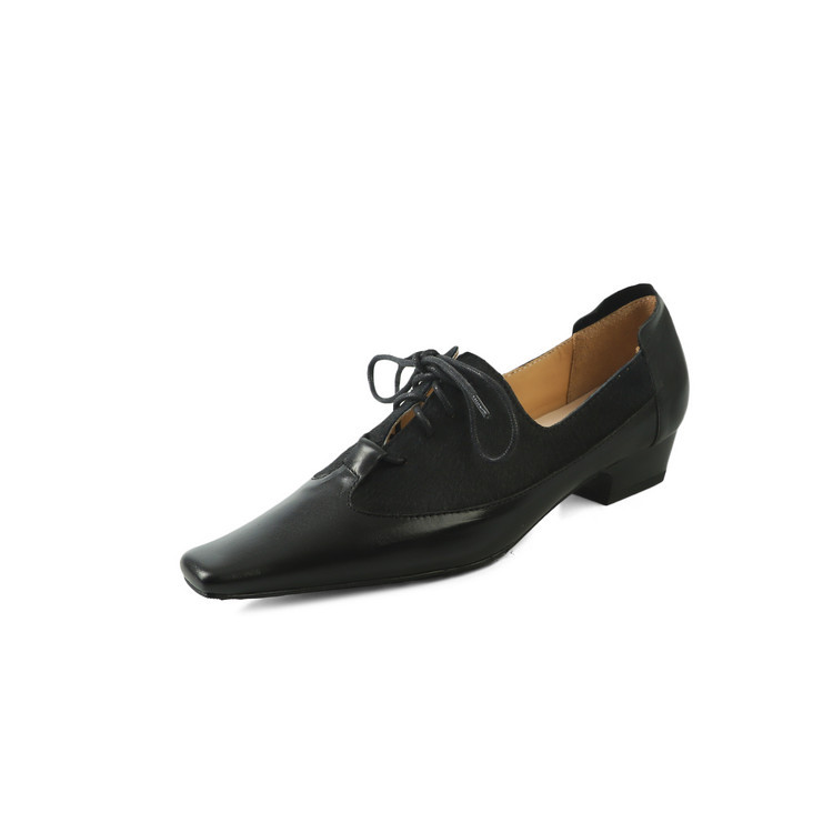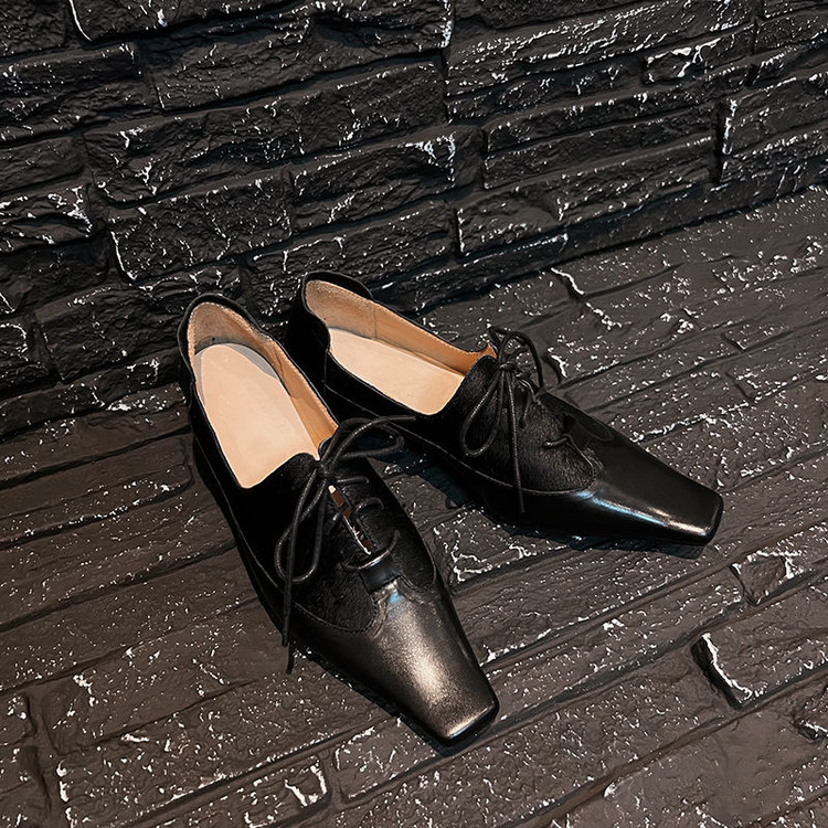타이어 Cowhide 말 머리 작은 가죽 신발 여성용 깊은 입 싱글 레이어 신발 이른 봄 새 레이스 업 스퀘어 토트로 두꺼운 미드 힐 신발 여성용 싱글 레이어 신발
