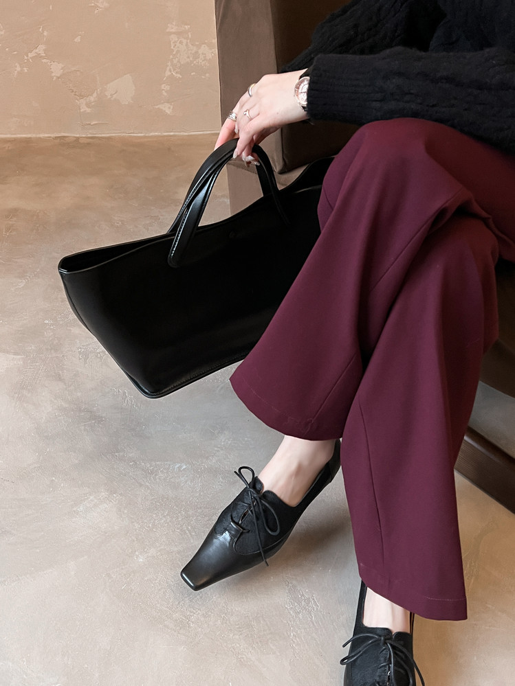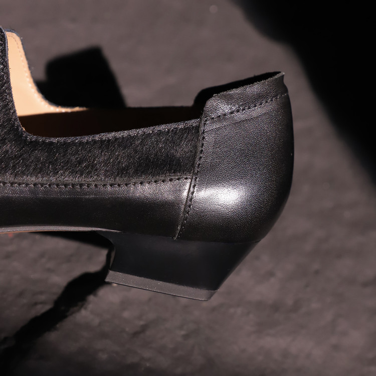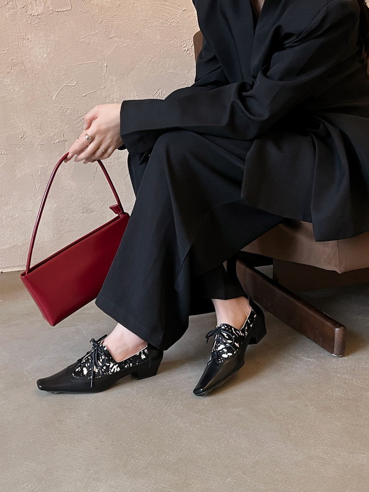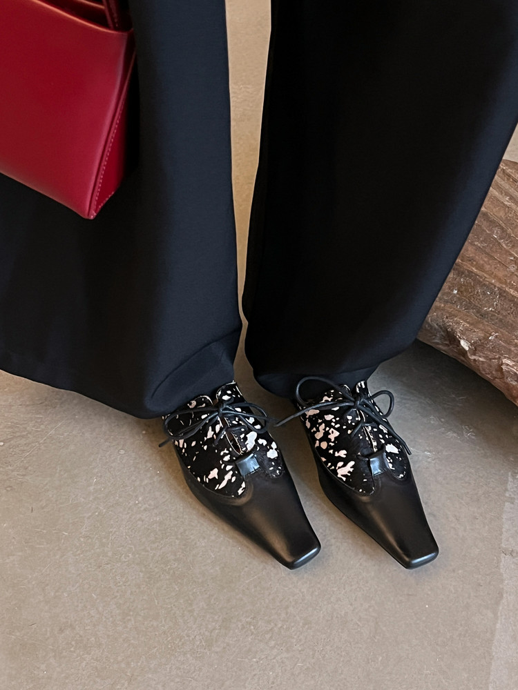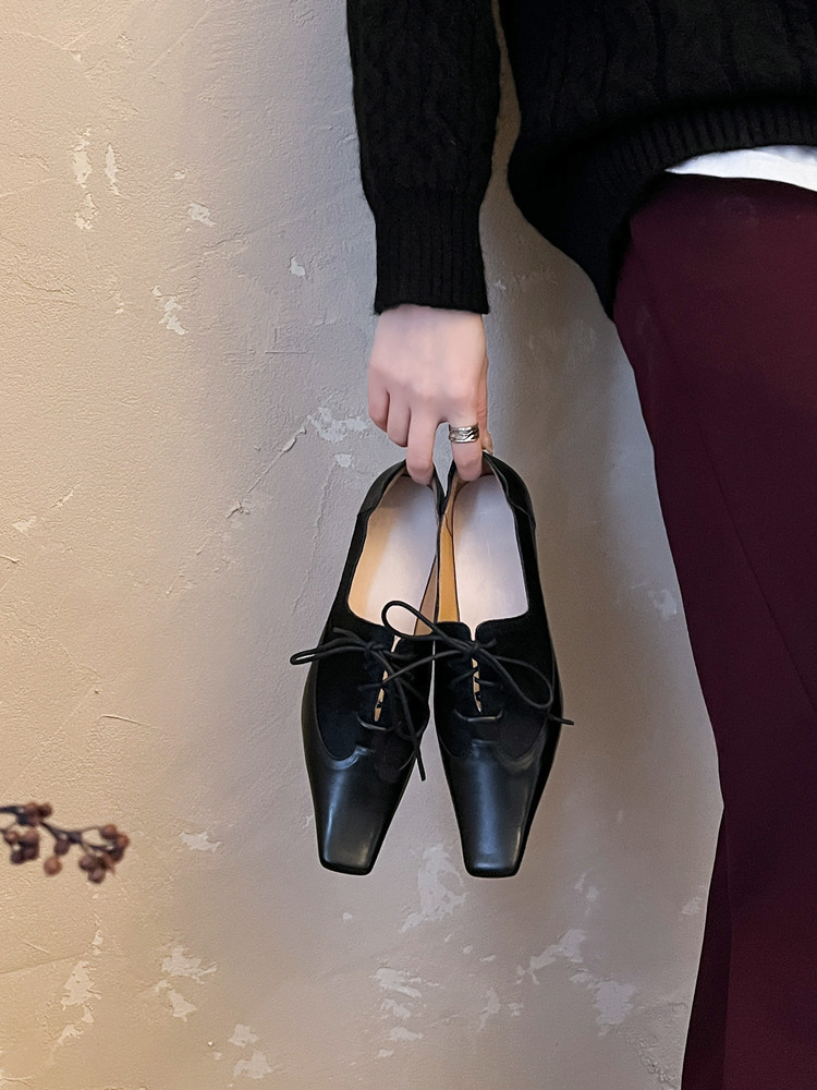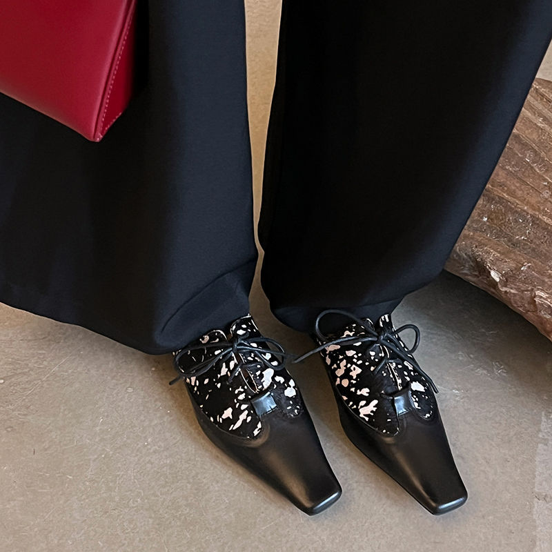타이어 Cowhide 말 머리 작은 가죽 신발 여성용 깊은 입 싱글 레이어 신발 이른 봄 새 레이스 업 스퀘어 토트로 두꺼운 미드 힐 신발 여성용 싱글 레이어 신발