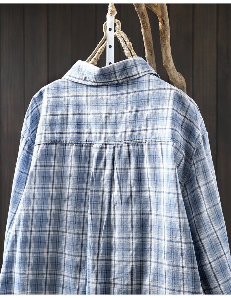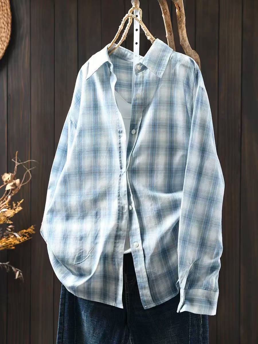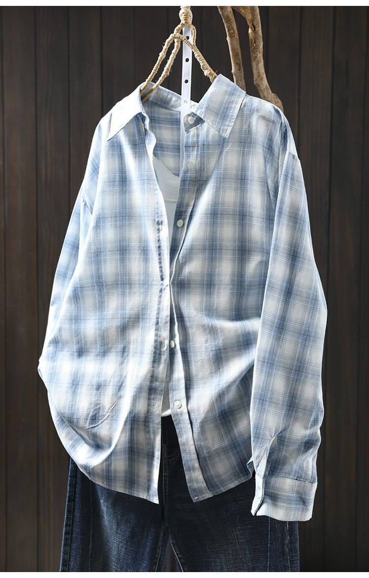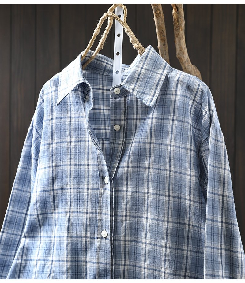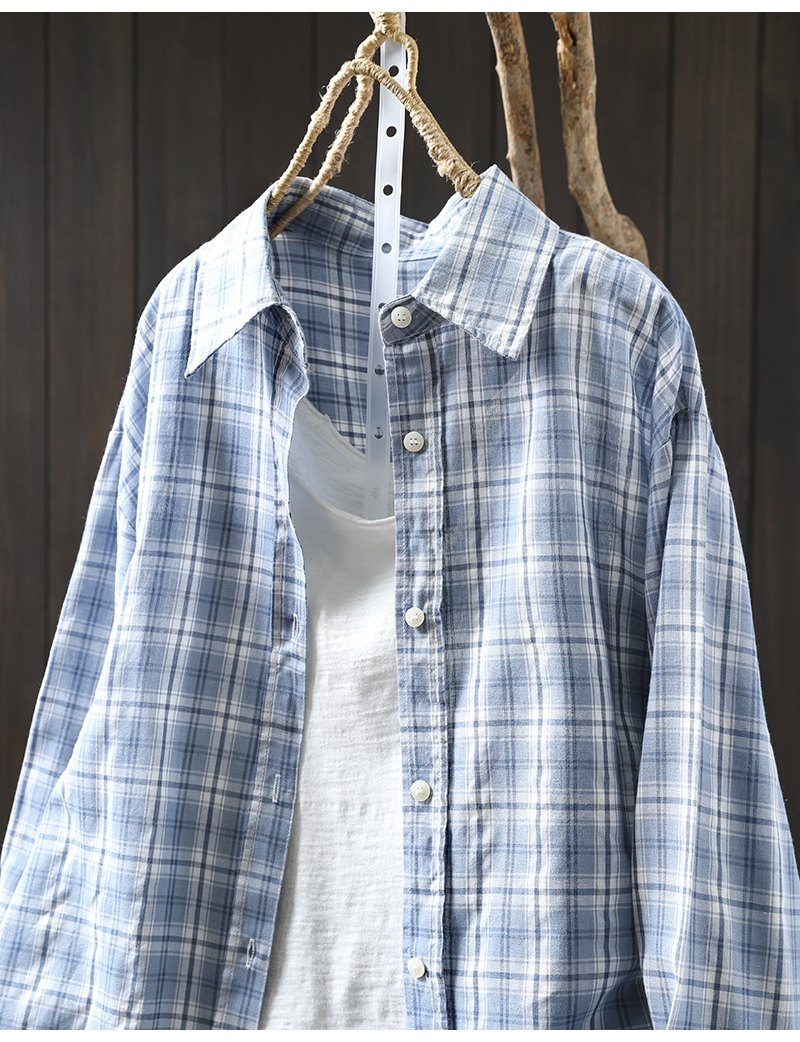 봄 새로운 면 블루 격자 무늬 셔츠 여성용 홍콩 스타일 얇은 셔츠 탑 3605